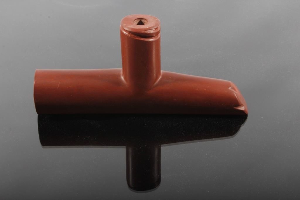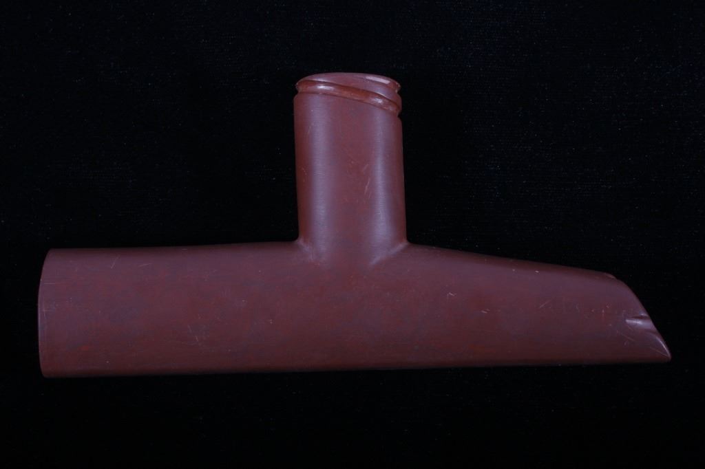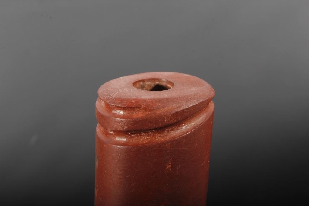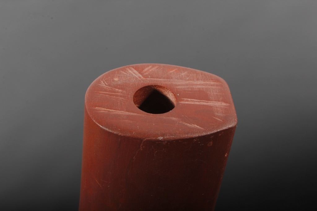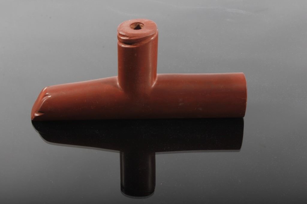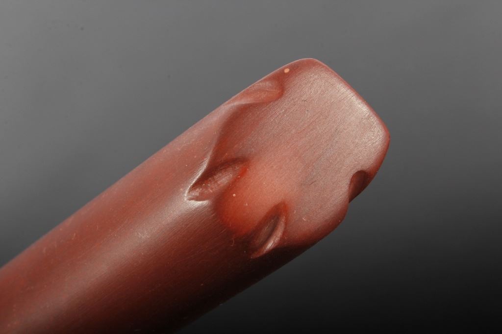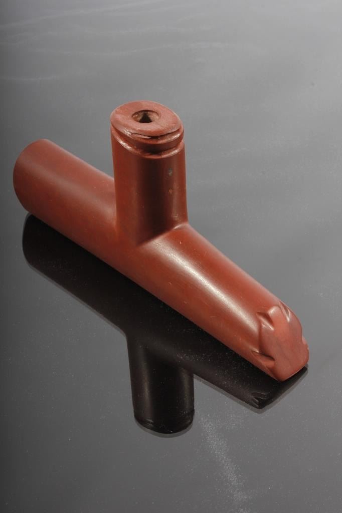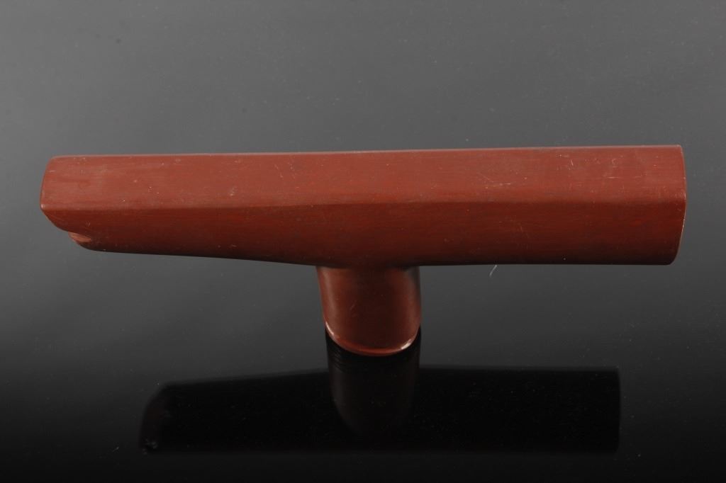 This is a hand carved pipestone catlinite "T" pipe from the Northern Plains Native American Indians. The piece shows a unique diagonally angled ridge near the bowl opening and and slant cut end with four file cut notches. The 20th century piece shows good condition and measures 6.25"L x 3"H x 1"W.