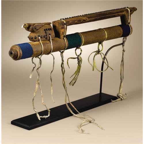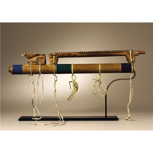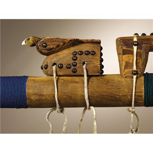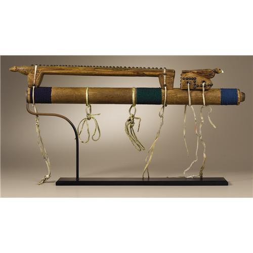 <B>Northern Plains Courting Flute</B></I><BR>Circa 1880<BR>Length 25 1/4 in.<BR><BR>The flute is made of red cedar, the pith removed. The flute is remarkable for its elaborate superstructure. An avian figure serves as the stop and an elongated quadruped straddles the six flute holes. Brass upholstery tacks decorate both figures.<BR>Courting flutes were used by young men to serenade their sweethearts. Many stories are told of love calls played at night from the edge of camp to arrange a rendezvous. The carved figures may represent animals or birds whose behavior was interpreted in amorous or erotic terms. (For related examples see: Conn, Richard; <I>Native American Art in the Denver Art Museum,</B></I> Denver Art Museum, 1979, p. 136; Vincent, Brydon, Coe (Eds.), <I>Art of the North American Indians: The Thaw Collection,</B></I> New York State Historical Association, Fenimore Art Museum, 2000, p. 143; and Hail, Barbara, <I>Hau, Kóla,</B></I> Haffenreffer Museum of Anthropology, Brown University, Providence, 1980, p. 184.)<BR><BR>Provenance<BR>Collected by Charles Henry Parker in Montana during the 1890's. Descended in the family to Mrs. Virginia Ward Golding, Pontiac, Michigan, 1979. Chandler-Pohrt Collection. Morning Star Gallery, Santa Fe, New Mexico.<BR><BR> <BR><BR><B>Important notice:</