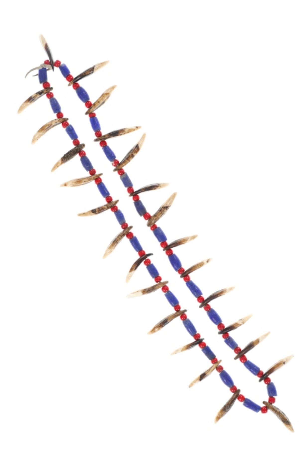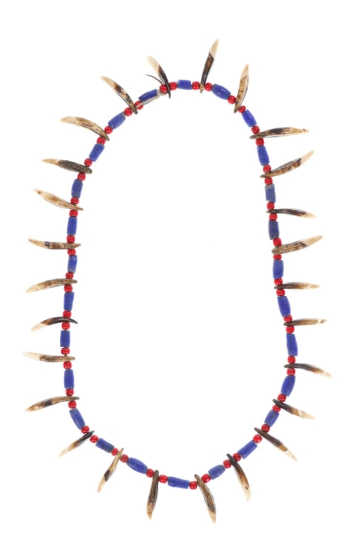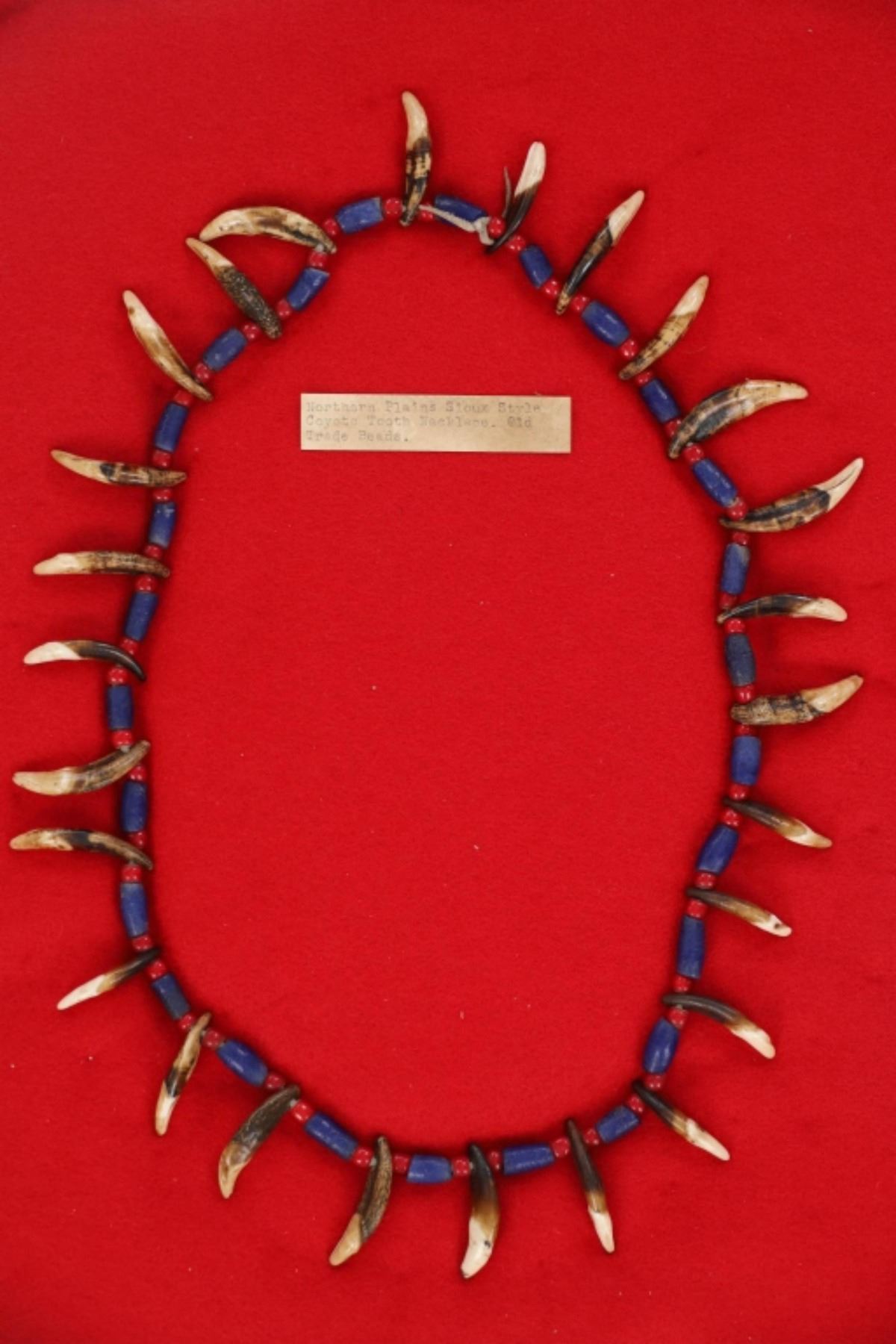 Featured in this lot is a Sioux-Style Northern Plains Coyote Teeth & Glass Trade Bead Necklace, circa late 1800s - early 1900s. Necklace features leather strung Hudson's Bay White Heart Red glass beads and Russian cobalt barrel beads separating 26 Coyote teeth. The coyote is one of the most well-known symbols in Native American culture, representing a creator god, a spirit, and a significant ancestor. To wear a coyote symbol is to encourage one's own intelligence and craftiness. Also known as "Cornaline D'Allepo" beads, Hudson's Bay white heart beads were traded extensively throughout North America from the earliest times. Blue Russians is the name given to the beautiful Cobalt Blue, hand faceted, tubular glass trade beads originally traded by the Russians to the Alaska Natives in exchange for Sea Otter pelts or anything else they might want. The beads were a desirable form of currency, similar to the Wampum of the far north and were also traded in Canada and the Great Lakes region. This impressive necklace is a wonderful example of the artistry of the Northern Plains Native American peoples. The necklace is displayed in a Ryker glass case on a felt backing. The condition of this necklace is good with with no obvious signs of damage and shows good overall condition. The measurements of this necklace from end to end is 14", circumference is 29". Ryker case measures 12.25"W x 16.25"L x .75"D, weight is 2lb.