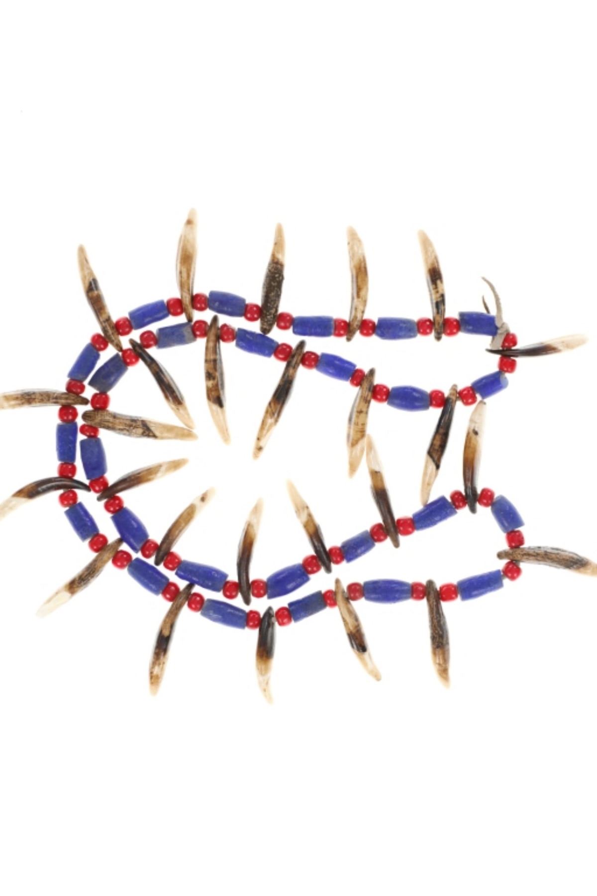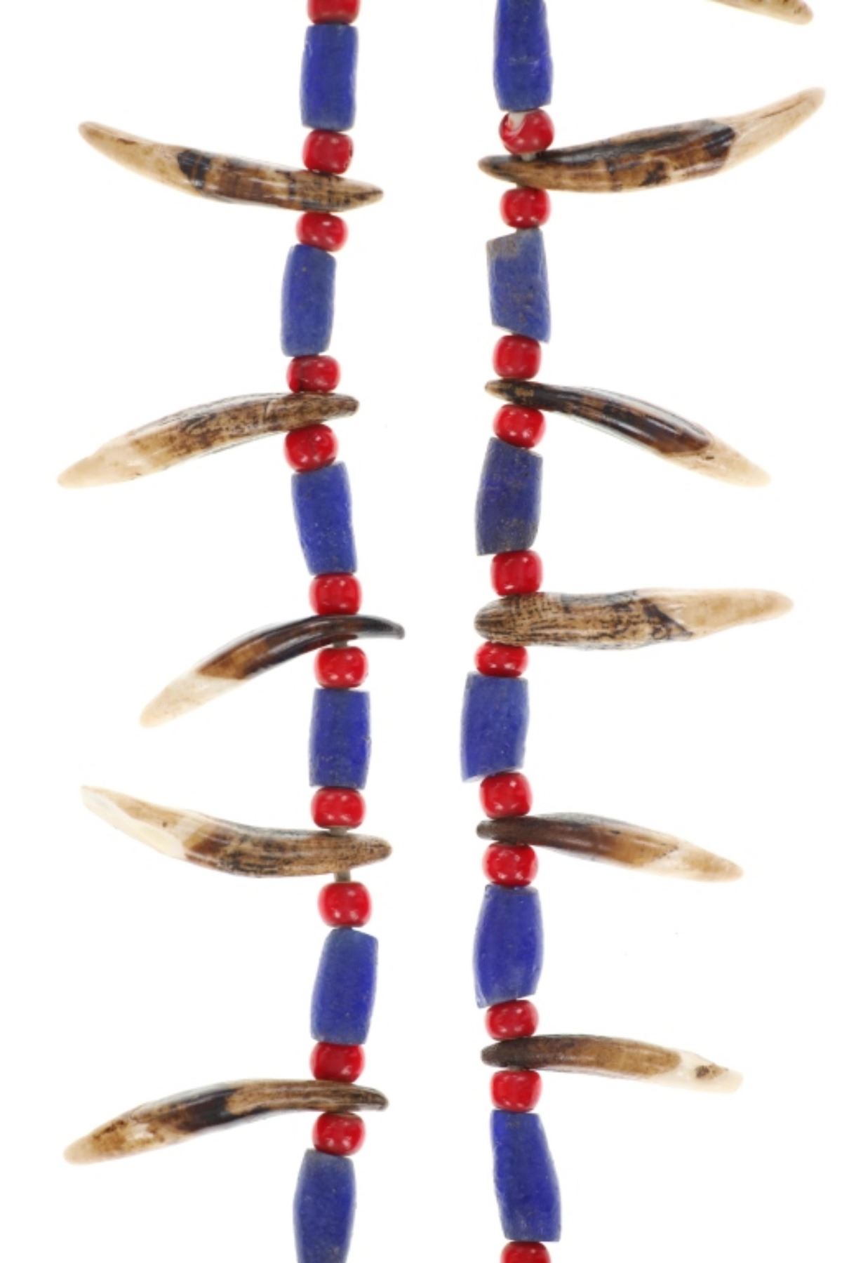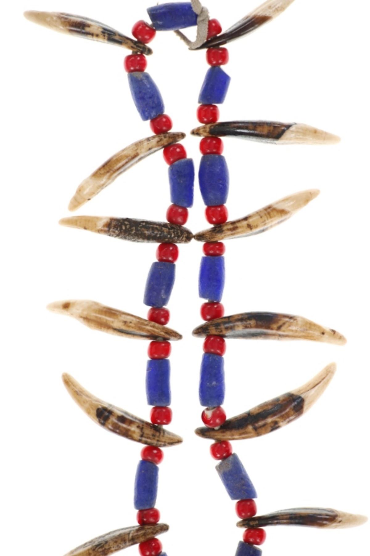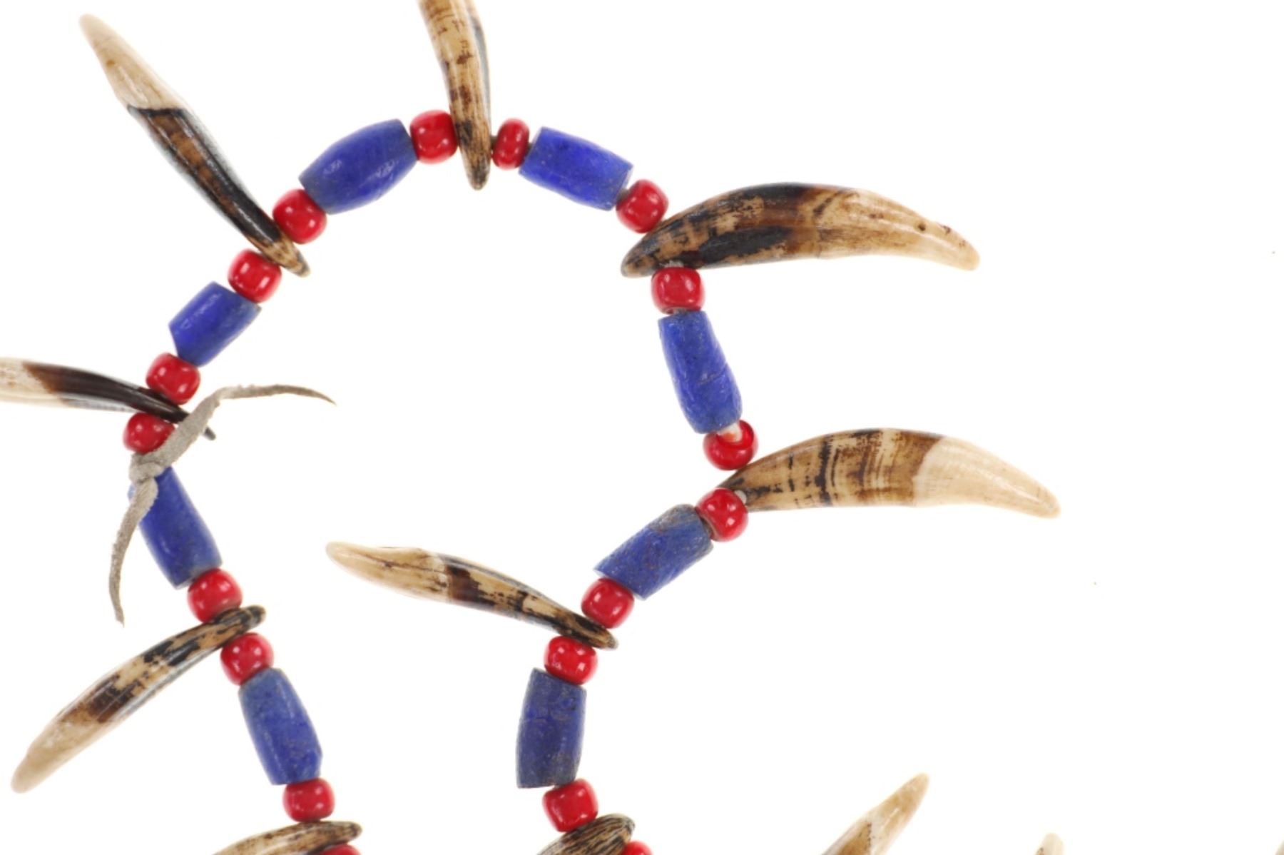 Featured in this lot is a Sioux-Style Northern Plains Coyote Teeth & Glass Trade Bead Necklace, circa late 1800s - early 1900s. Necklace features leather strung Hudson's Bay White Heart Red glass beads and Russian cobalt barrel beads separating 26 Coyote teeth. The coyote is one of the most well-known symbols in Native American culture, representing a creator god, a spirit, and a significant ancestor. To wear a coyote symbol is to encourage one's own intelligence and craftiness. Also known as "Cornaline D'Allepo" beads, Hudson's Bay white heart beads were traded extensively throughout North America from the earliest times. Blue Russians is the name given to the beautiful Cobalt Blue, hand faceted, tubular glass trade beads originally traded by the Russians to the Alaska Natives in exchange for Sea Otter pelts or anything else they might want. The beads were a desirable form of currency, similar to the Wampum of the far north and were also traded in Canada and the Great Lakes region. This impressive necklace is a wonderful example of the artistry of the Northern Plains Native American peoples. The necklace is displayed in a Ryker glass case on a felt backing. The condition of this necklace is good with with no obvious signs of damage and shows good overall condition. The measurements of this necklace from end to end is 14", circumference is 29". Ryker case measures 12.25"W x 16.25"L x .75"D, weight is 2lb.