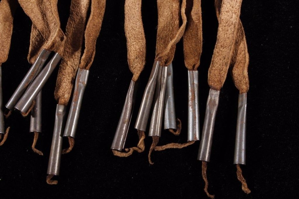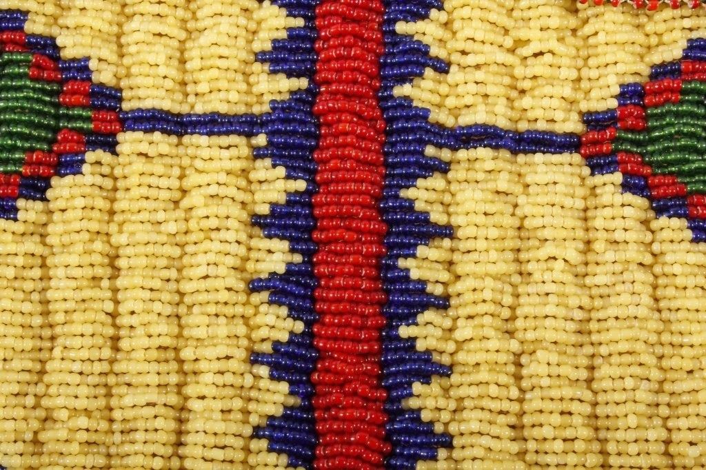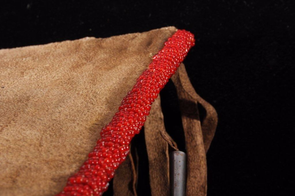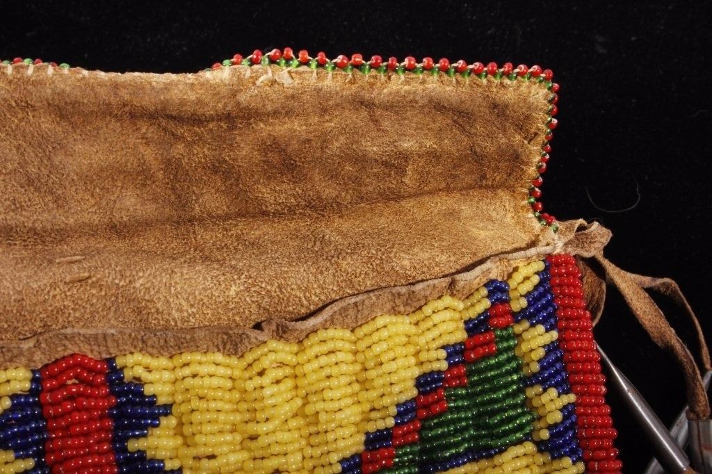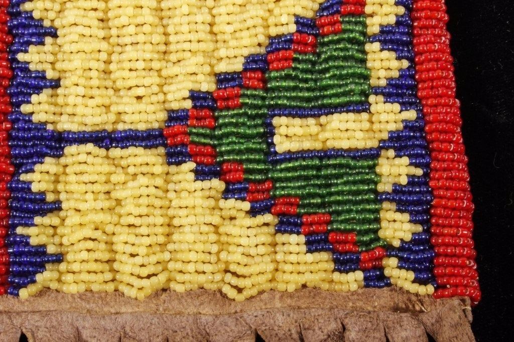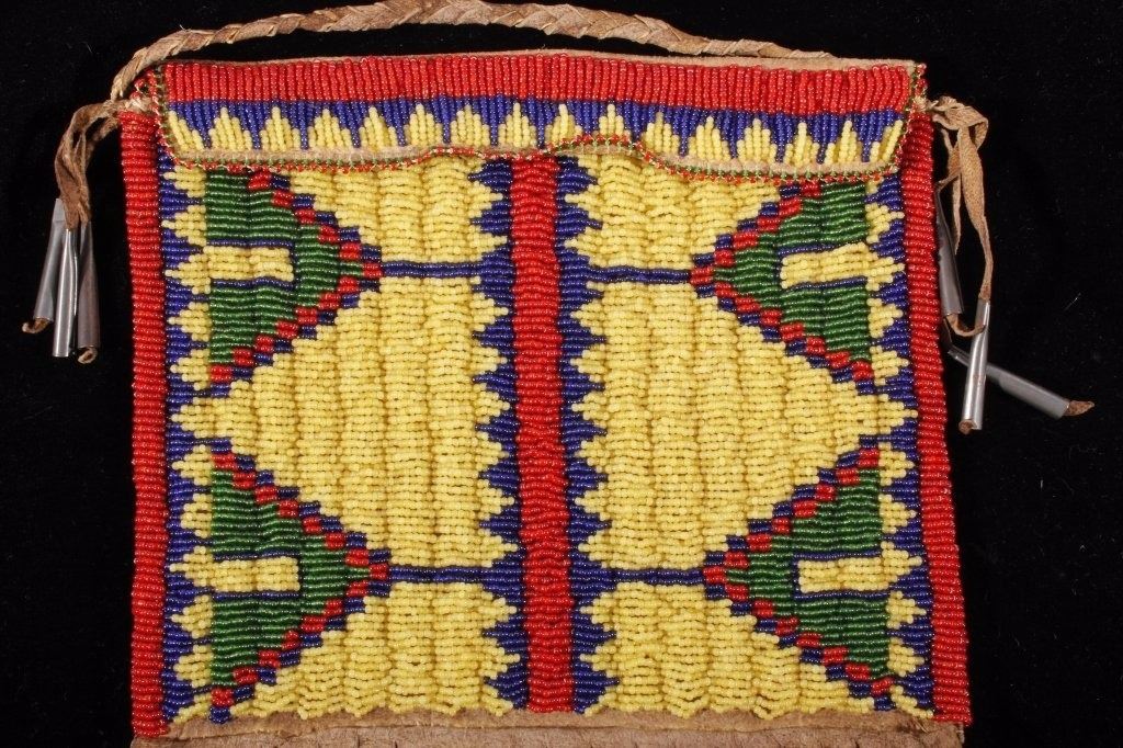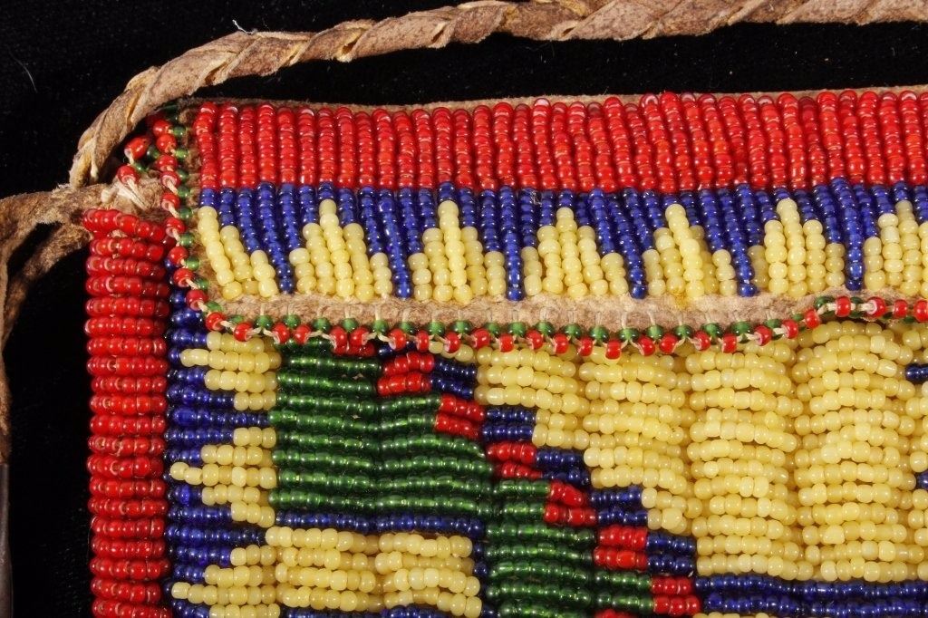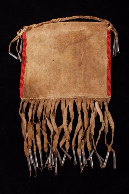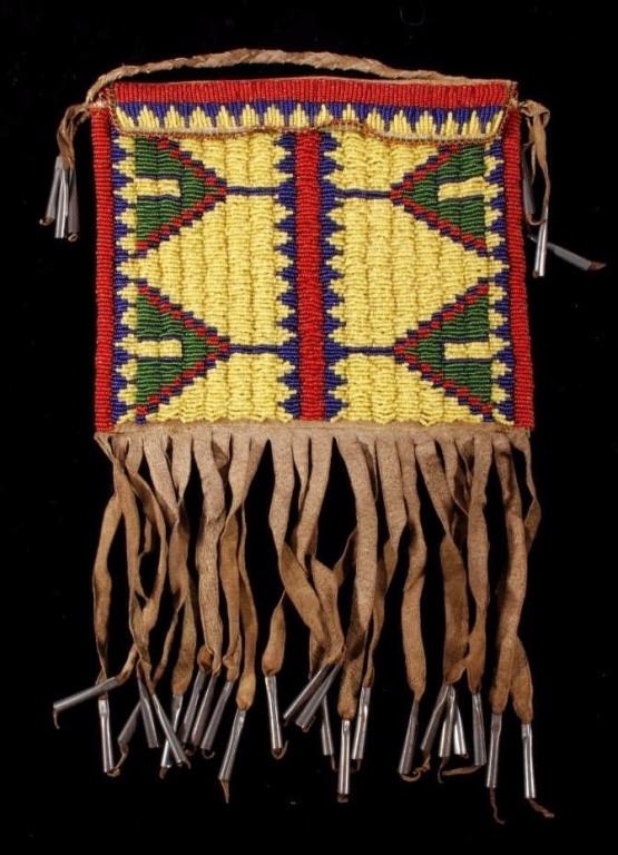 The lot features an excellent Northern Plains Native American Indian beaded document flat bag. The piece shows a wonderful fully beaded front with exquisite19th century glass trade seed beads in greasy yellow, Hudson Bay red white hearts, semi-transparent green, semi-transparent dark blue. The piece has a Indian tanned hide construction with braided rawhide top strap and long cut fringe having tin jingle cones. The piece displays very well and is truly a museum quality artifact. Measures overall 7 7/8" W x 14" L. Exact age and origin is unknown.