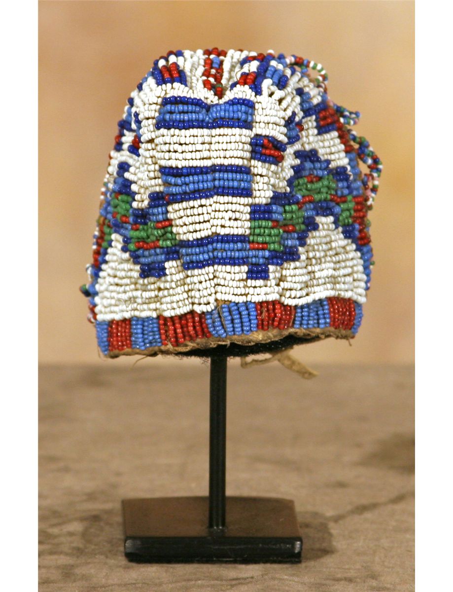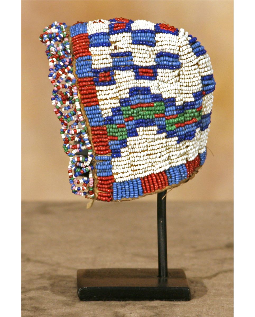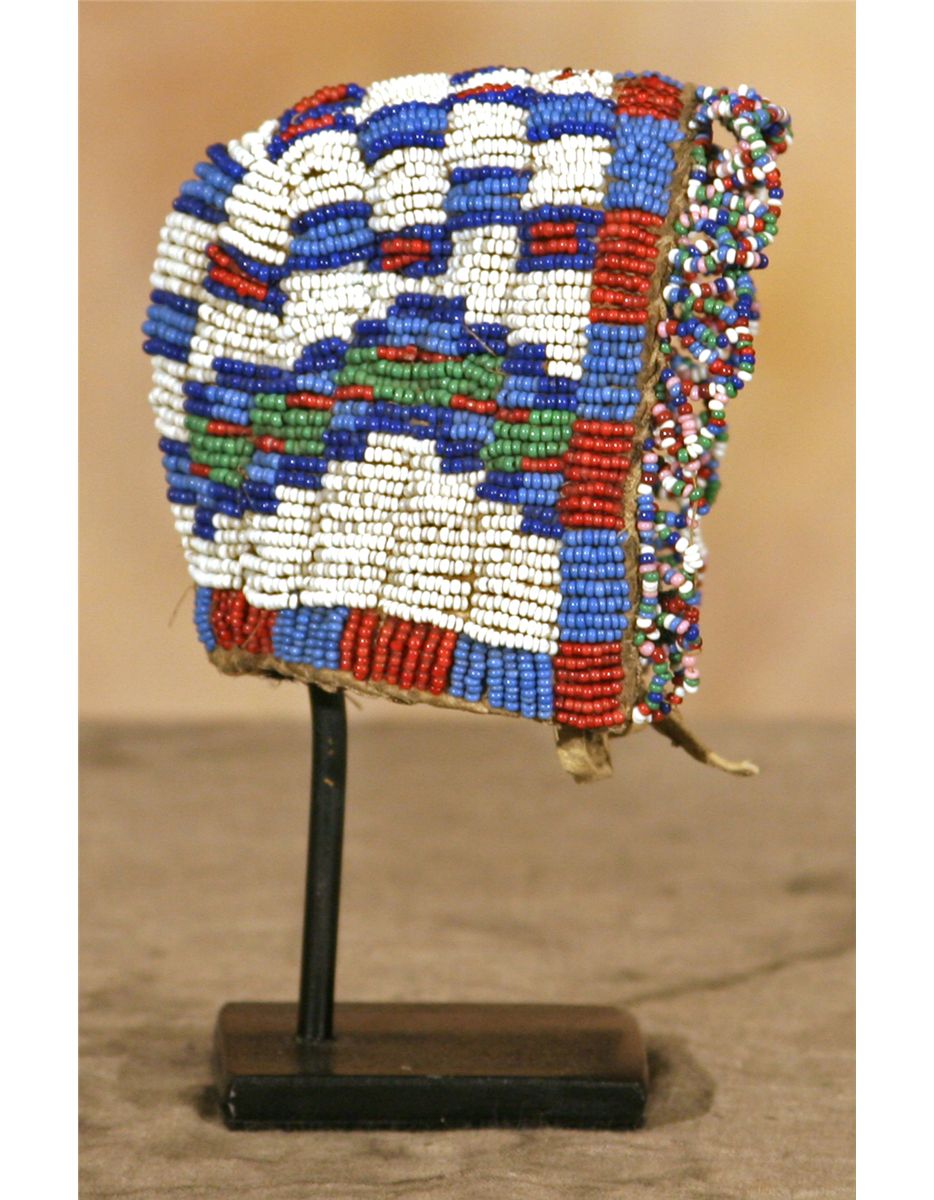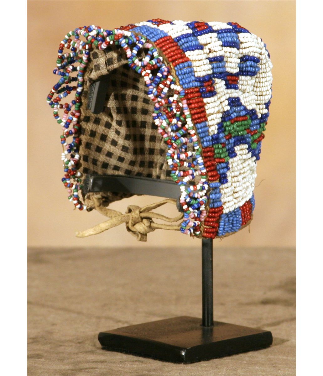 Northern Plains Doll Bonnet. 3.5" x 3.5". Fully beaded and edged with beaded loops. Lined with trade cloth. Includes custom stand. Circa 1890.