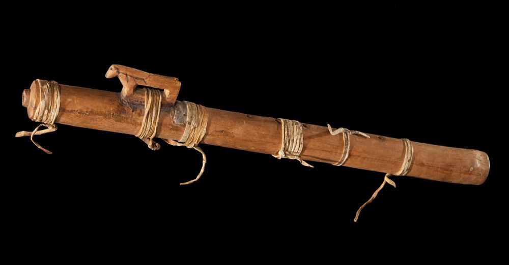 Northern Plains Flute. Carved wood flute with 3 1/4" x 1 1/2" animal effigy slide, brain tanned wrappings. Circa 1900, 22 1/2" long x 1 3/4" diameter.