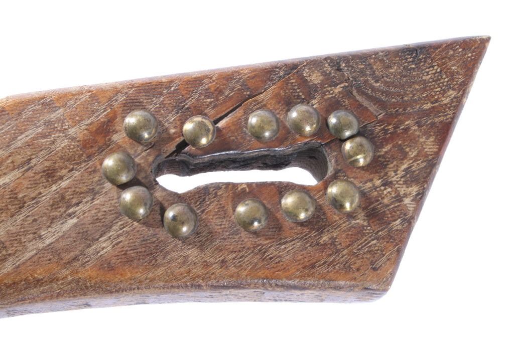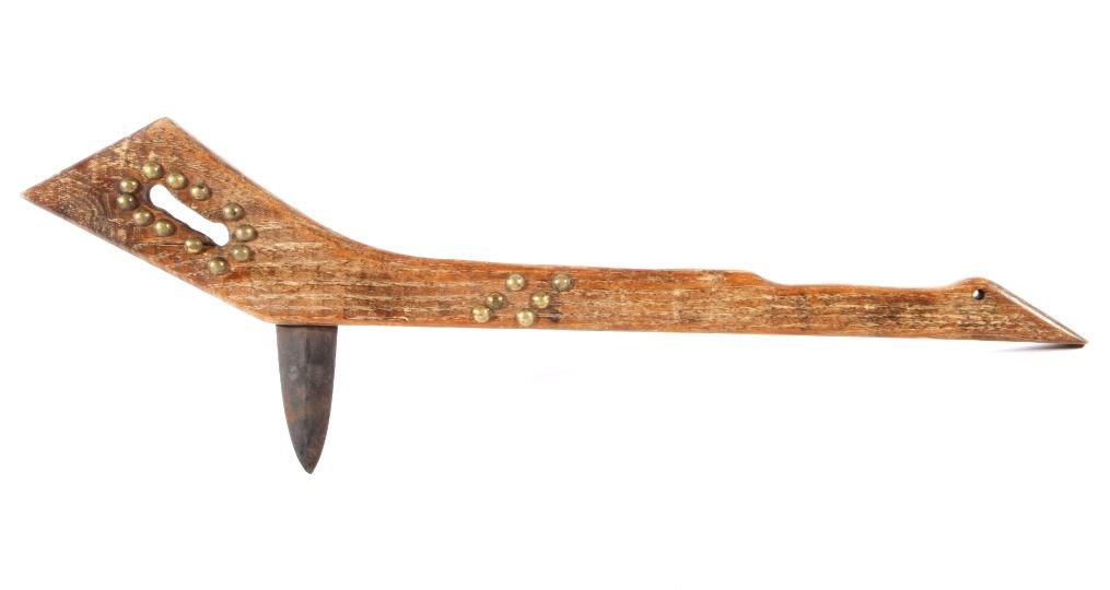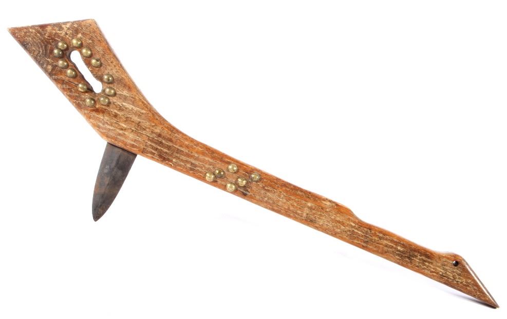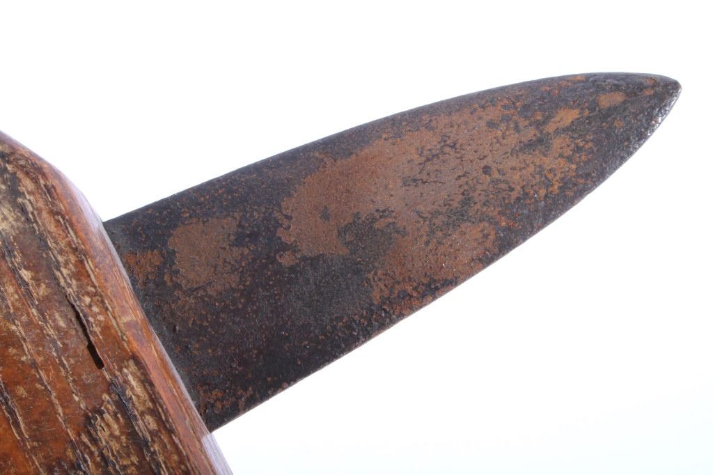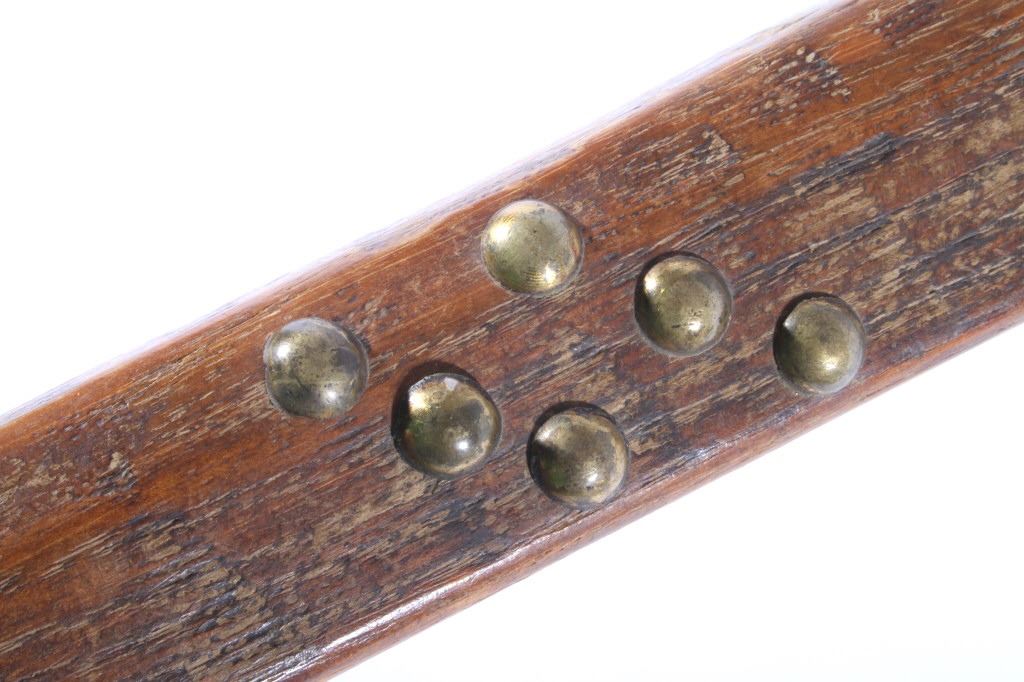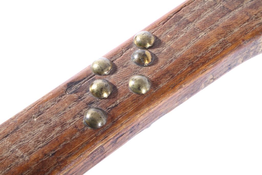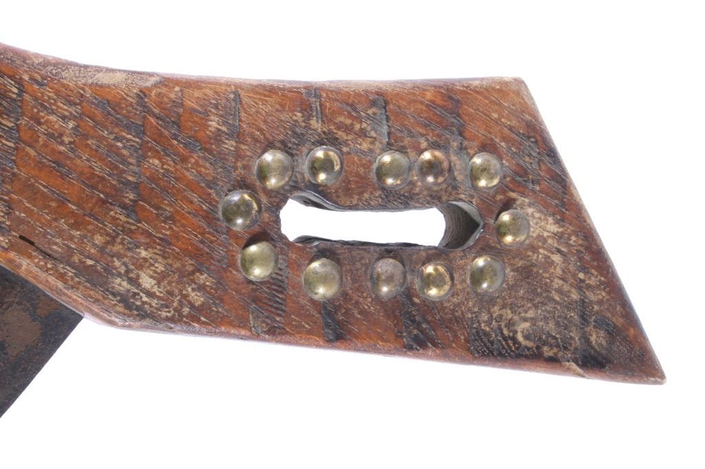 This is a Northern Plains Native American Indian Gunstock War Club with an immensely rare spontoon blade and is from the 19th Century. The war club or warriors club shows the Revolutionary War (1775-1783) Colonial American Spontoon style blade (the hand forged spike head was used during the Revolutionary War by the Americans in trench defense against charging British infantry or cavalry). The war club has a wood Gunstock handle with excellent trade brass tack accents and has a hand hewn carved style. The piece is from the 19th Century and shows very well preserved museum quality good condition. Provenance: The piece is from a large Native American Indian artifact private collection in Saskatchewan, Canada and was purchased in Canada. Measures 23 5/8”L x 8”W with a 3.25”L x 1 3/8”W spontoon blade.