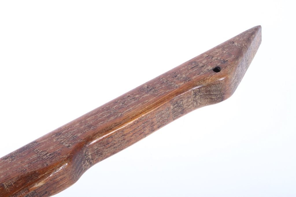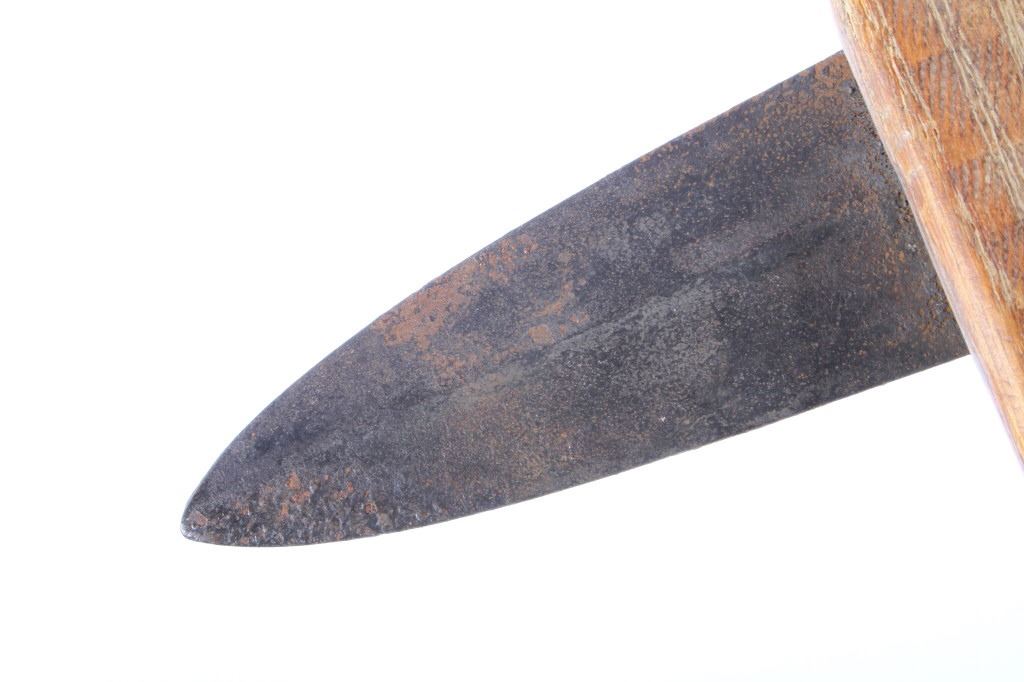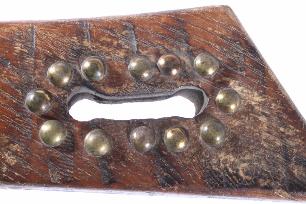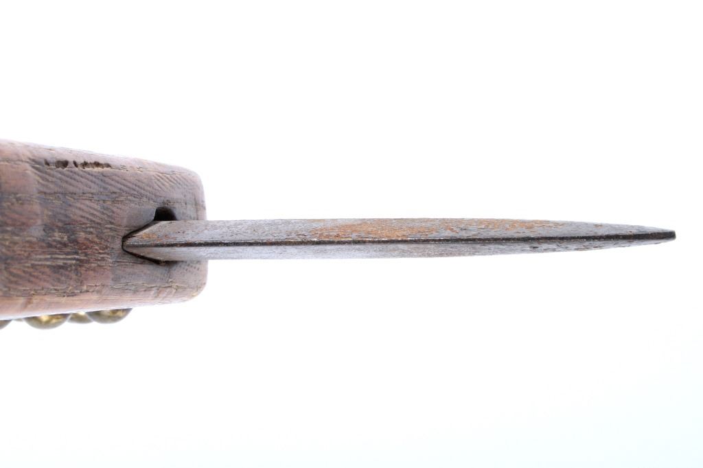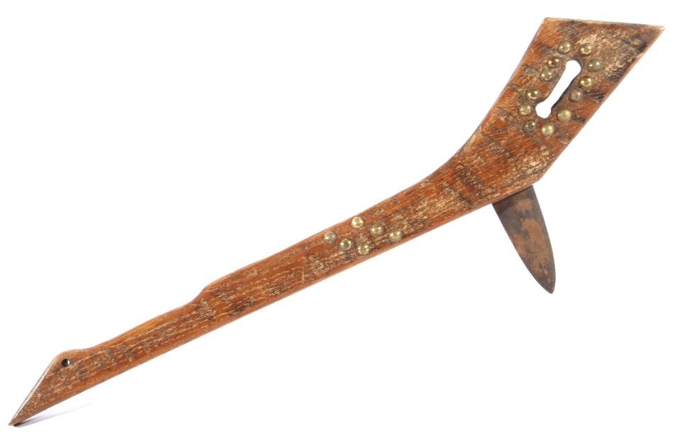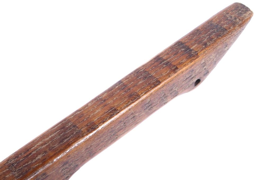 This is a Northern Plains Native American Indian Gunstock War Club with an immensely rare spontoon blade and is from the 19th Century. The war club or warriors club shows the Revolutionary War (1775-1783) Colonial American Spontoon style blade (the hand forged spike head was used during the Revolutionary War by the Americans in trench defense against charging British infantry or cavalry). The war club has a wood Gunstock handle with excellent trade brass tack accents and has a hand hewn carved style. The piece is from the 19th Century and shows very well preserved museum quality good condition. Provenance: The piece is from a large Native American Indian artifact private collection in Saskatchewan, Canada and was purchased in Canada. Measures 23 5/8”L x 8”W with a 3.25”L x 1 3/8”W spontoon blade.