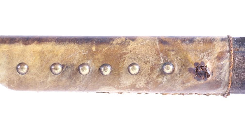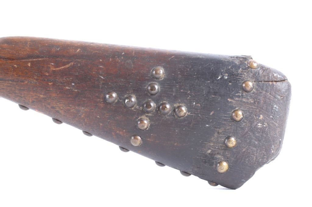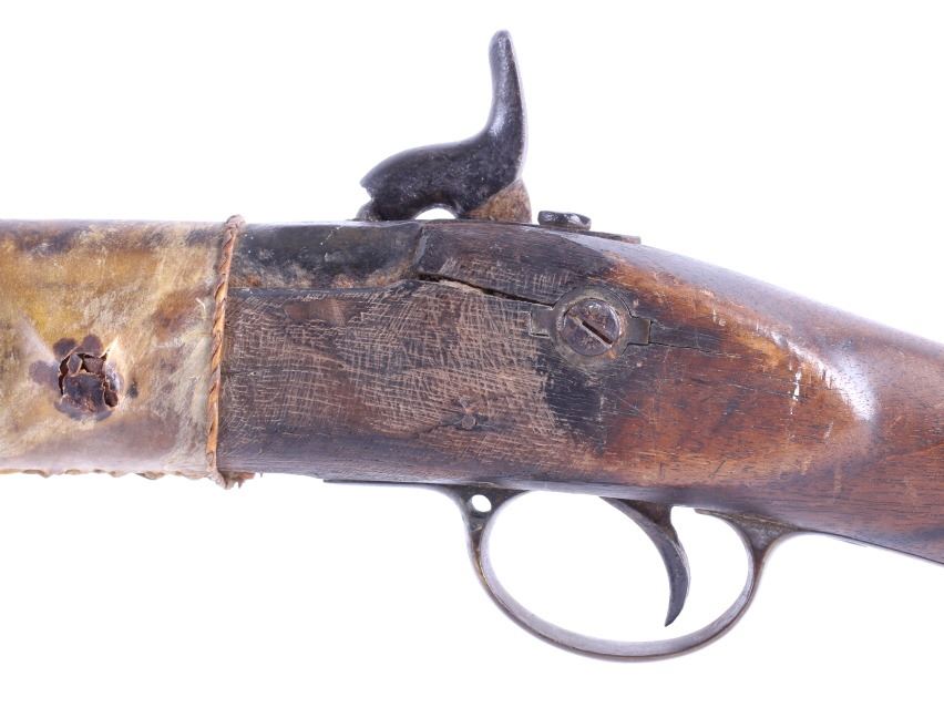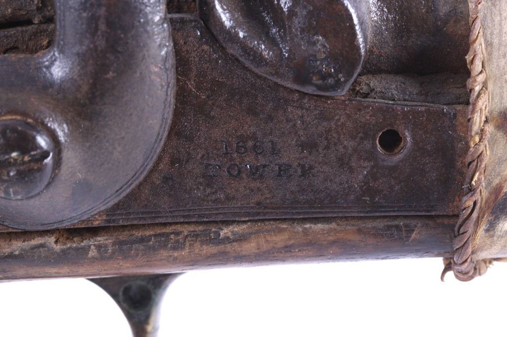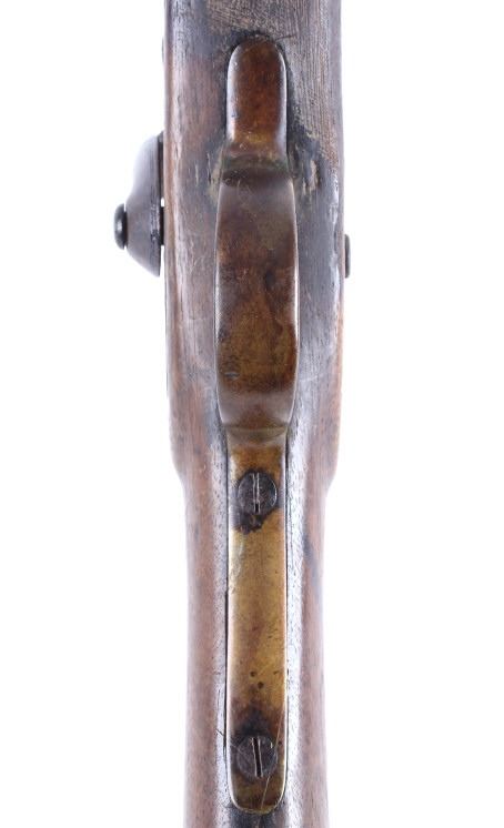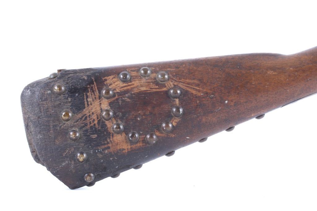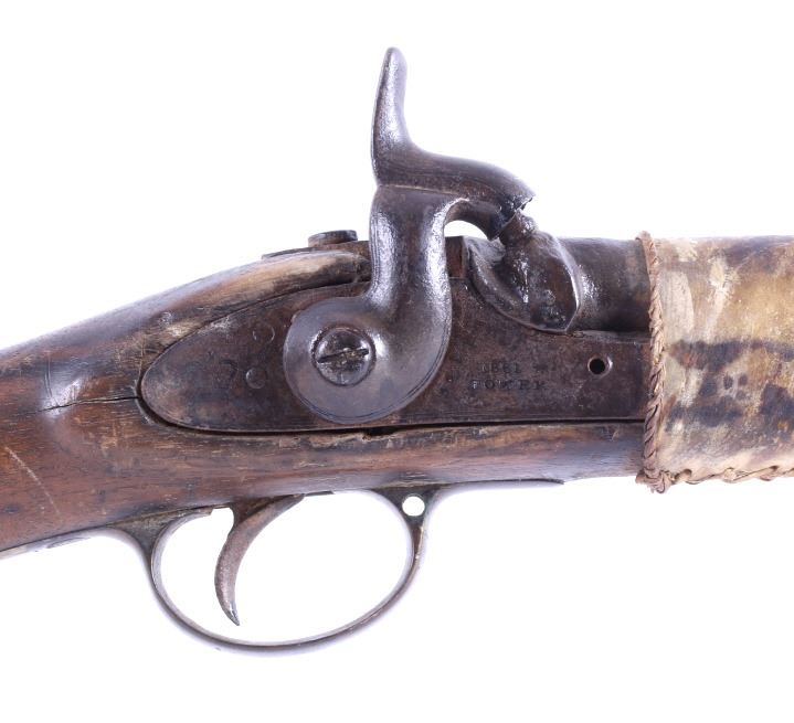 This is an increasingly rare original Northern Plains Native American Indian used 1861 Tower cut-down musket. The Tower British .58 caliber rifled musket was ordered by the thousands and delivered mainly to the Confederacy during the Civil War. This finely made weapon saw wide spread use through the entire conflict. After the war, many of these Tower muskets were retained by the soldiers who were issued them and many of these went West with the thousands of Ex-Confederate soldiers who did not want to remain in the defeated South during Reconstruction. According to the book Arming The West: A Fresh New Look at the Guns that were Actually Carried on the Frontier, “Myth-busting details from the Western shipping records of firearms giant Schuyler, Hartley & Graham, 1868-1886,” by noted arms historian Herbert G. Houze, beginning in 1868 and continuing through the 1870s, many thousand of these British .58 caliber Civil War surplus muskets were shipped to dealers and distributors in the West. They were considered reliable, powerful and accurate arms for economy minded westward pioneers. It also helped that many if not most men going West during this time had military experience and were familiar with the workings of the .58 caliber rifled musket. This extraordinary example shows very heavy, classic Indian usage. The butt stock displays extremely heavy wear and has had its butt plate removed (a small portion of the top part is still screwed into the stock!) in all probability to be better used as a hide scraper. The stock is tack decorated in the classic “sacred circle” design as well as the traditional spiritual “four direction” cross design. The wood shows incredibly heavy wear, weathering and dark age-staining. Aside from the symbolic tack designs on each side of the stock are brass tack line decorations around the rear of the stock and along the bottom edge behind the trigger guard tang. The barrel has been cut back from the original 40 inches to approximately 25” and is secured to the fore stock by a full 21 inch length of thin, stretched rawhide that was applied “green” or wet and un-tanned, allowed to shrink-dry and then beautifully sinew-sewn along the full bottom length with additional fine stitching around each end. This leather shows heavy staining from barrel rust on the top section and in front of the stock where the rawhide was sewn around the barrel. There are also six brass tacks on each side of the fore arm that show dark age-staining around their edges. All brass tacks in the stock are heavily aged brown. The lock plate is marked “Tower” and is dated “1861” with correct crown stamping. The brass trigger guard also shows a heavily aged patina. All exposed steel parts are also a deep aged brown patina. The hammer spring remains intact, but the hammer will not hold full cock. The main use for these shortened big-bore rifles was for mounted buffalo hunting in which Indian hunters galloped their horses into herds of buffalo and then firing at point blank range into the stampeding animals. This important firearm came from an estate collection in Northern Montana where it was said this particular Indian weapon was originally collected locally in 1959. Here is a remarkable musket that has Civil War, Western and finally Indian history all combined into one artifact! The rifle qualifies as an Antique Long Gun, and does not require FFL Transfer or NICS Background Check. Serial Number: NSN.