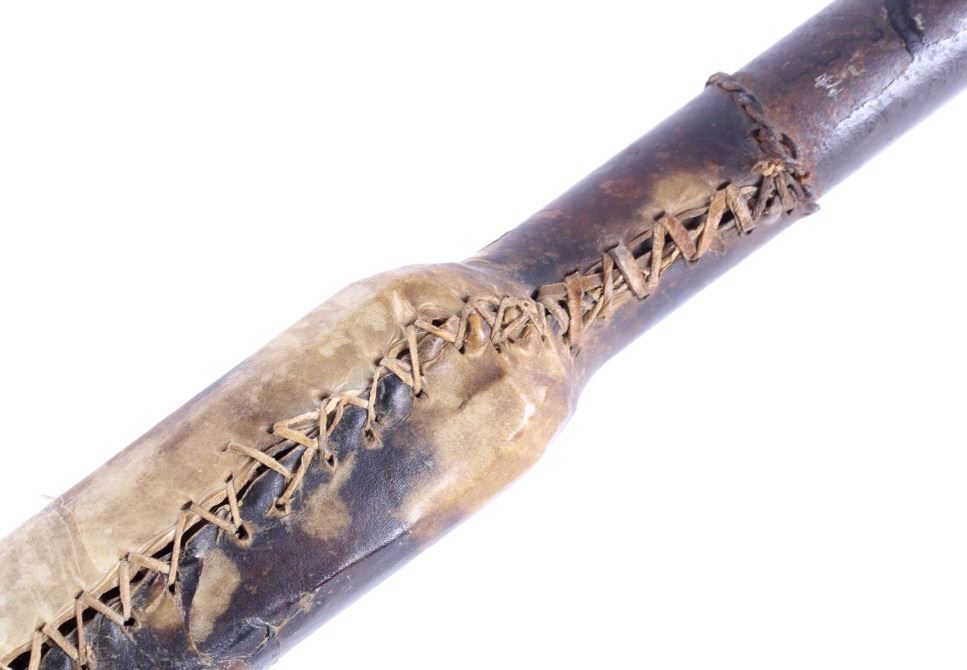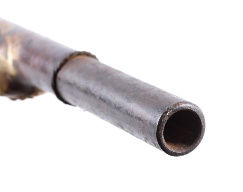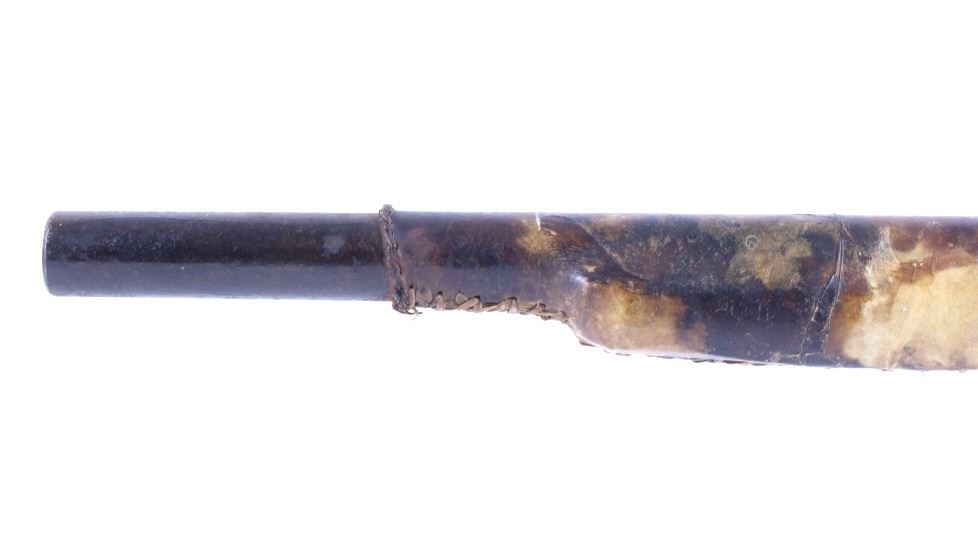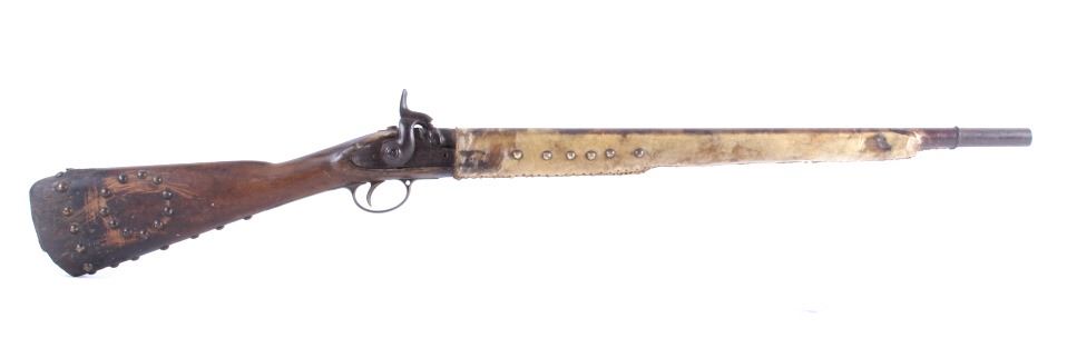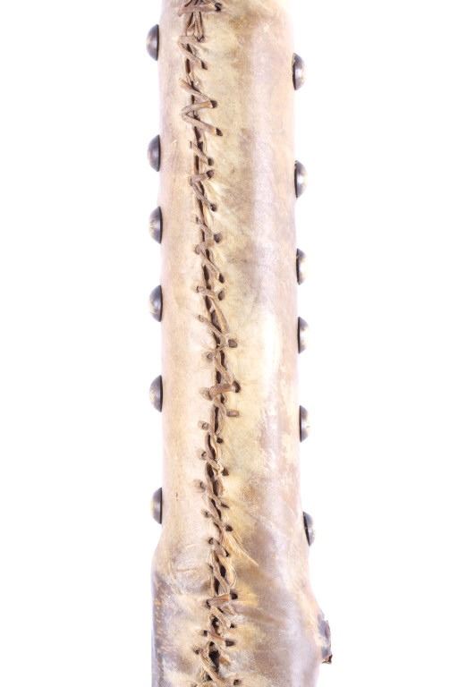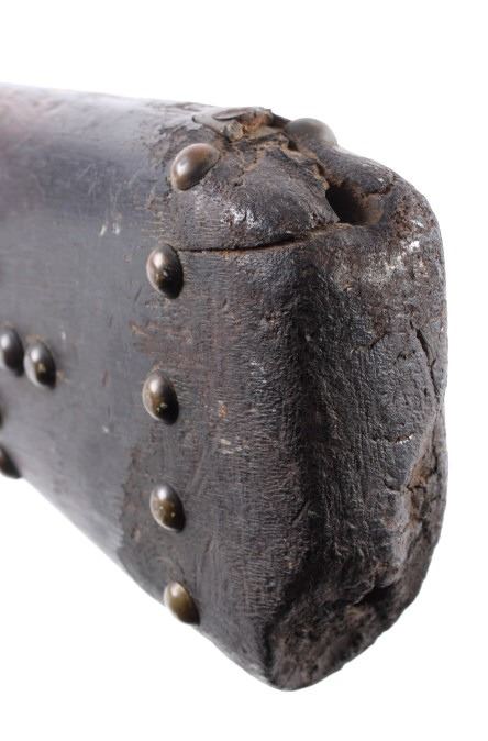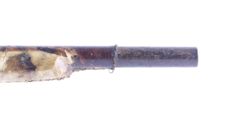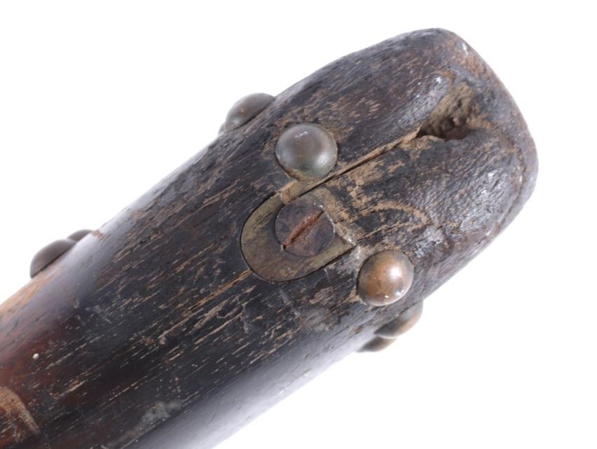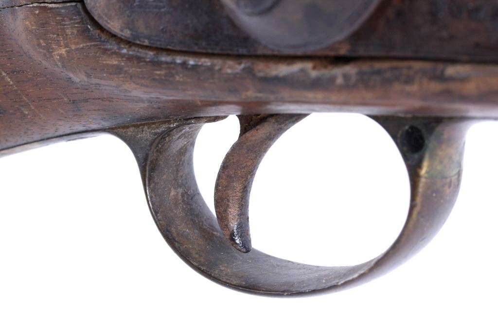 This is an increasingly rare original Northern Plains Native American Indian used 1861 Tower cut-down musket. The Tower British .58 caliber rifled musket was ordered by the thousands and delivered mainly to the Confederacy during the Civil War. This finely made weapon saw wide spread use through the entire conflict. After the war, many of these Tower muskets were retained by the soldiers who were issued them and many of these went West with the thousands of Ex-Confederate soldiers who did not want to remain in the defeated South during Reconstruction. According to the book Arming The West: A Fresh New Look at the Guns that were Actually Carried on the Frontier, “Myth-busting details from the Western shipping records of firearms giant Schuyler, Hartley & Graham, 1868-1886,” by noted arms historian Herbert G. Houze, beginning in 1868 and continuing through the 1870s, many thousand of these British .58 caliber Civil War surplus muskets were shipped to dealers and distributors in the West. They were considered reliable, powerful and accurate arms for economy minded westward pioneers. It also helped that many if not most men going West during this time had military experience and were familiar with the workings of the .58 caliber rifled musket. This extraordinary example shows very heavy, classic Indian usage. The butt stock displays extremely heavy wear and has had its butt plate removed (a small portion of the top part is still screwed into the stock!) in all probability to be better used as a hide scraper. The stock is tack decorated in the classic “sacred circle” design as well as the traditional spiritual “four direction” cross design. The wood shows incredibly heavy wear, weathering and dark age-staining. Aside from the symbolic tack designs on each side of the stock are brass tack line decorations around the rear of the stock and along the bottom edge behind the trigger guard tang. The barrel has been cut back from the original 40 inches to approximately 25” and is secured to the fore stock by a full 21 inch length of thin, stretched rawhide that was applied “green” or wet and un-tanned, allowed to shrink-dry and then beautifully sinew-sewn along the full bottom length with additional fine stitching around each end. This leather shows heavy staining from barrel rust on the top section and in front of the stock where the rawhide was sewn around the barrel. There are also six brass tacks on each side of the fore arm that show dark age-staining around their edges. All brass tacks in the stock are heavily aged brown. The lock plate is marked “Tower” and is dated “1861” with correct crown stamping. The brass trigger guard also shows a heavily aged patina. All exposed steel parts are also a deep aged brown patina. The hammer spring remains intact, but the hammer will not hold full cock. The main use for these shortened big-bore rifles was for mounted buffalo hunting in which Indian hunters galloped their horses into herds of buffalo and then firing at point blank range into the stampeding animals. This important firearm came from an estate collection in Northern Montana where it was said this particular Indian weapon was originally collected locally in 1959. Here is a remarkable musket that has Civil War, Western and finally Indian history all combined into one artifact! The rifle qualifies as an Antique Long Gun, and does not require FFL Transfer or NICS Background Check. Serial Number: NSN.
