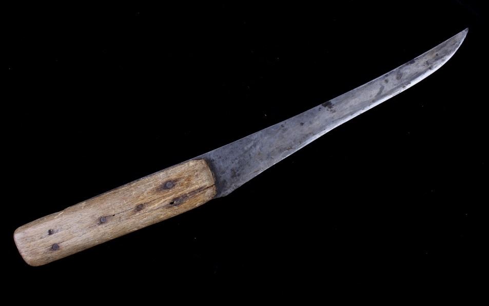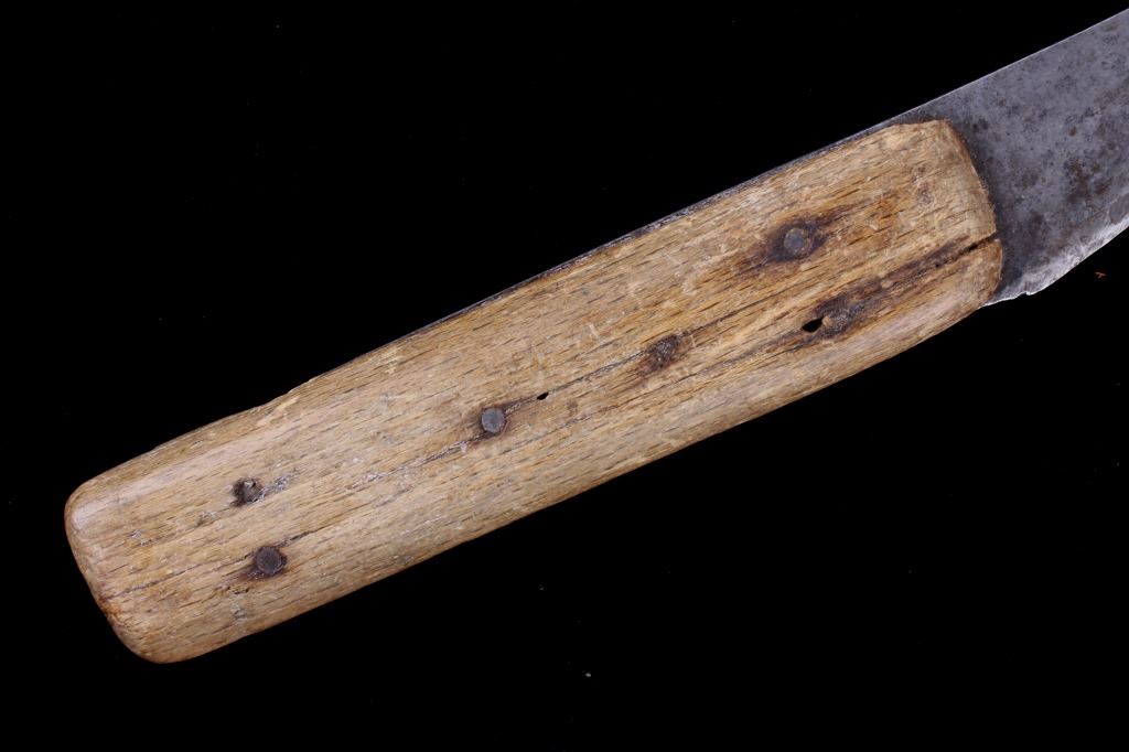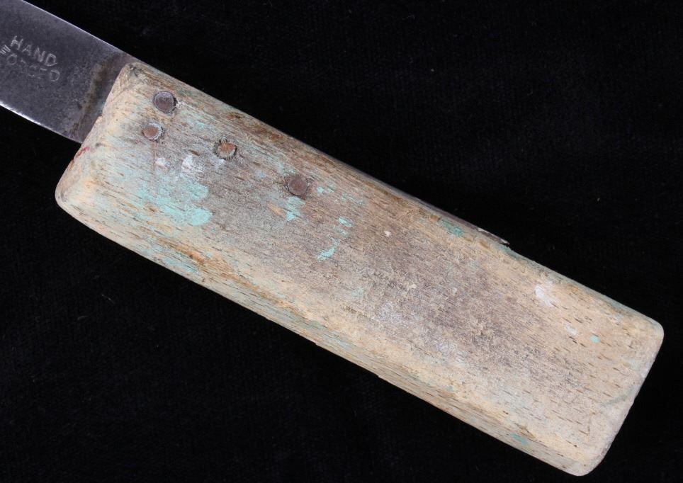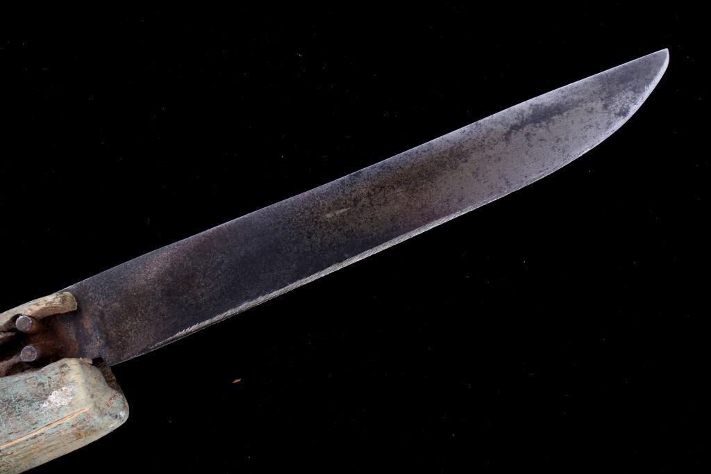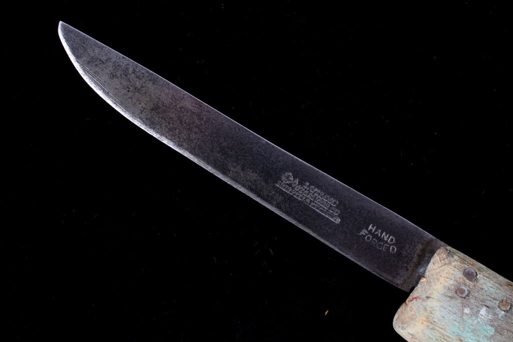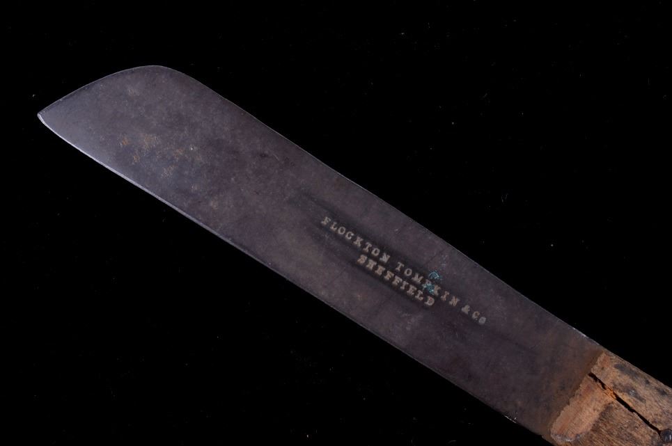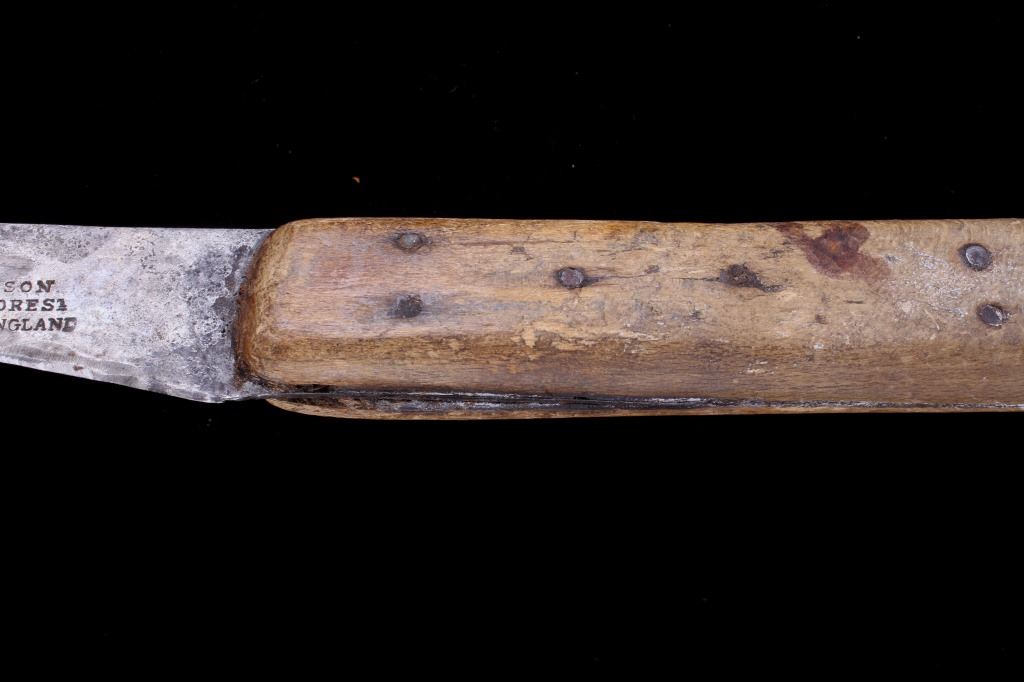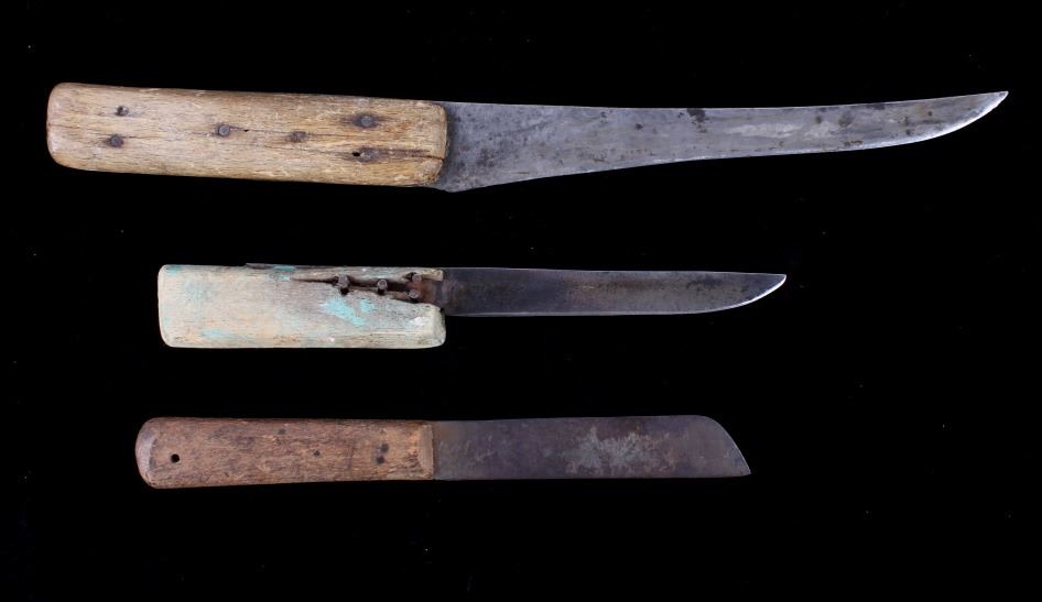 For your consideration in this lot is a collection of early Northern Plains Indian trade knives, originating from the late 1800's to the early 1900's. The knives in this collection were typically traded to the Northern Plains Indians in the 19th Century. This collection consists of three marked trade knives. The knives show steel blades with hard wood grips. The first knife in this collection shows a wood handle and a sheep's foot design steel blade that sets into a groove in the wood and is held in by three pins. It is stamped "Flockton Tompkin & Co Sheffield" on the blade. The last two knives are "L Wilson Sheffield England" made knives. The smaller knife is stamped "hand forged" and shows a light colored wood handle with four pins securing the blade. The handle on this knife has a chip missing on the side showing the pins; the blade is in good condition for age and use. The larger of the two knives shows “L Wilson Sheffield England" stamped on the blade, but it is partially worn with age and use. The hardwood grip is secured with five pins. All knives show a nice patina on the metal and wear to the handle, appropriate for its age and use. These knives measure 8.75", 8.75", and 13" in overall length.