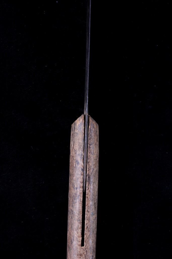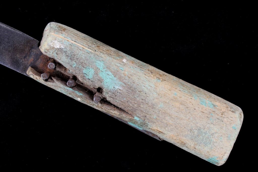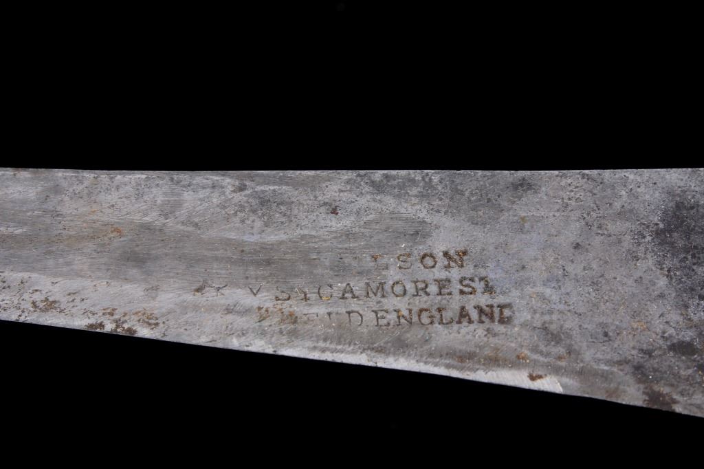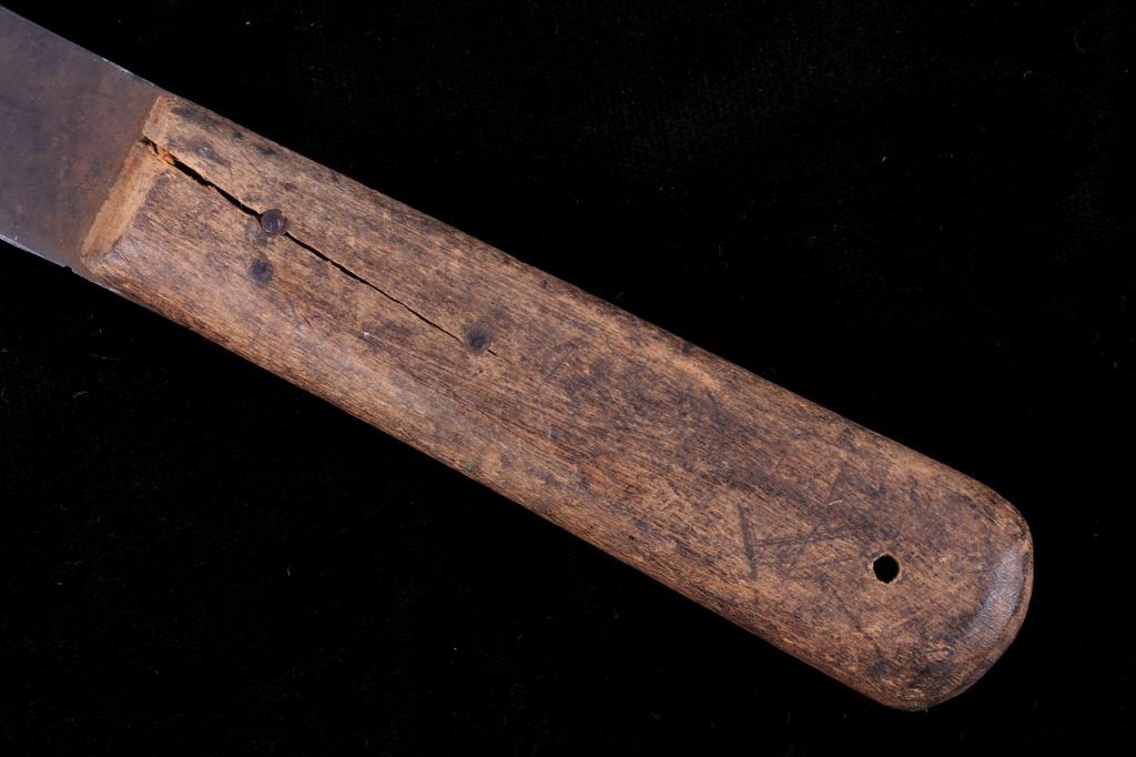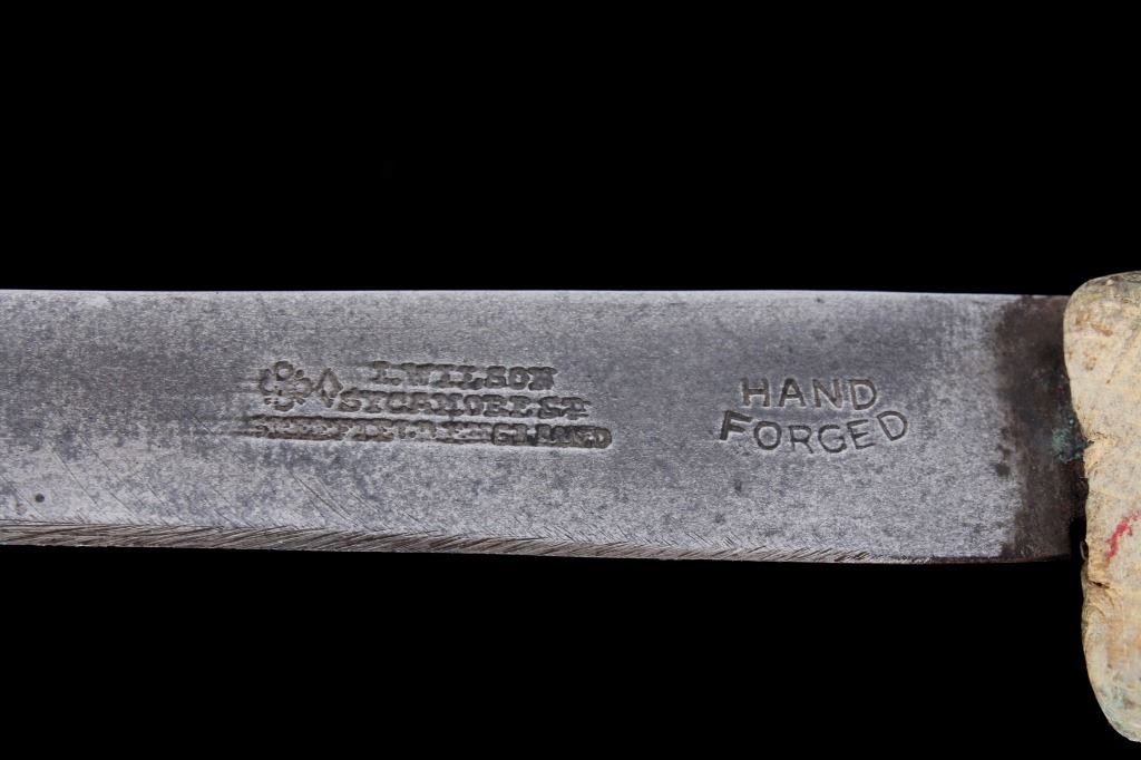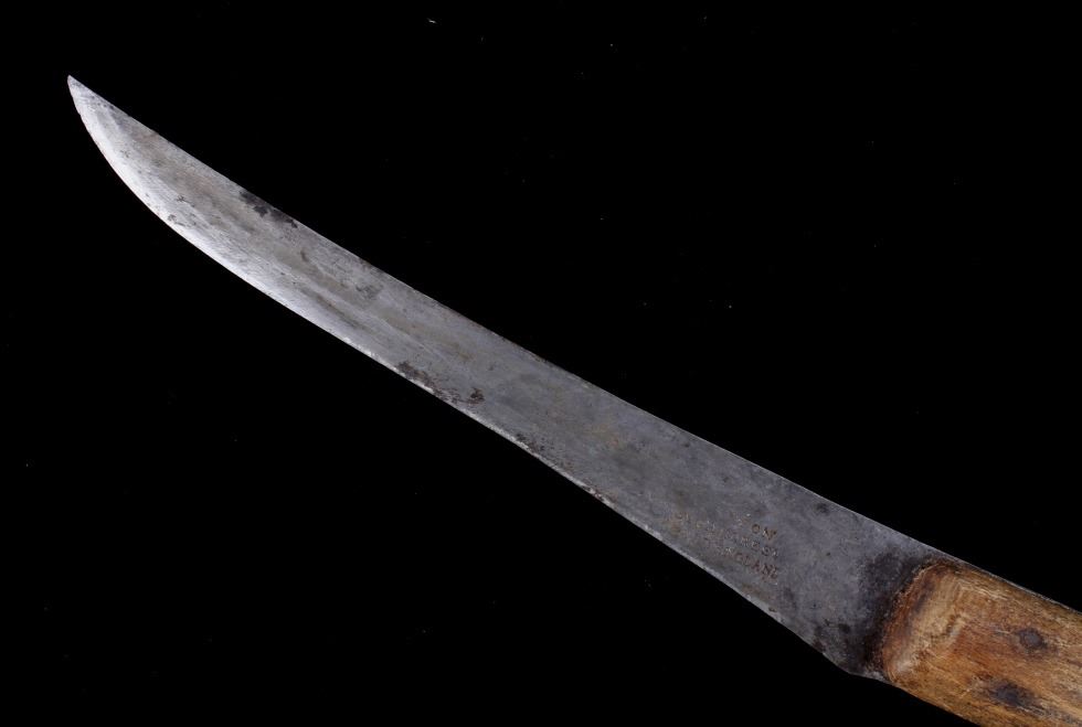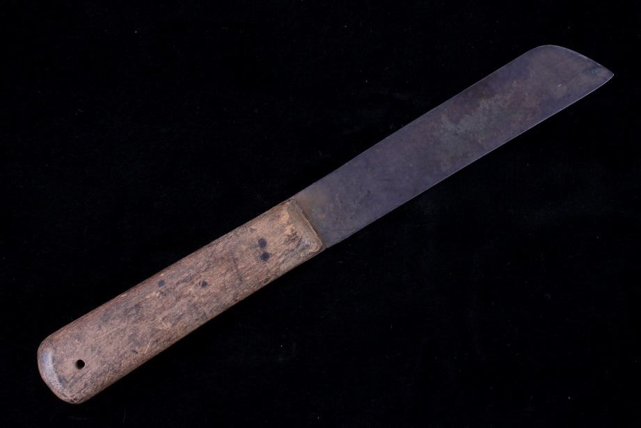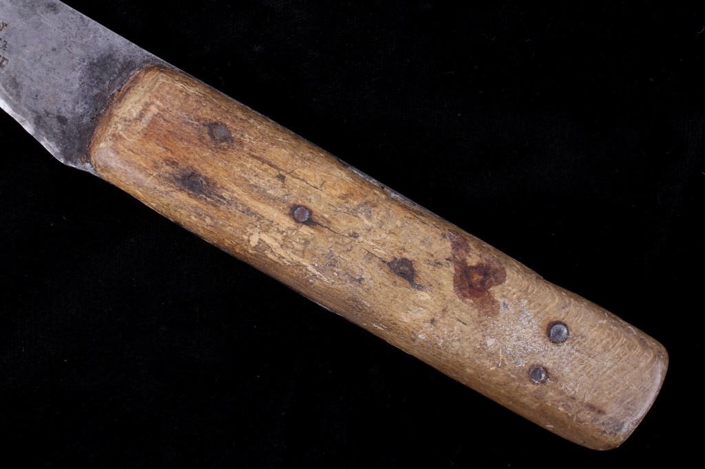 For your consideration in this lot is a collection of early Northern Plains Indian trade knives, originating from the late 1800's to the early 1900's. The knives in this collection were typically traded to the Northern Plains Indians in the 19th Century. This collection consists of three marked trade knives. The knives show steel blades with hard wood grips. The first knife in this collection shows a wood handle and a sheep's foot design steel blade that sets into a groove in the wood and is held in by three pins. It is stamped "Flockton Tompkin & Co Sheffield" on the blade. The last two knives are "L Wilson Sheffield England" made knives. The smaller knife is stamped "hand forged" and shows a light colored wood handle with four pins securing the blade. The handle on this knife has a chip missing on the side showing the pins; the blade is in good condition for age and use. The larger of the two knives shows “L Wilson Sheffield England" stamped on the blade, but it is partially worn with age and use. The hardwood grip is secured with five pins. All knives show a nice patina on the metal and wear to the handle, appropriate for its age and use. These knives measure 8.75", 8.75", and 13" in overall length.