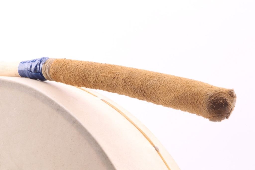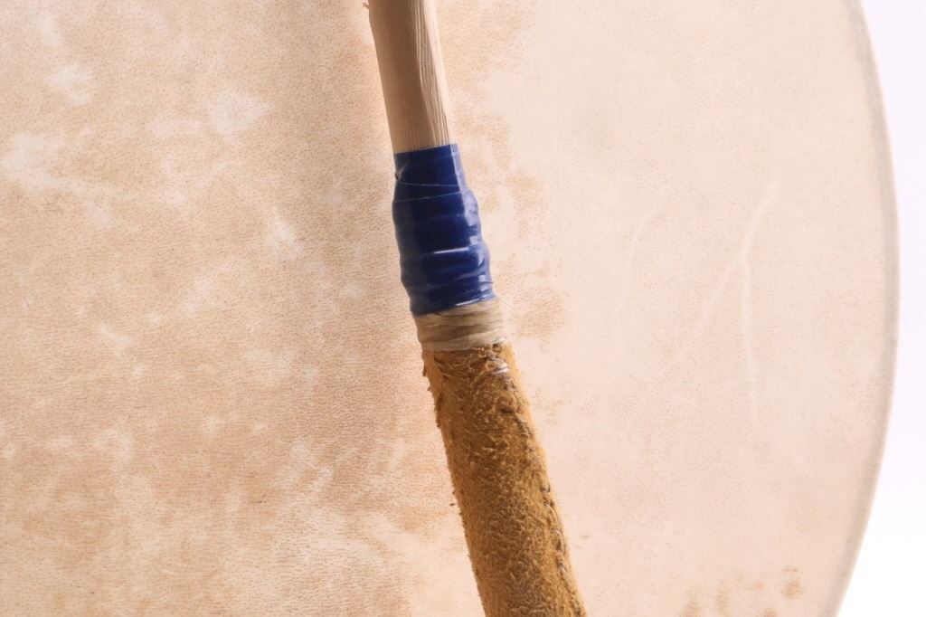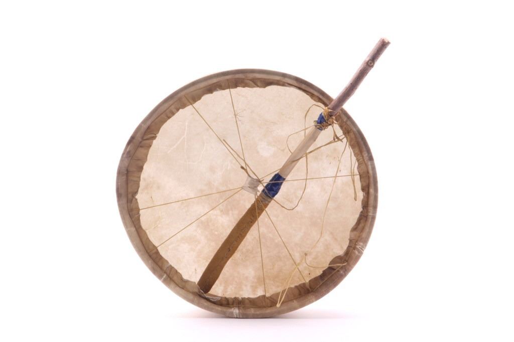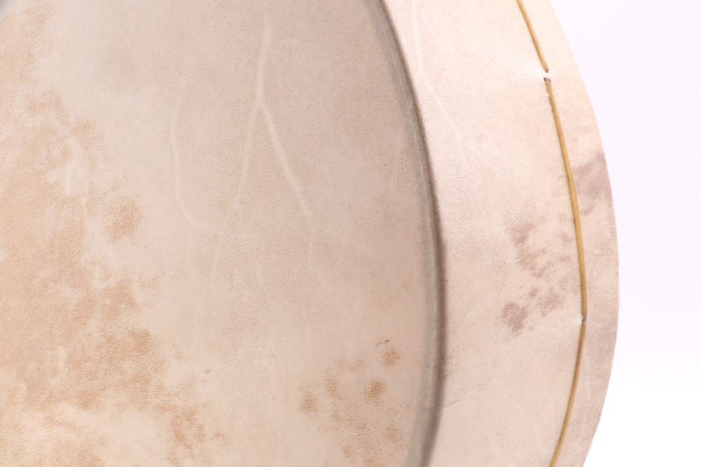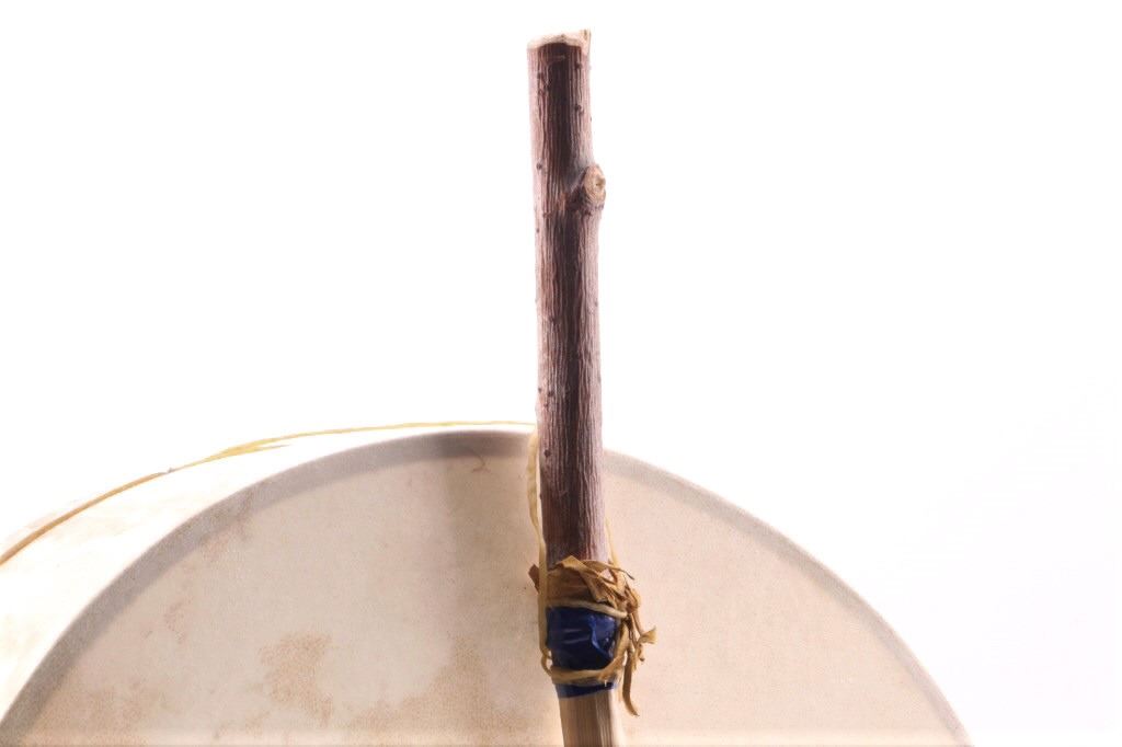 Featured in this lot is this Northern Plains Indians elk rawhide drum and beater. This is a wooden hoop wrapped elk rawhide drum attributed to a Northern Plains tribe, with sinew string attaching the wetted and stretched elk hide. The beater shows a softwood core with a stuffed hide head and is attached by a sinew wrap. The condition of this drum is fair with some contemporary repairs to the sinew strings underneath the drum and to the beater itself; this is a contemporary drum and beater. The measurements of this drum are 12 1/2" x 12" x 3" and the beater measures 15 1/2" x 1".