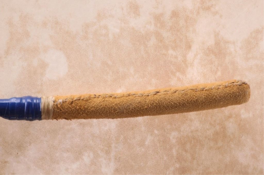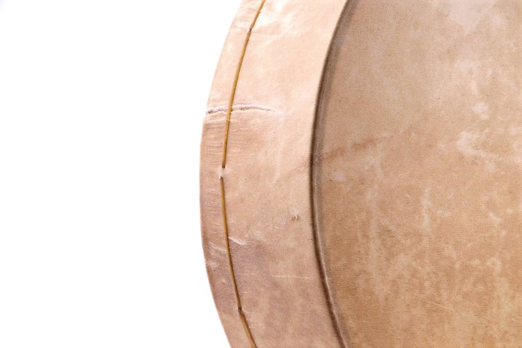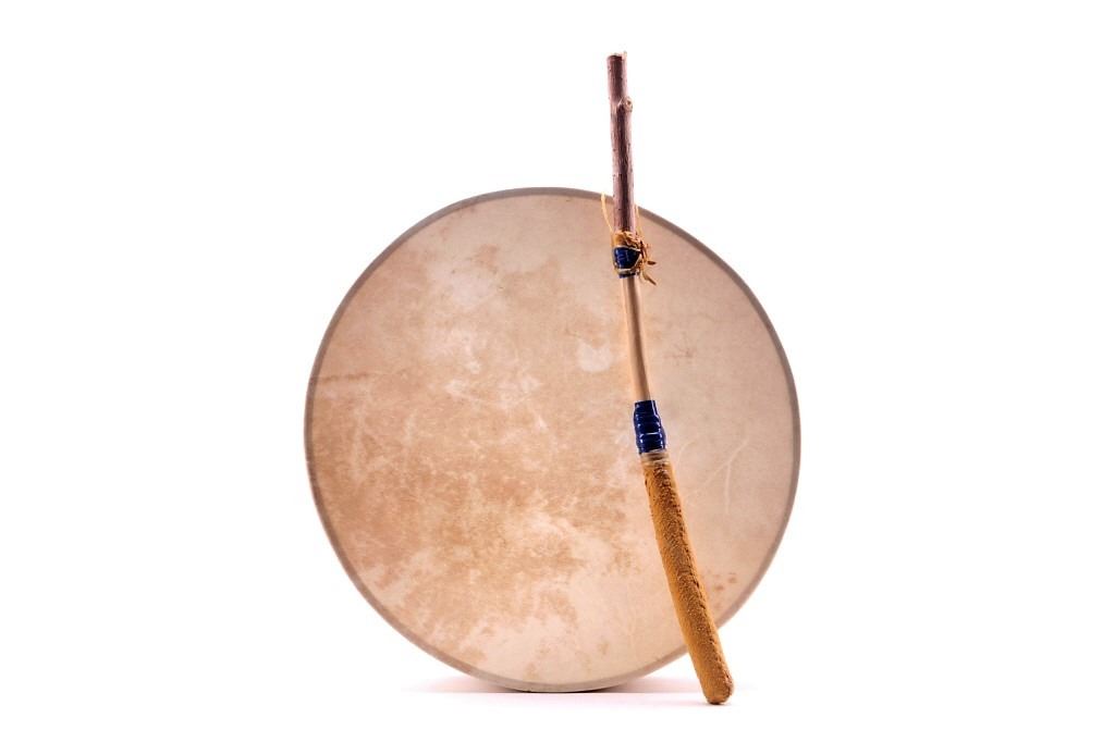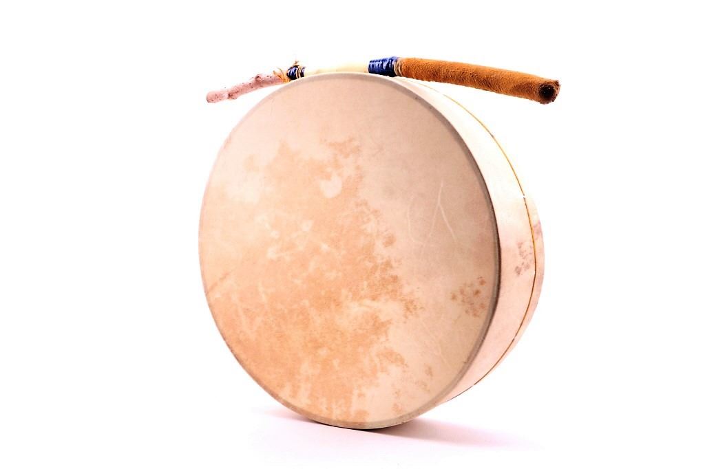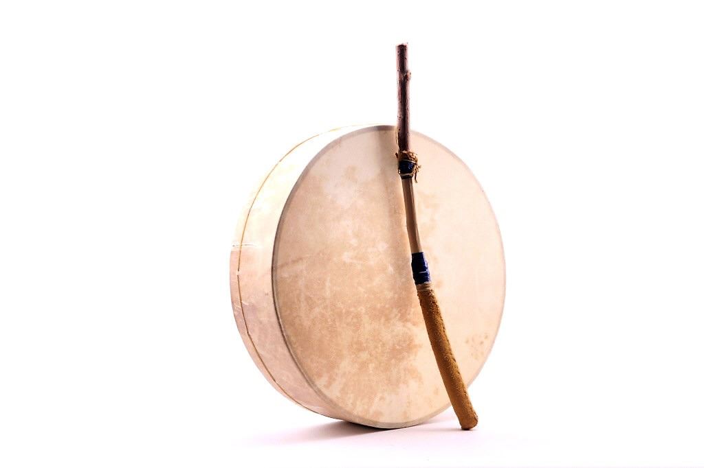 Featured in this lot is this Northern Plains Indians elk rawhide drum and beater. This is a wooden hoop wrapped elk rawhide drum attributed to a Northern Plains tribe, with sinew string attaching the wetted and stretched elk hide. The beater shows a softwood core with a stuffed hide head and is attached by a sinew wrap. The condition of this drum is fair with some contemporary repairs to the sinew strings underneath the drum and to the beater itself; this is a contemporary drum and beater. The measurements of this drum are 12 1/2" x 12" x 3" and the beater measures 15 1/2" x 1".