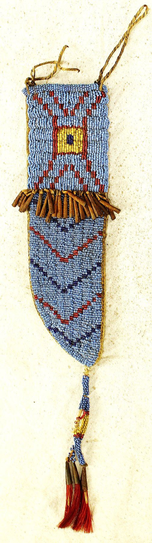 Extremely visual large 19th Century lazy stitched, sinew sewn sheath, beaded with medium blue background, red white heart and cobalt blue design distributed throughout, featuring a greasy yellow meat pack, adorned with the original tinkle cones and beautifully beaded and horsehair drops. Heavy parfleche liner, measuring approx. Do disappointments here!!!
