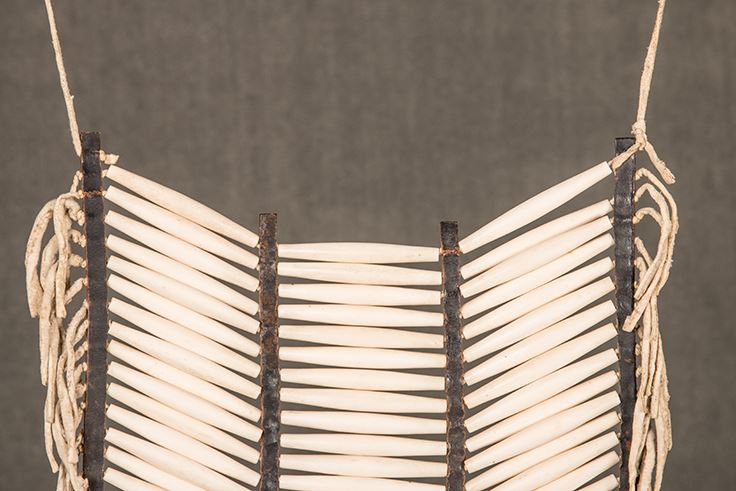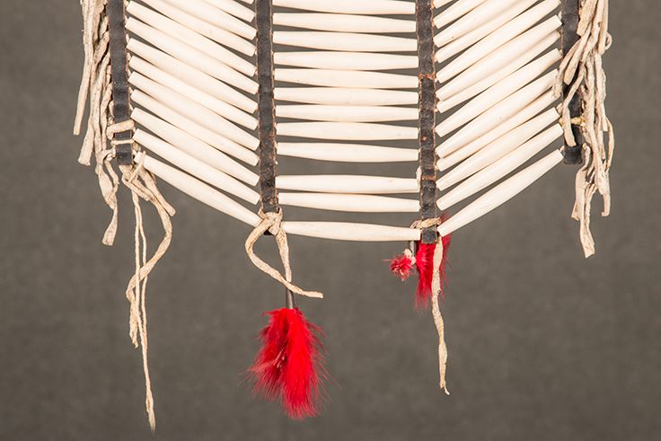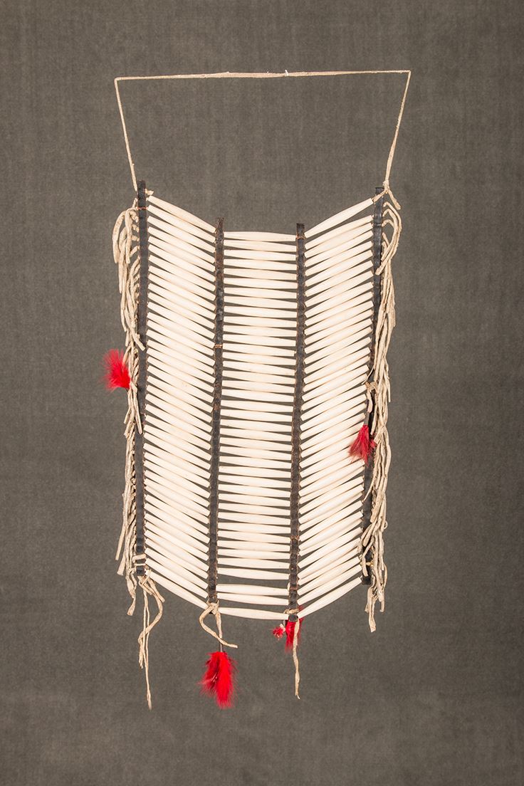 Northern Plains Man's Breastplate. 18" x 11" with chicken feather drops and 123 hairpipes strung on harness leather accented with short fringe. Early 20th century.