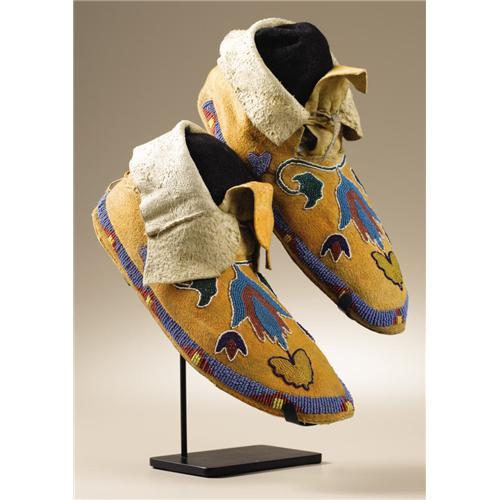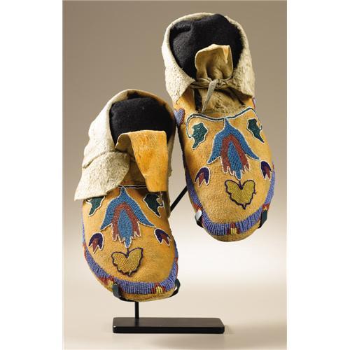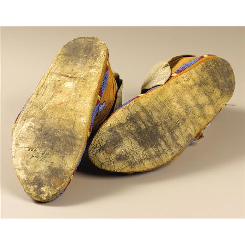 <B>Northern Plains Moccasins / Possibly Fort Peck Assiniboin</B></I><BR>Circa 1890<BR>Length 10 3/4 in.<BR><BR>This pair features native tanned hide uppers with rawhide soles. The vamps are partially beaded with stylized floral designs. The moccasins have been rubbed overall with an orange ochre. A single lane of beadwork circles the border.<BR><BR>