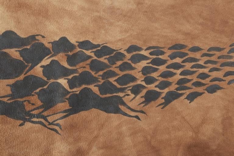 Featured in this lot is this Northern Plains painted deer hide circa 2000. The hide features a wonderfully and professionally tanned deer hide construction that features a herd of buffalo gradually getting closer painted in a natural black paint. The piece is marked with the artist hallmark in the bottom left hand corner along with the date. The condition of this painted hide is good with no obvious signs of damage to the tanned hide or the artwork and shows good overall condition. The measurements of this hide are 53 1/2" x 38 1/2".