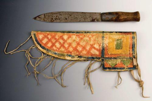 Northern Plains Parfleche Knife Case. 12" x 5". 19th Century. 13" long knife with wood and lead inlay handle. 19th Century. Fine paint and condition. (est $2,000-3,000)