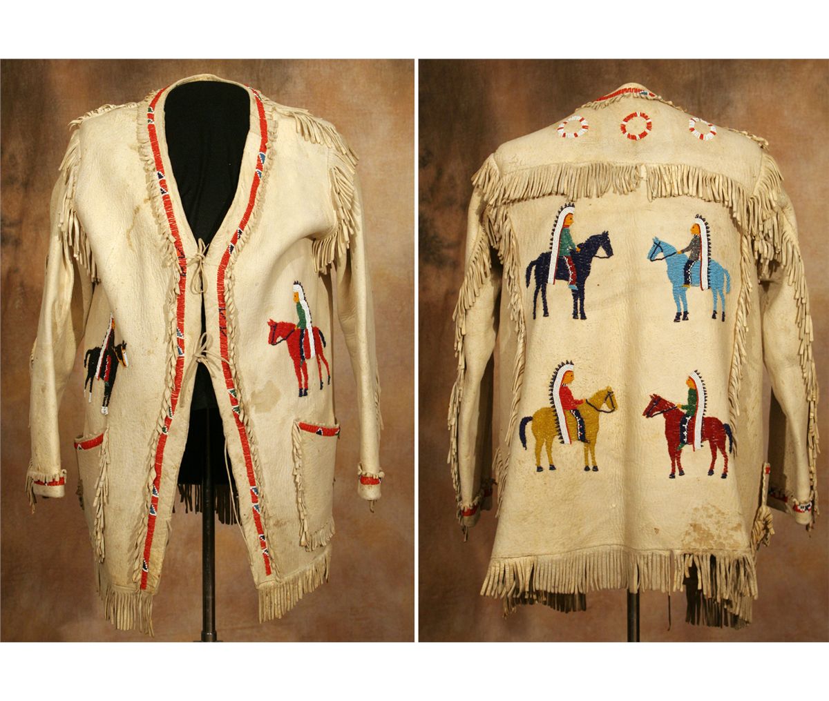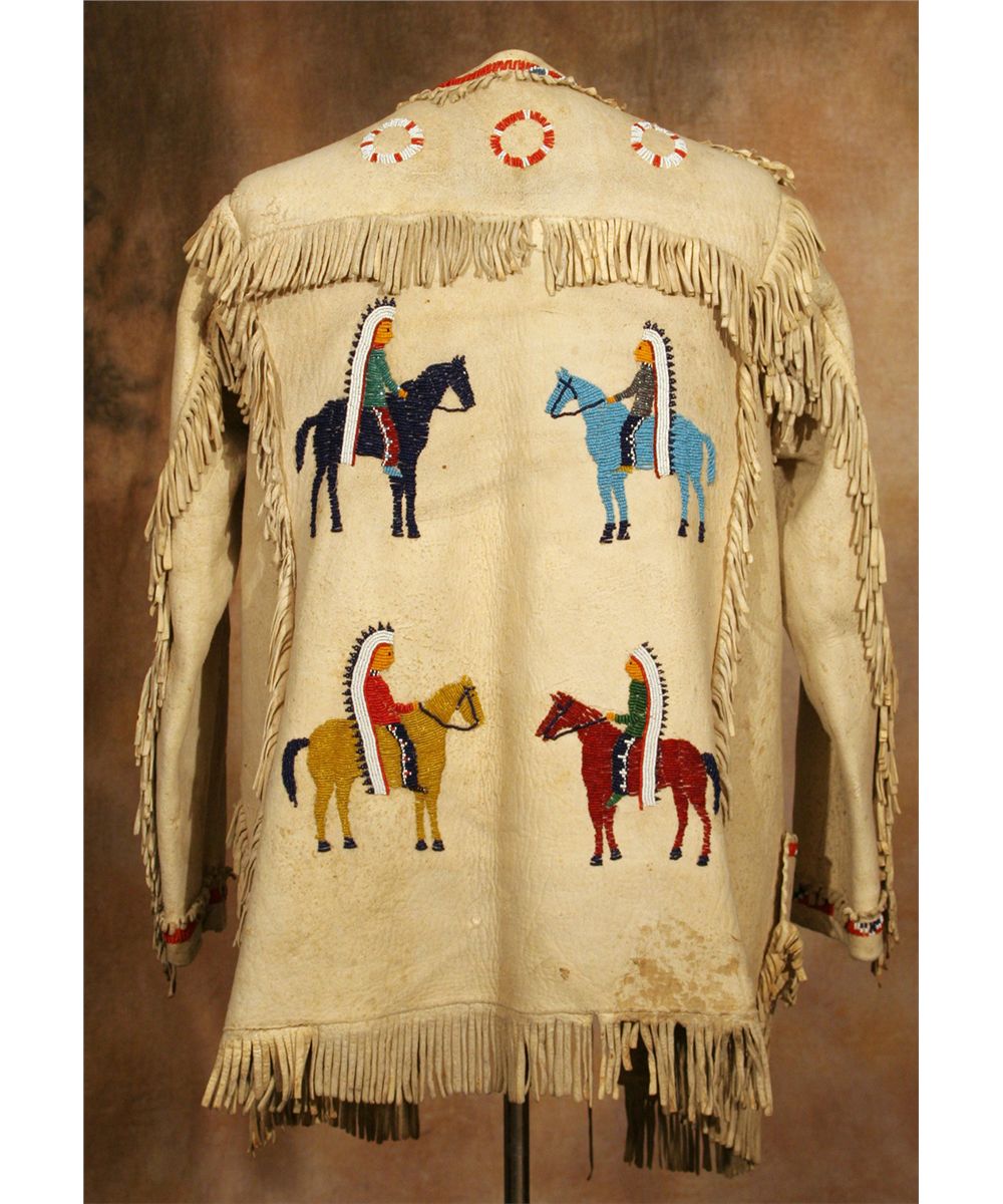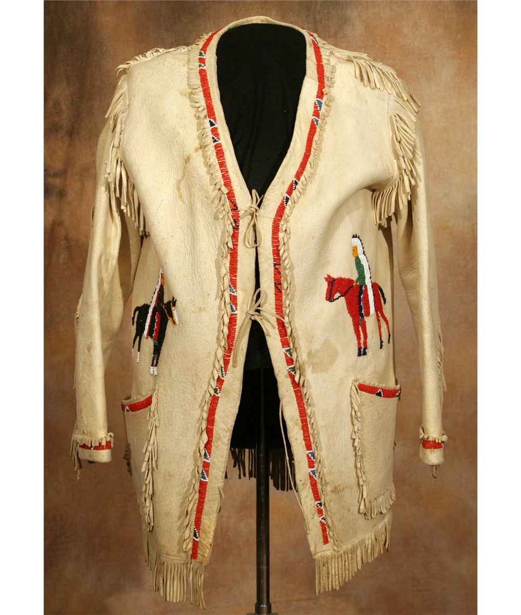 Northern Plains Pictorial Man's Jacket. 30" long. Indian tanned hide with fine design elements of full regalia chiefs on horseback. 2" fringe decorates the front, shoulders, back & along the bottom. An old note found in the pocket states that the jacket was made in 1920 by a relative of Sitting Bull's. Note is included in lot.