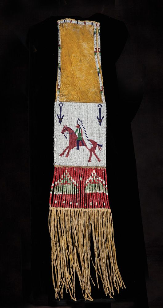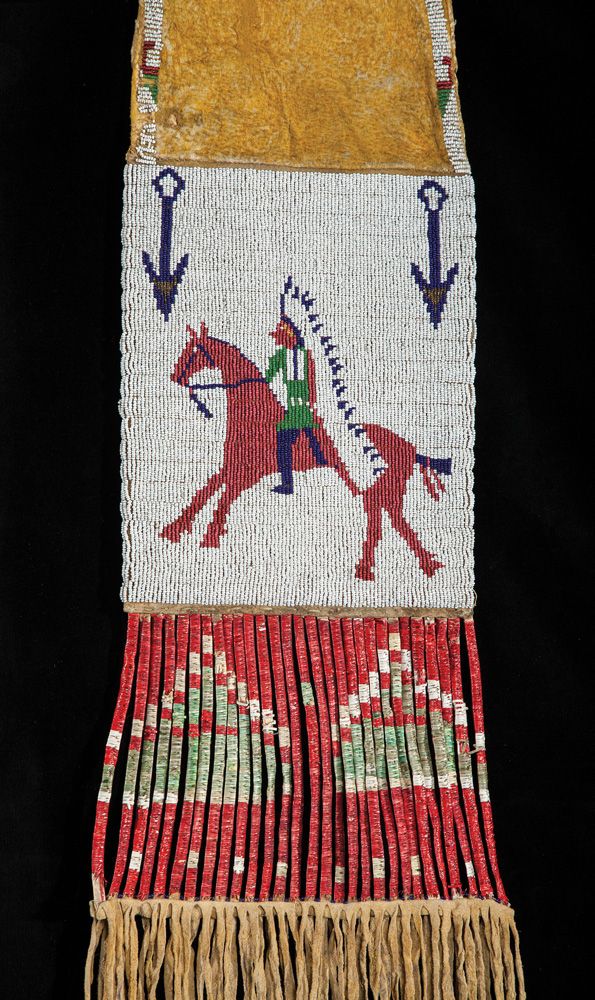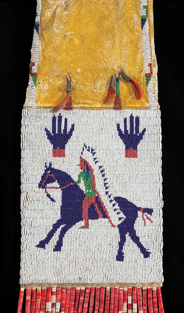 Human hands with warrior on horseback in full length headdress. 43” overall, 10” x 8” beaded panel with deep blues. 6” quill extensions. Yellow ochre hide bag.