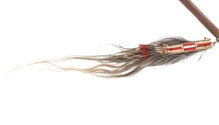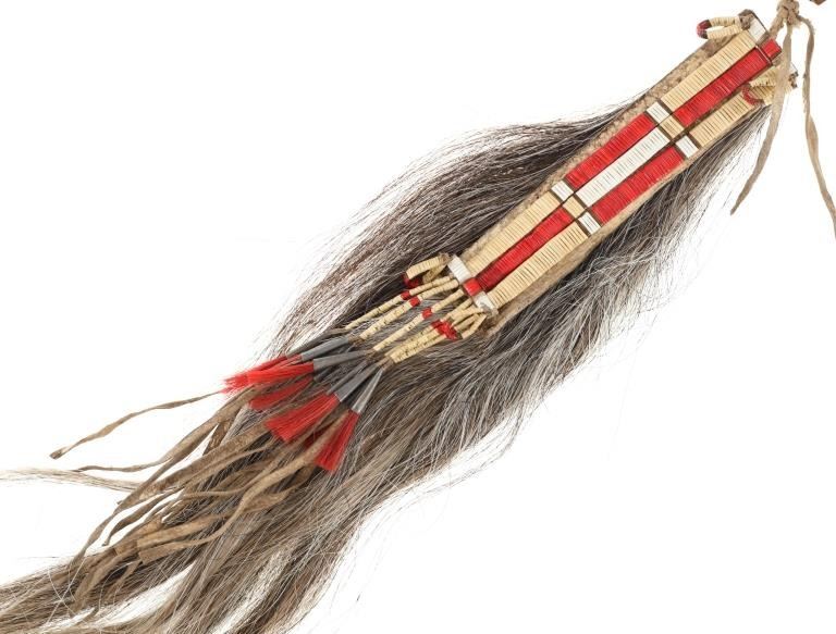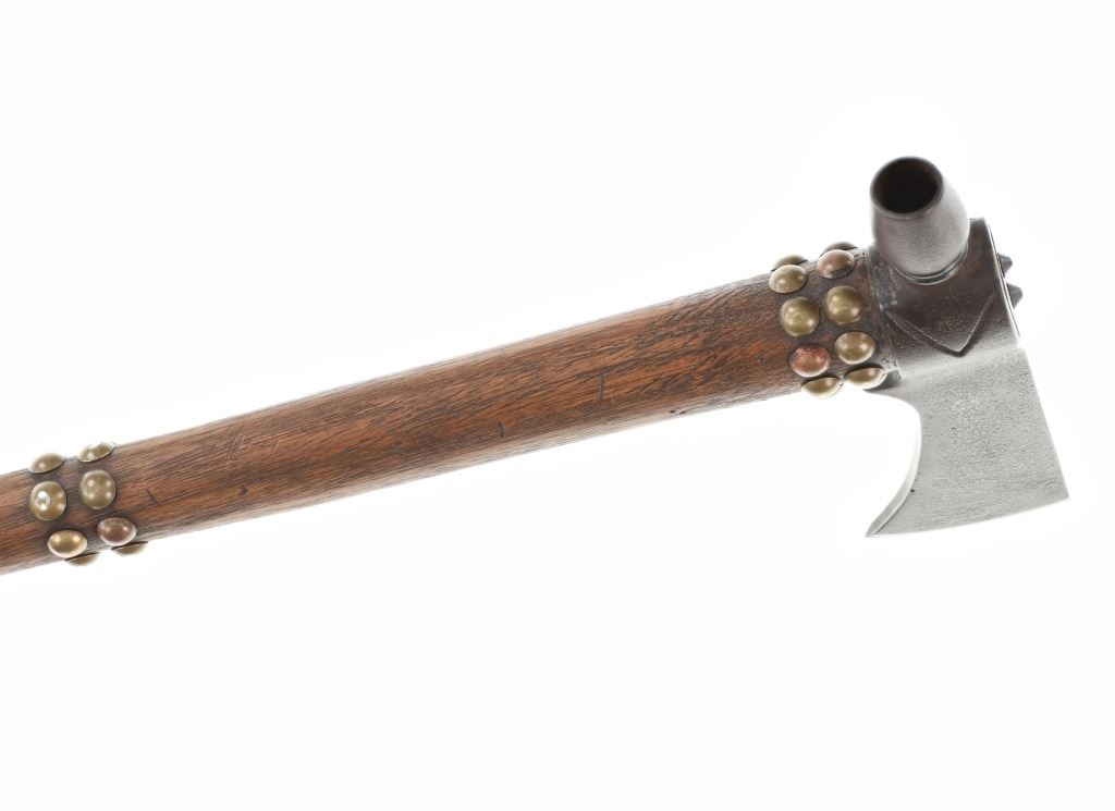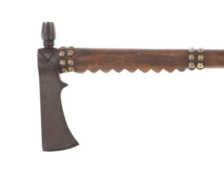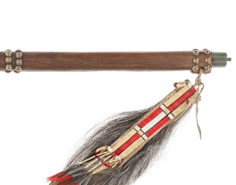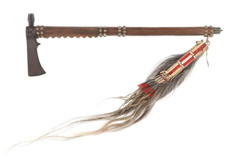 The lot features an iron pipe tomahawk with quilled horsetail scalp drop from the Northern Plains of the 20th Century. The tomahawk exhibits a long large older pattern iron head with small carved bottom blade having a thick long body with ovalled square eyelet hole. The head has an spur pointing out with smooth finish and medium vase like bowl and is held into place with iron finished eye cap with two iron studs onto a hard wood haft handle. The handle has a sawtooth cut design under the front and is covered in hbands of brass covered metal furniture tacks. The base has a palm stop carved into the wood and the smoking tip is capped in brass, an artful touch. The bottom has a drop tied with Indian tanned buckskin showing a horsetail or horse main scalp drop with parfleched hide and is covered in porcupine quill quillwork in natural cream / white, brown and dyed red. The base has fringes of horse tail hair and fringes of Indian hide wrapped in porcupine quillwork with rolled tin jingle dangle cones on the end. The tomahawk appears to have an older Reservation era age to it possibly from the early-to-mid 1900's. The head itself measures 8"L by 2 3/8"L across the bottom of the blade. The club without the drop measures 25"L and the drop is an additional about 32"L.