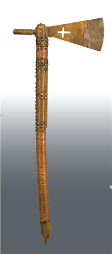Northern Plains Pipe Tomahawk. 27" long. Brass head is 11" wide. Inset iron blade into brass. Wood haft is decorated with brass tacks and copper wire. Tomahawk is circa 1860 with haft being somewhat later. (est $8,000-10,000)