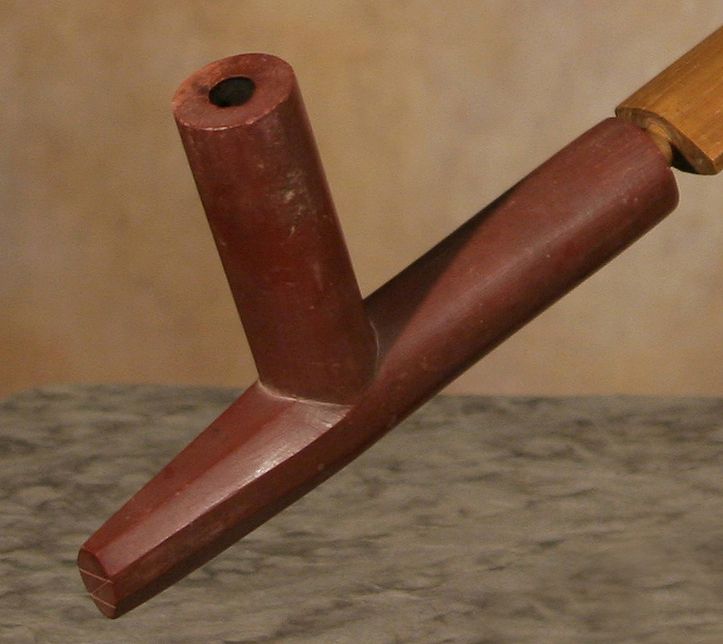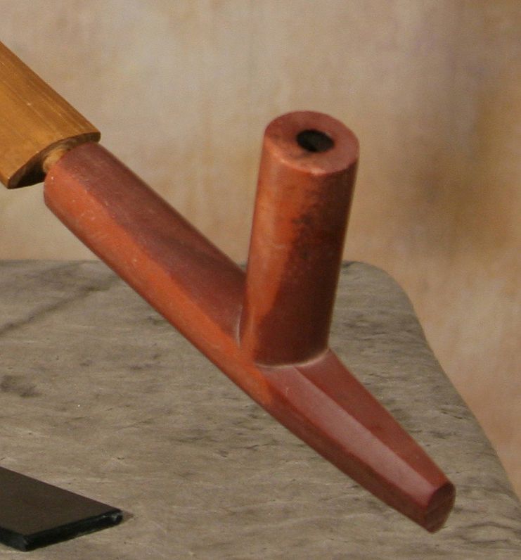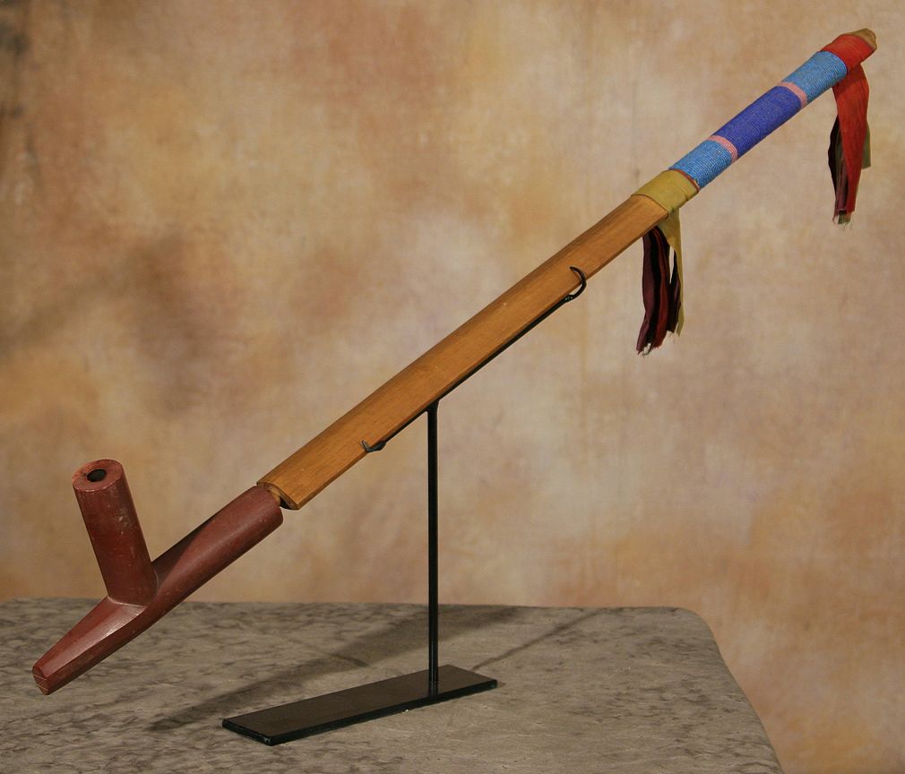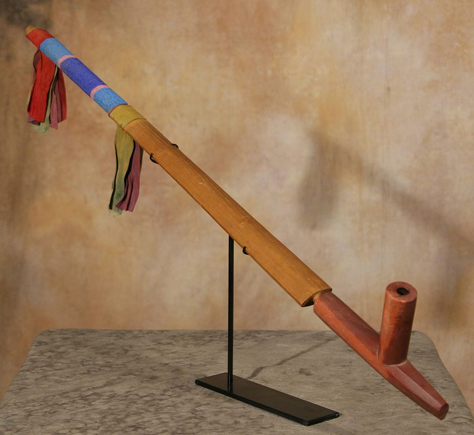 Northern Plains Pipe. 26" stem with a 7 ½" x 5" catlinite "T-style" bowl. Stem has 7 ½" of wrapped beadwork with ribbons on each end. Circa 1890. (est. $2,500-3,500). CONDITION REPORTS: www.auctioninsantafe.com/docs/cr2012.pdf