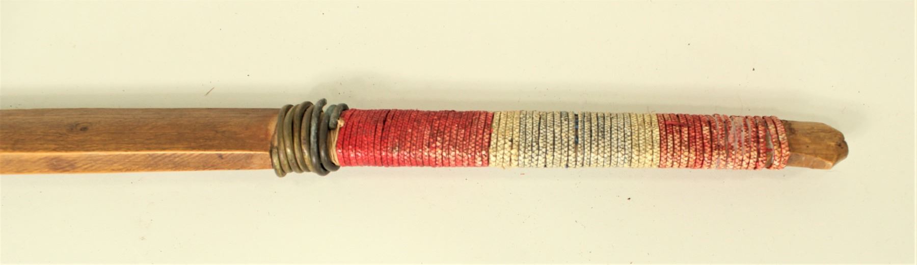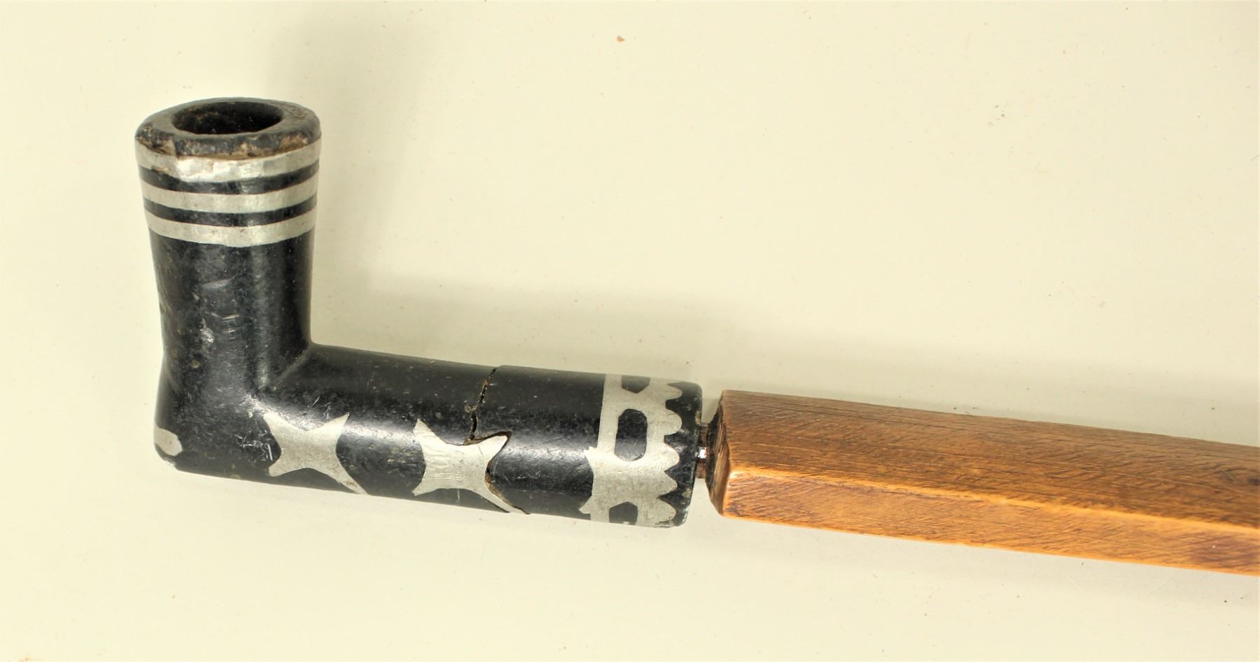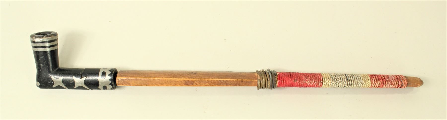 Wonderful Native American pipe with decorative silver mounted catlinite bowl, and finished with a boldly colored wrapped stem. Showing nice wear, color and patina, and slight repairable crack in bowl.