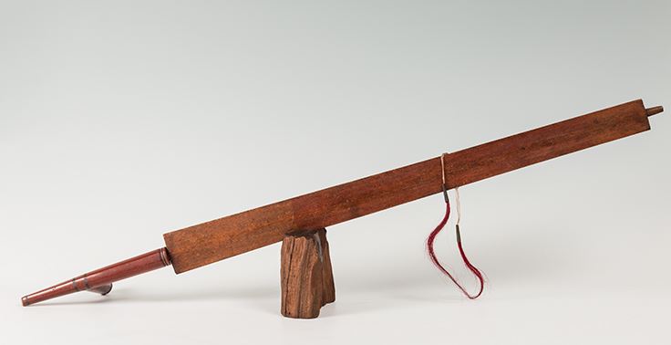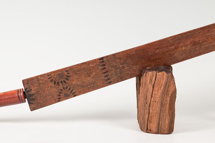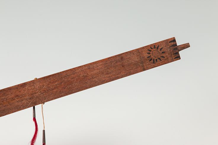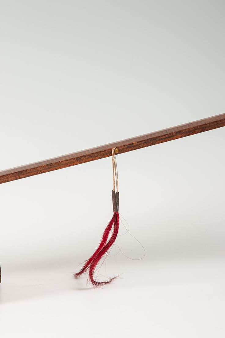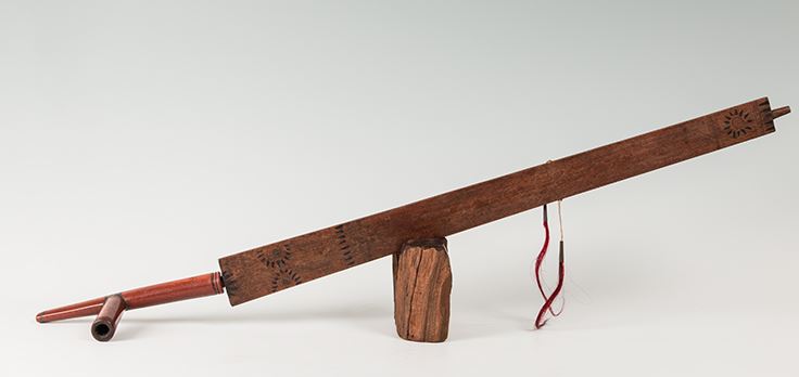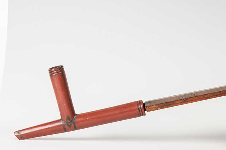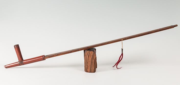 Northern Plains Pipebowl and Stem. Catlinite "T" style bowl is 9" x 4 ½", with pewter inlay work and fine carving. Stem is 30" long and decorated with chip carving depicting the sun, decorated with two tacked on drops which terminate in red horsehair stuffed tin cones. 19th Century