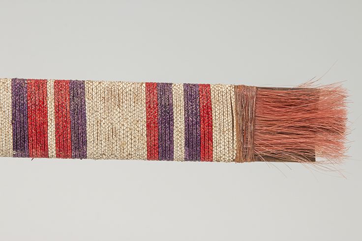 Northern Plains Pipebowl and Stem. Exceptionally carved "T" style catlinite bowl is 9" x 4" and carved into the head of an eagle, intricately inlaid with pewter. Stem is 24" long and two-thirds of it is wrapped with extra fine quillwork then floral trade cloth which is held with wrapped sinew and brass tacks.
