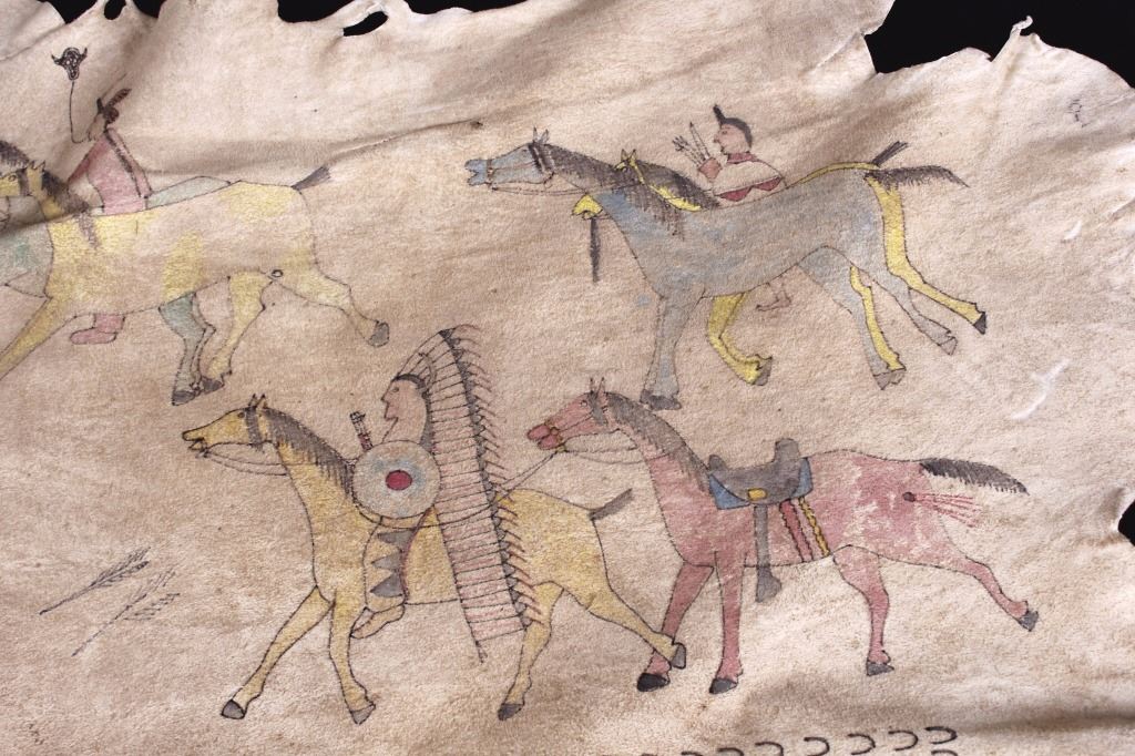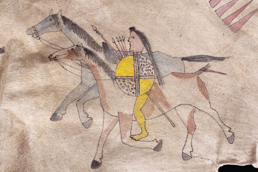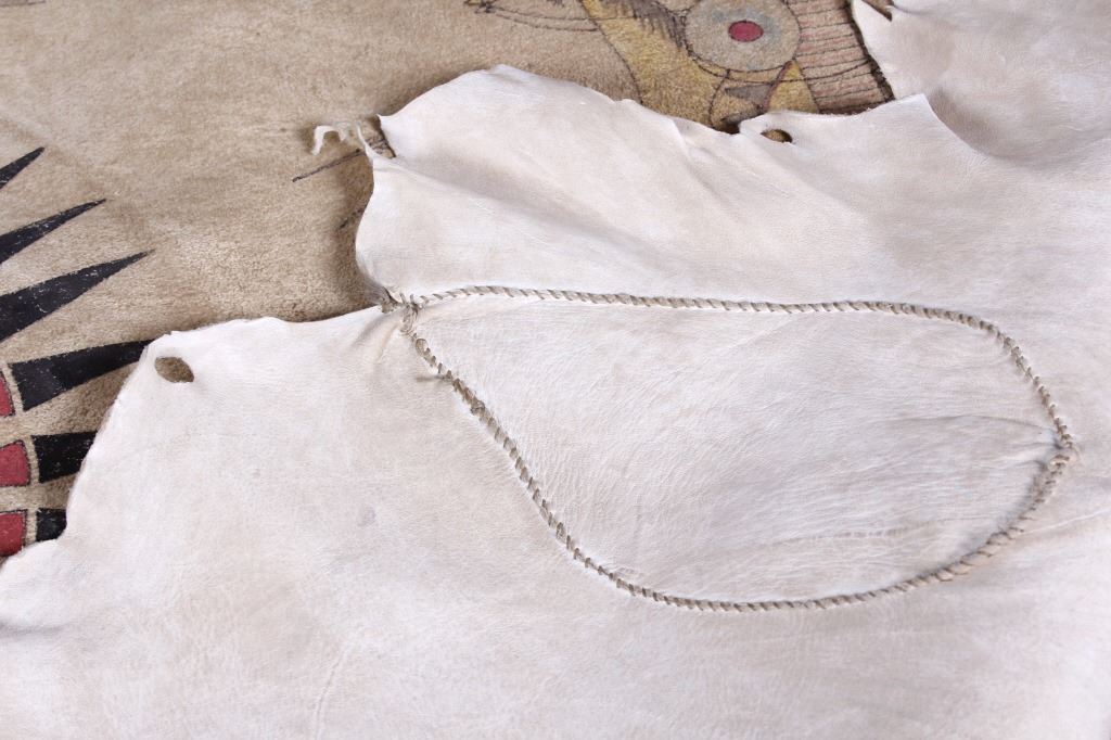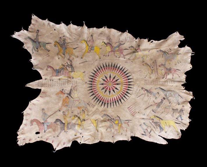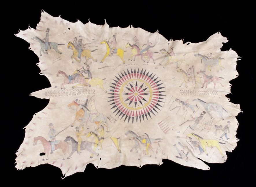This is an original Northern Plains Native American Indian polychrome painted pictorial and pinwheel hide. The 20th Century piece shows an Indian Tanned hide construction with polychrome painted war scene of a band of Northern Plains Warrior's overtaking a group of Western Cowboy Settlers and US Cavalry Soldiers. At the center of the painted hid is the ever impressive pinwheel circle symbolizing the circle of life. The piece also shows various Horse Hoof effigy symbols and the incredible scarce devil like Indian folklore mythological figure. The piece is not signed and shows a very finely crafted design with well preserved good overall condition. Please review pictures. The piece measures 36 1/2" x 49".