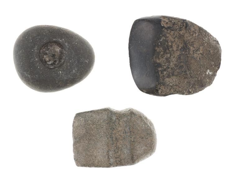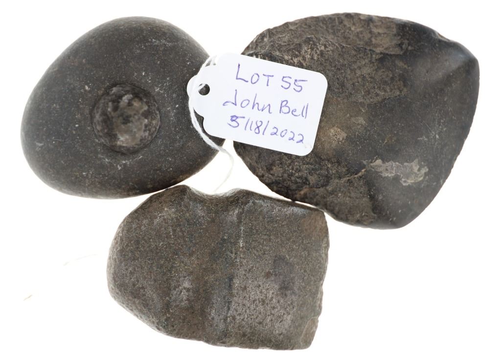 Presented in this lot are three (3) Northern Plains Pre-Columbian Stone Tools including one double-notched stone axe head, one jadeite celt, one jadeite nutting / fire starter stone. Ground stone tools were made beginning in the Archaic period, through grinding two stones together and removing parts of the stone gradually until the desired shape was reached. All sorts of types of ground stone tools were made including axes, celts, hammerstones, plummets, sinkers, and more. These artifacts are in good preserved condition. The stone axe head measures 2.75"L x 2"W x 1"H, celt is 3.25"L x 2.75"W x 1.25"D, nutting stone is 2.75"L x 2.25"W x 1" (hole is .5"D). Total weight 1lb 4oz.*