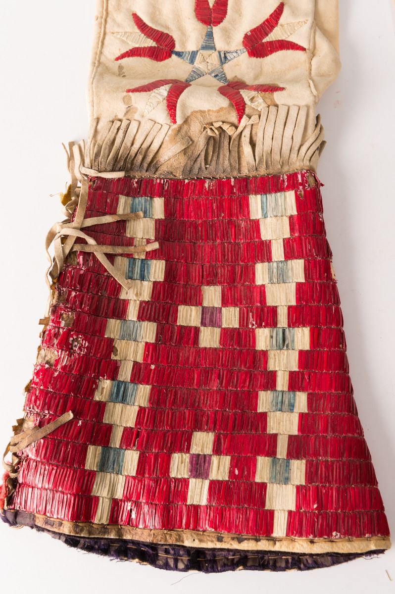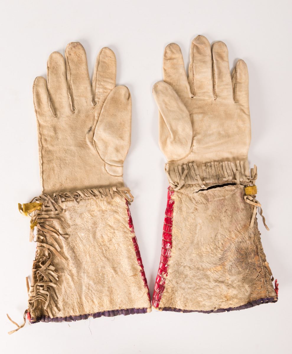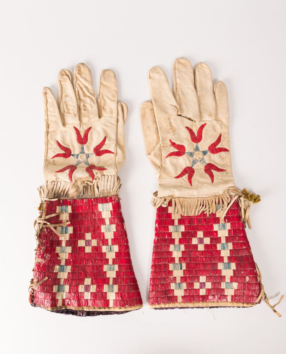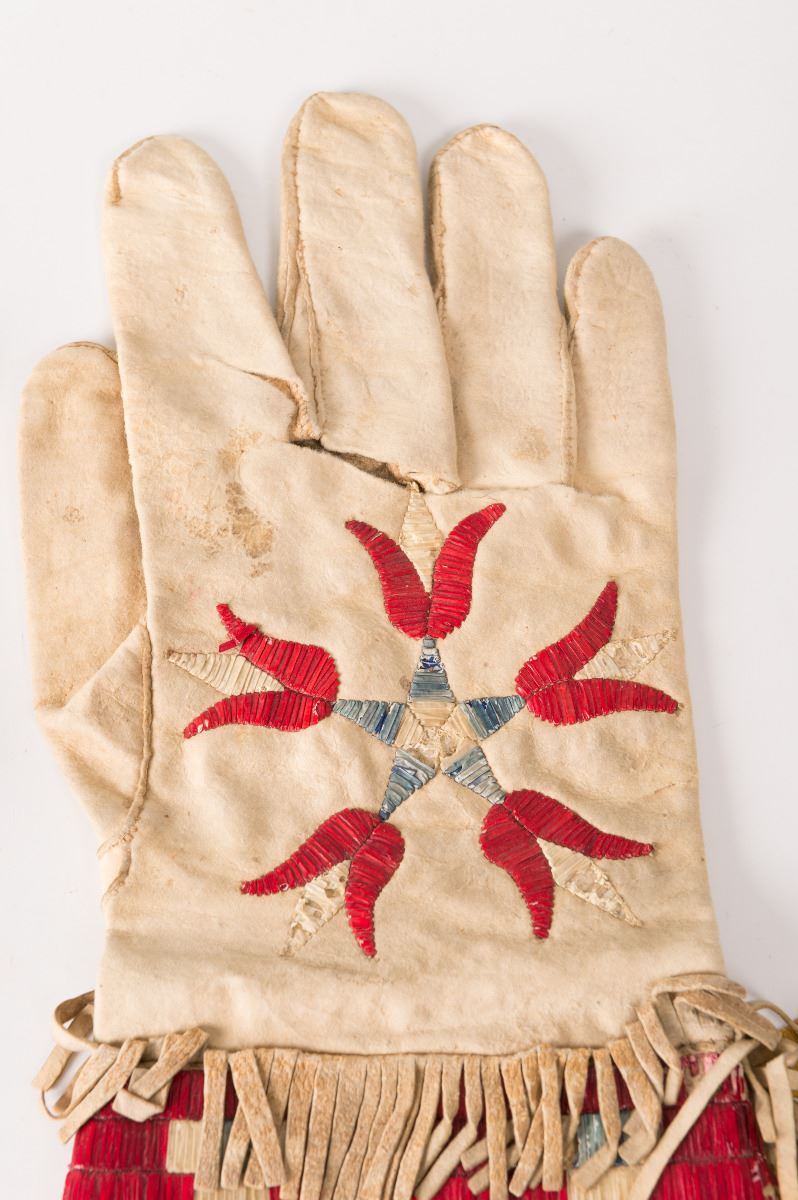 Northern Plains Quilled Guantlets. 15" x 7" at widest point. 6" x 7" of quillwork featuring floral designs. Lined and bordered with velvet cloth and accented with fringe. Circa 1890s.