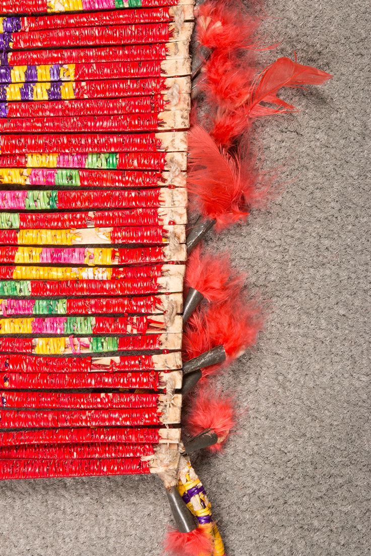 Northern Plains Quilled Man's Breastplate. 15" long x 9 ½" wide. Bright colored wrapped quills, accented with chicken feather-stuffed tin cones and 12" quill-wrapped drops also terminating in stuffed tin cones. Circa 1920's.