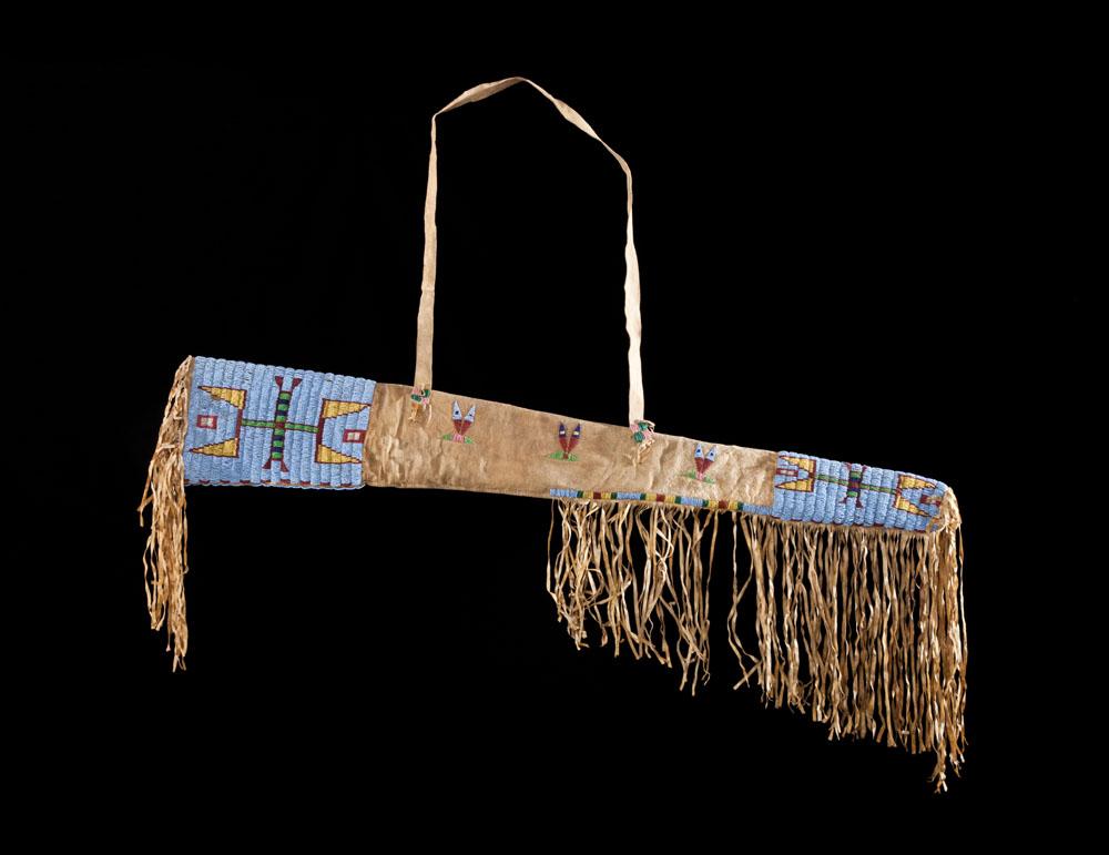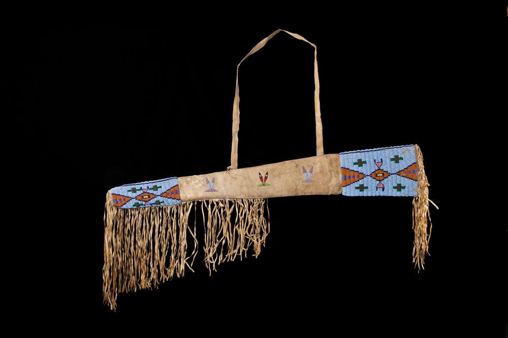Beaded with fringe and carrying strap. Left side has pumpkin beads on blue field with red, yellow and green bead sections. Right side has yellow, green and red design on blue field. Scabbard is 43” in length with 9” to 15” fringe. Great color, beads intact, fringe and portion of case has slight stiffening. c. 1890s.