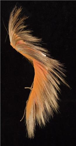 Northern Plains Roach. 15" long. Horsehair base dyed purple, white and orange. With carved bone roach spreader in shape of fish and 2 feather holders. Early 20th century. All excellent condition. (est $1,000-2,000)