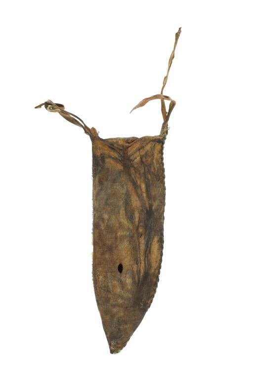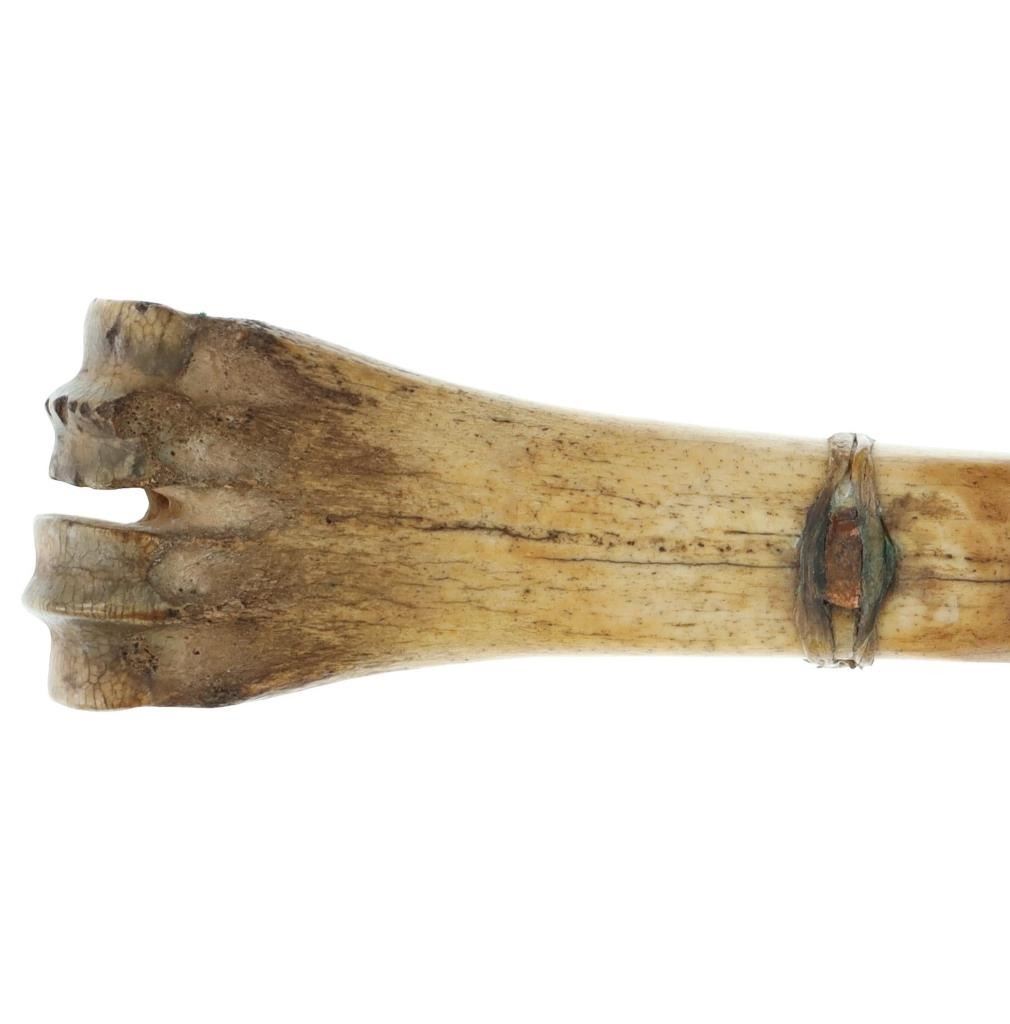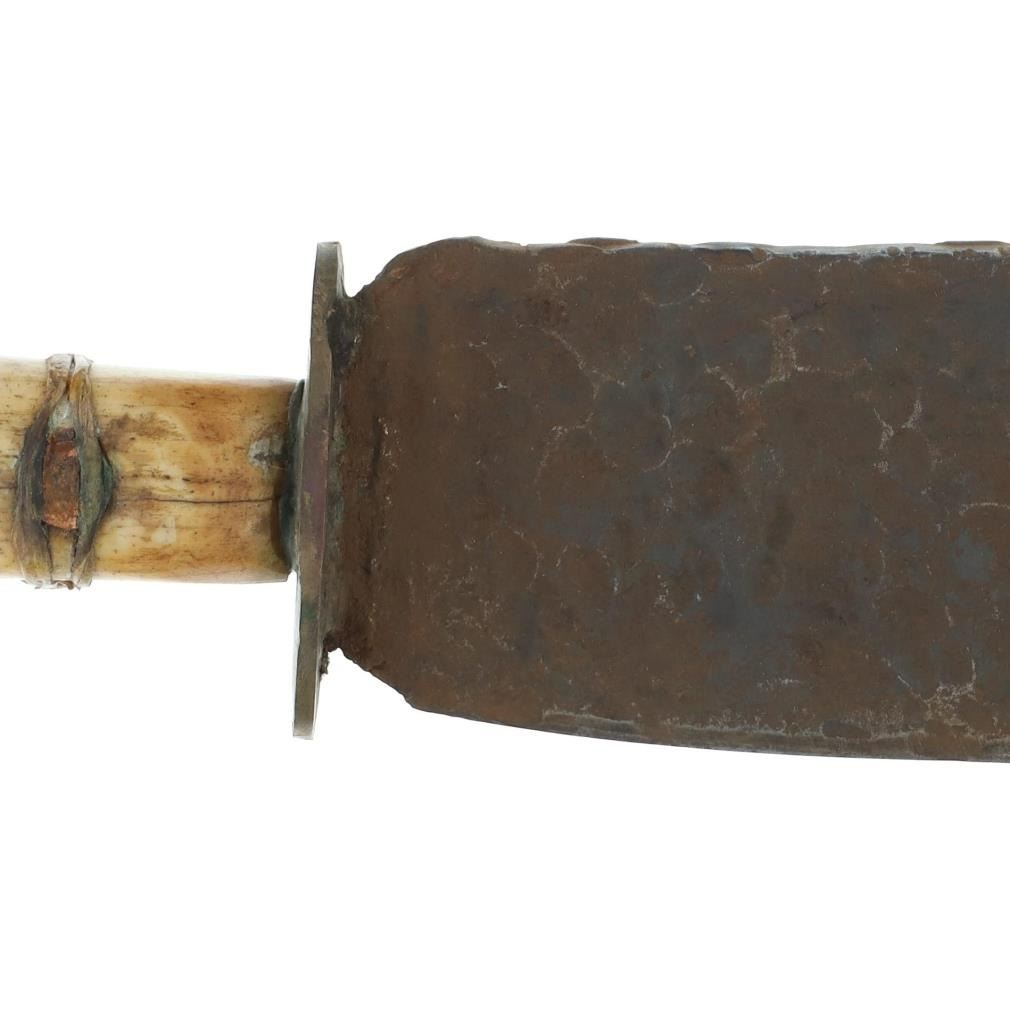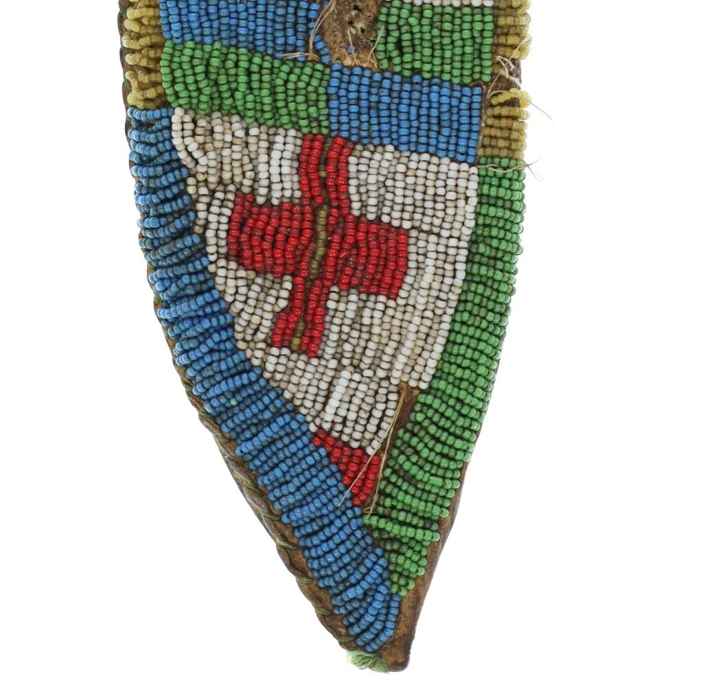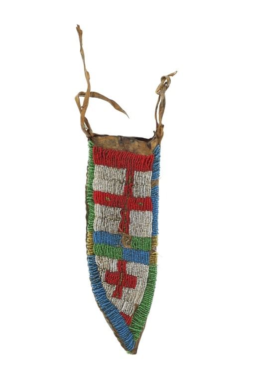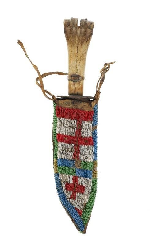 The lot features a Northern Plains beaded sheath and forged large bowie knife with Buffalo bone handle. The sheath appears to be of an older age and shows an Indian tanned Buffalo Bison hide with slight parfleche stiffness covered in glass trade seed beads showing a geometric design. The sheath has some bead loss an shows colors of greasy yellow, medium green, chalk white, red and medium blue. The knife shows a large wide bowie knife blade which is blacksmith hand-forged showing a hammerred finish on both sides. The knife has a brass hilt guard with hidden tang and a Great American Bison Buffalo bone handle with copper rivet and rawhide strap wrapped around. The bone shows a dark nice yellow patina and a crazing that shows age. Unique and attractive setup. The sheath itself measures 10"L by 3 3/8"W. The knife is 15.25"L with the blade being 9.5"L by 2 7/8"W.