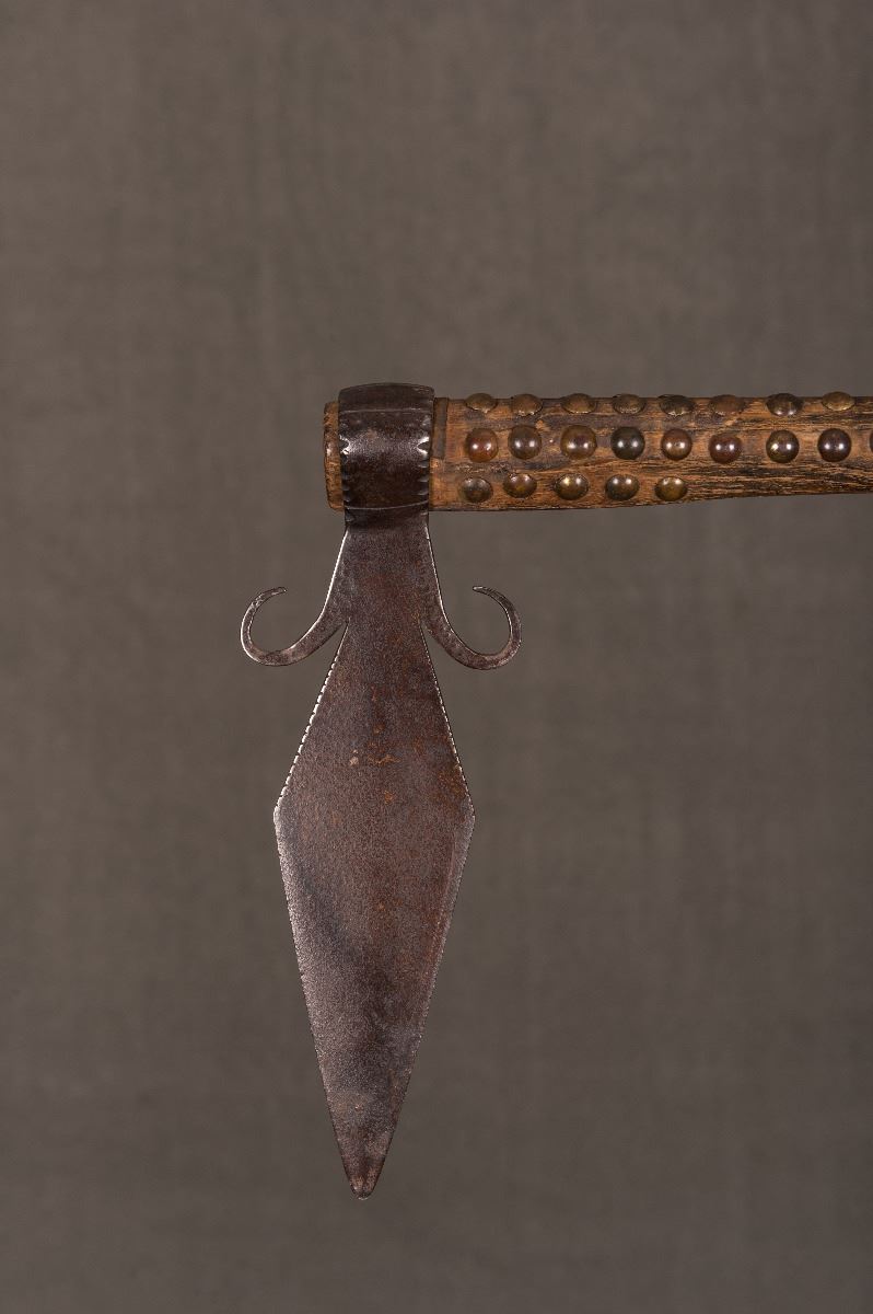 Northern Plains Spontoon War Tomahawk. 43 ½" overall including a 22 ½" quilled drop terminating in fringe. Forged spontoon blade is 9 ½" long featuring upward curls, pouch dot decorations and a tapering blade. Haft is nicely decorated with brass tacks. Quilled drop was likely added later, but is still very old. Circa 1850s.