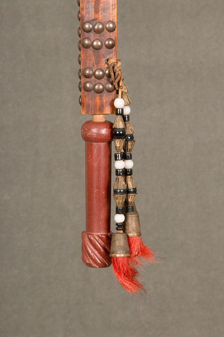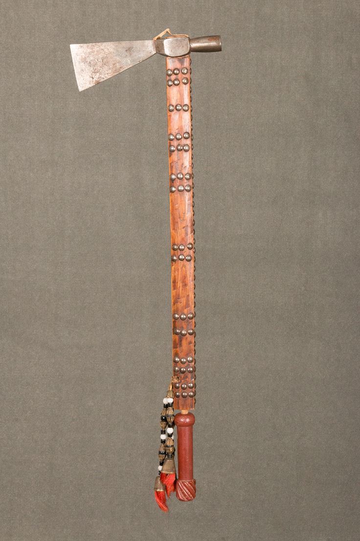 23" haft with 7 ¼" iron head. Fine, file burned haft with lots of original tacks. Interesting trade bead drop and catlinite mouthpiece. Three drops are decorated with beads terminating in thimbles, stuffed with dyed red horsehair. Late 19th century.