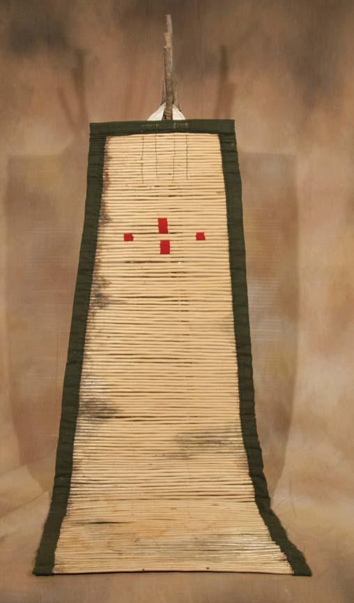 Northern Plains Teepee Backrest. 60" tall, 28" wide tapering to 16", 52" poles. Typical willow slats with cloth border. Early 20th century (newer poles). (est $500-700). For condition reports please visit: www.auctioninsantafe.com/cr2011.pdf