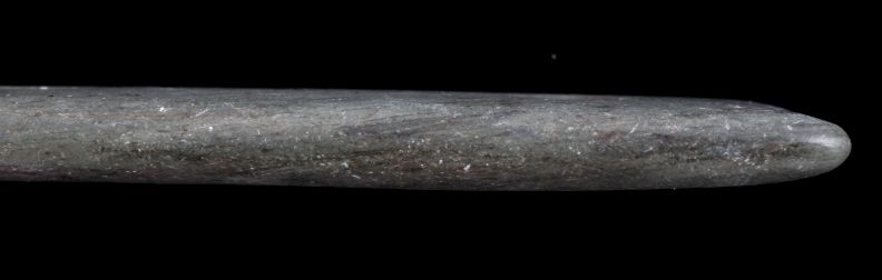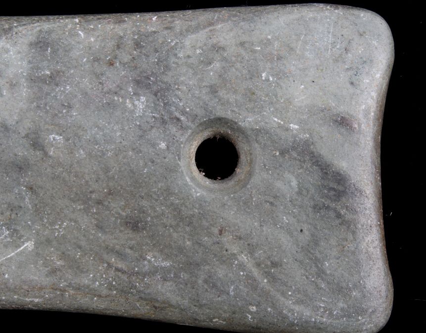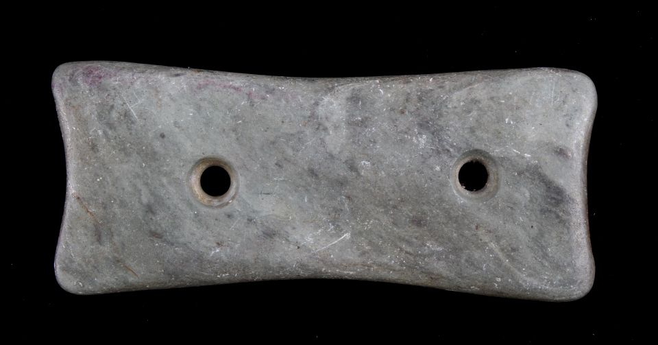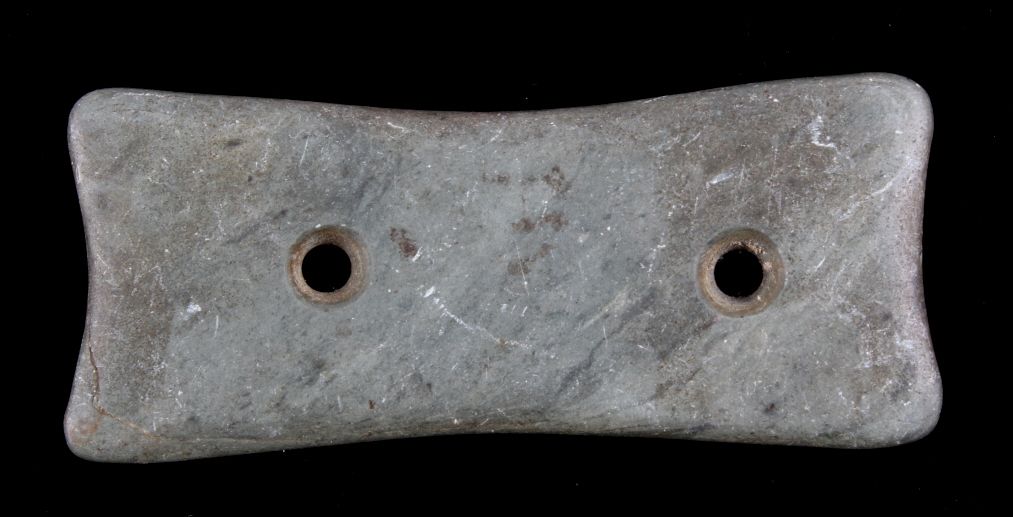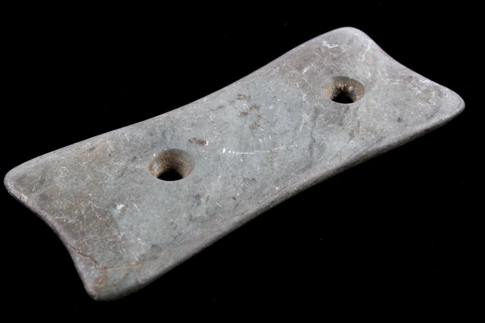 This is a hand created early original Northern Plains Native American Indian gorget. The piece shows good condition. The artifact shows two holes and measures 3 7/8"x1 3/4"