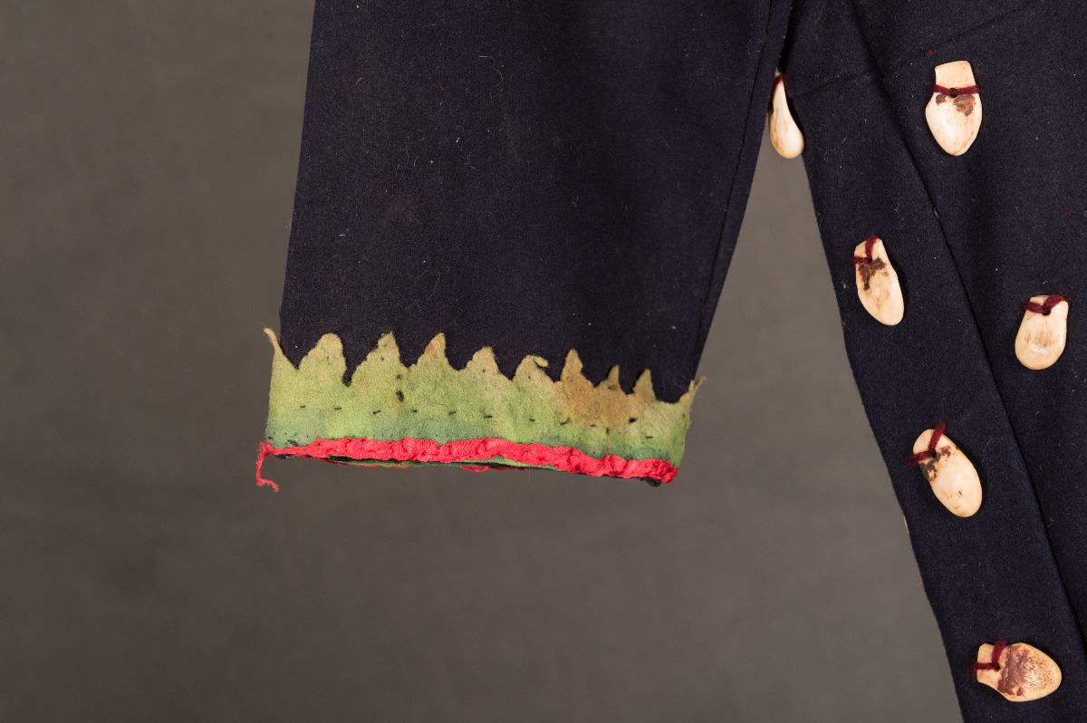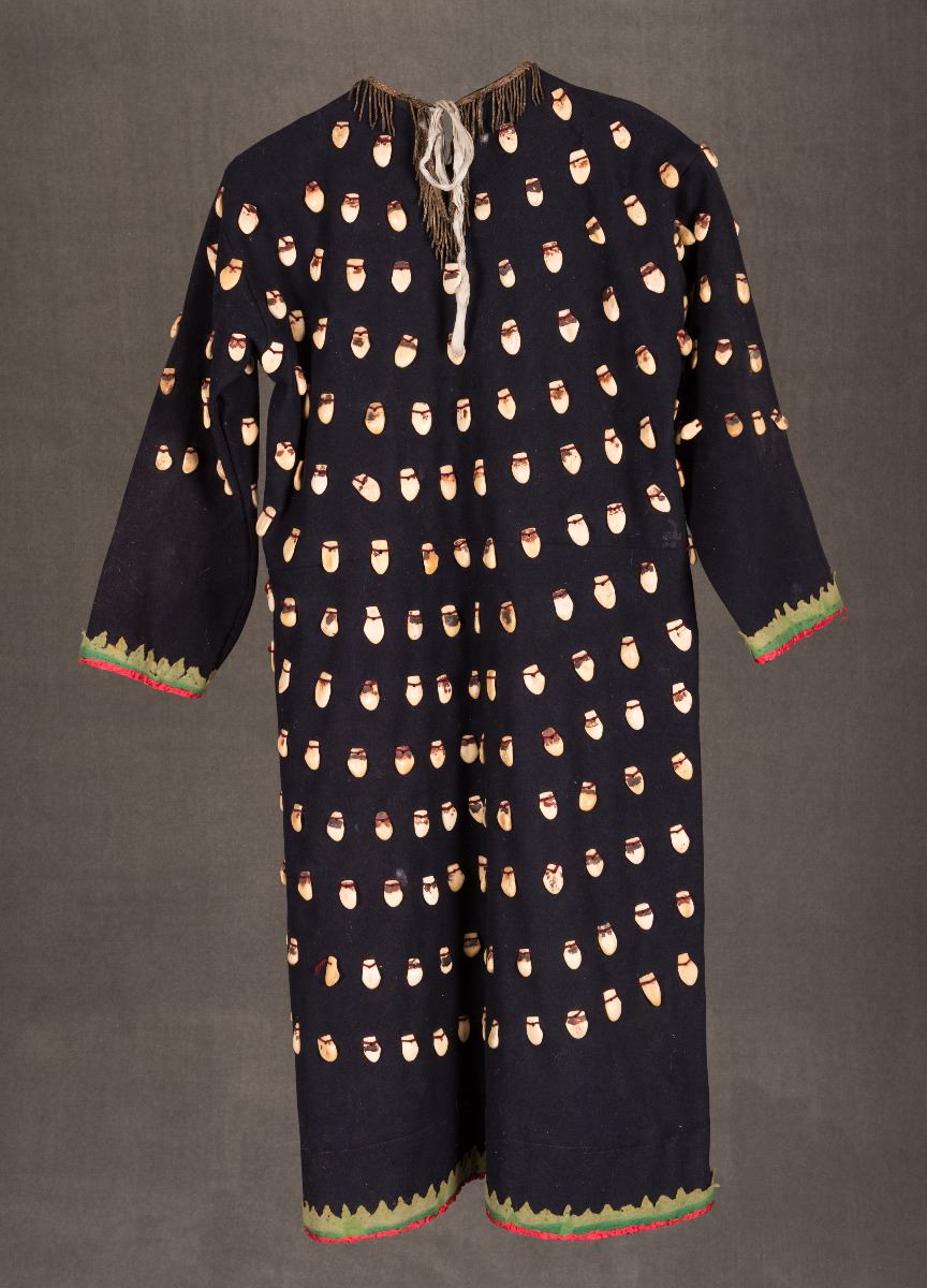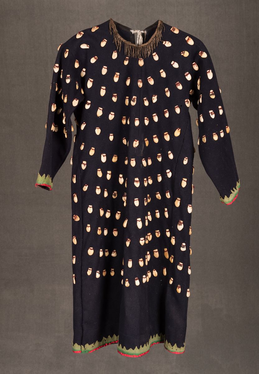 Northern Plains Woman's Elk Tooth Dress. 42" long x 18" wide. Covered with some carved and some natural elk's teeth. Decorated with metallic fringe, silk and wool. 19th century.
