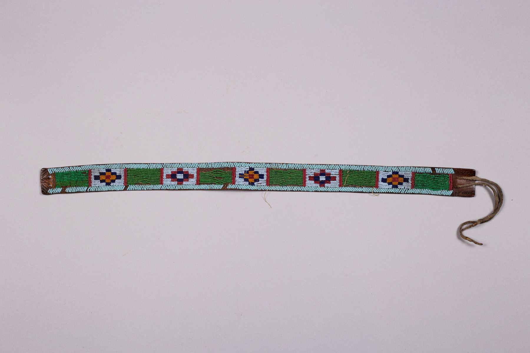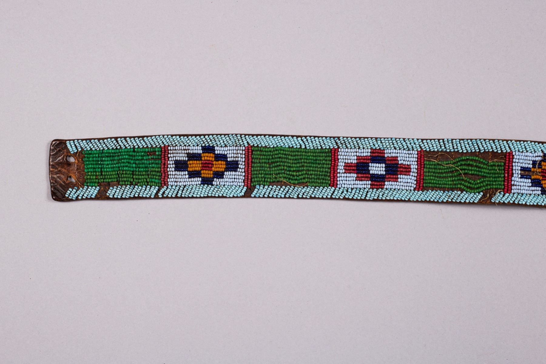 Northern Plains beaded hat band. Constructed from an old commercial leather belt with beaded panels and geometric designs, sinew sewn.