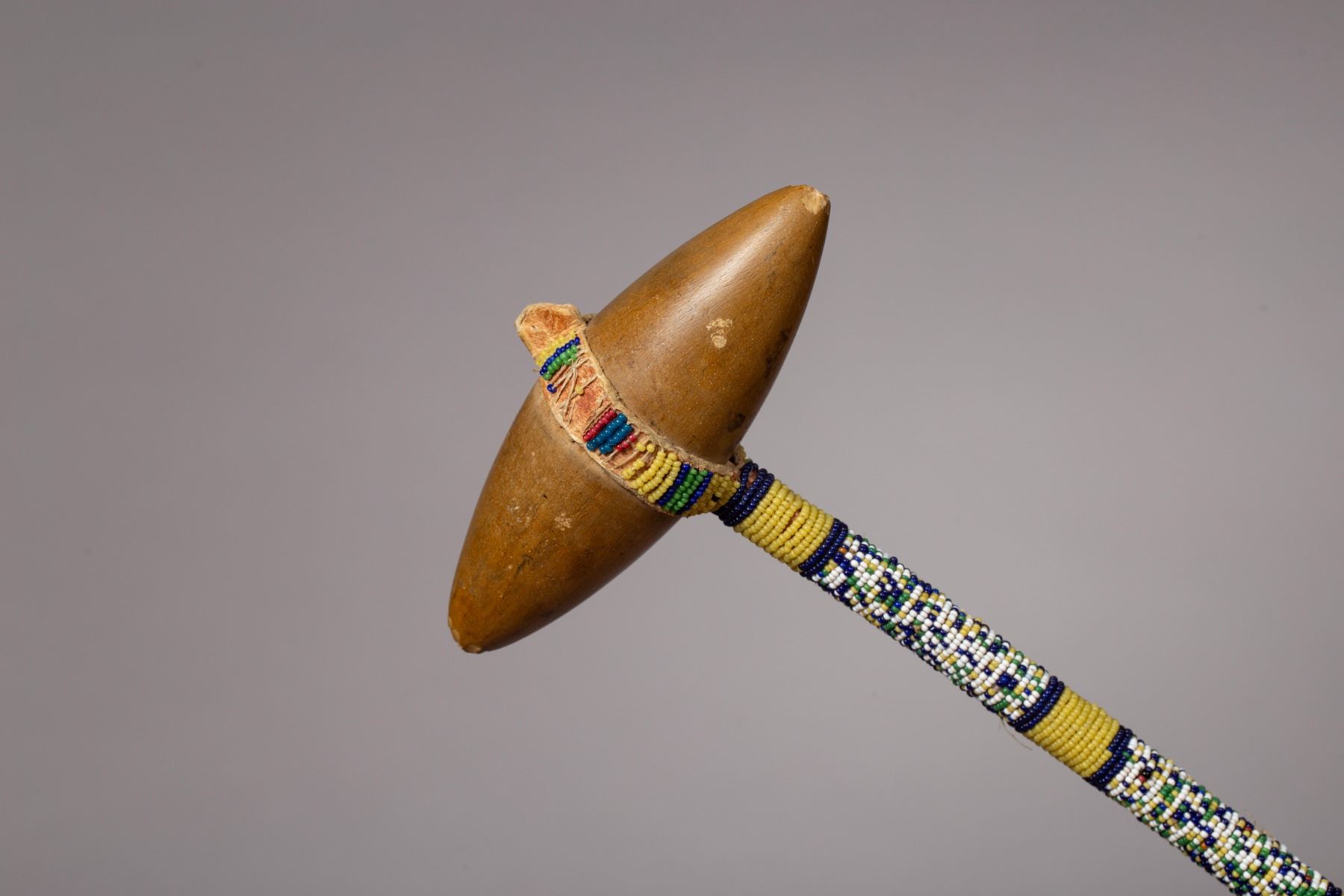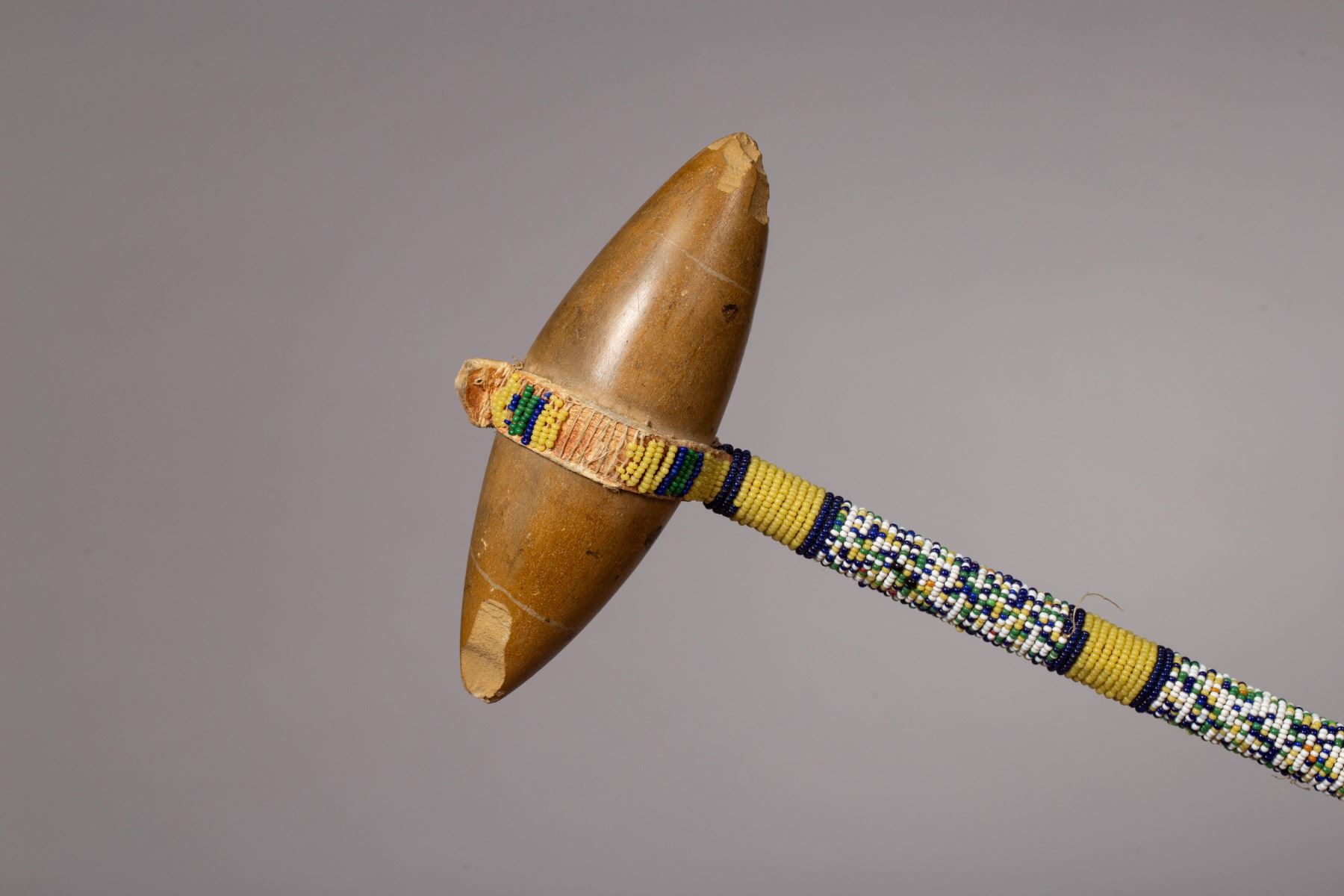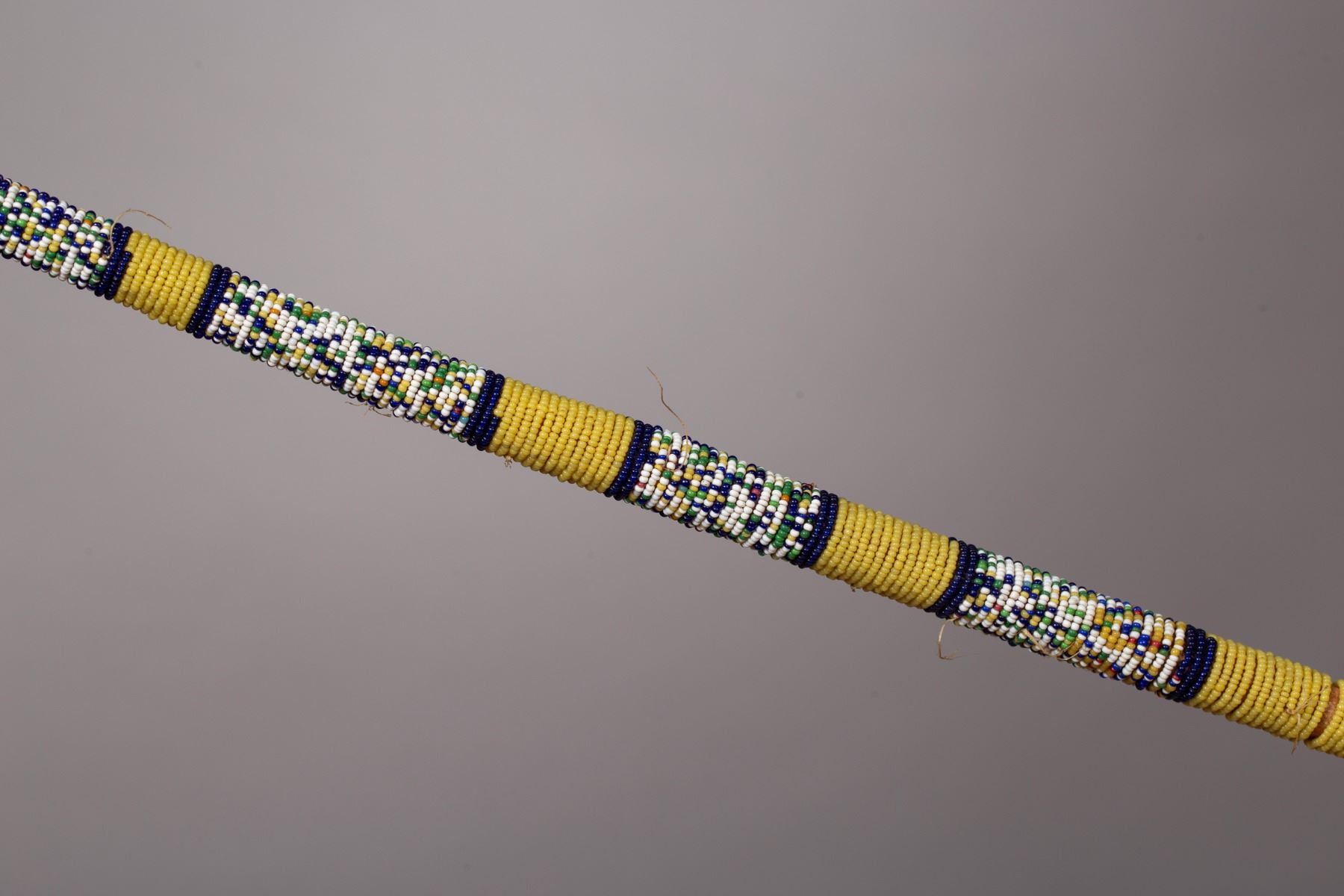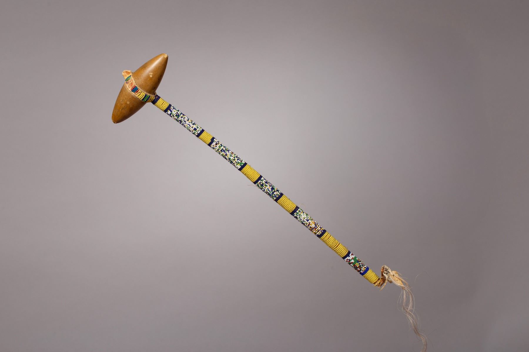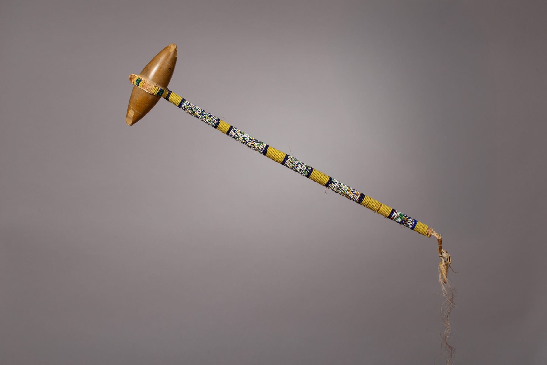 Northern Plains Skull Cracker Club features a bi-point stone head connected by a beaded parfleche strip, fully beaded in greasy yellow bands and multi color glass seed beads, sinew sewn with horse hair drop. Condition: Minor bead loss on strap and horsehair. Ca 1890s