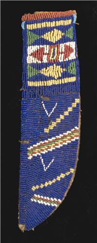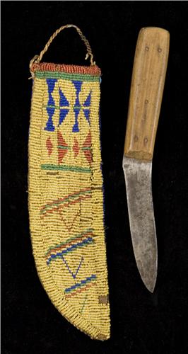 Northern Plains Fully Beaded Knife Case. J. Russell & Co. Green River Knife. 9 1/2" long. Greasy yellow beads on one side. Cobalt blue on the other side. Stair-step designs. 19th century. (est $2,500-3,500)