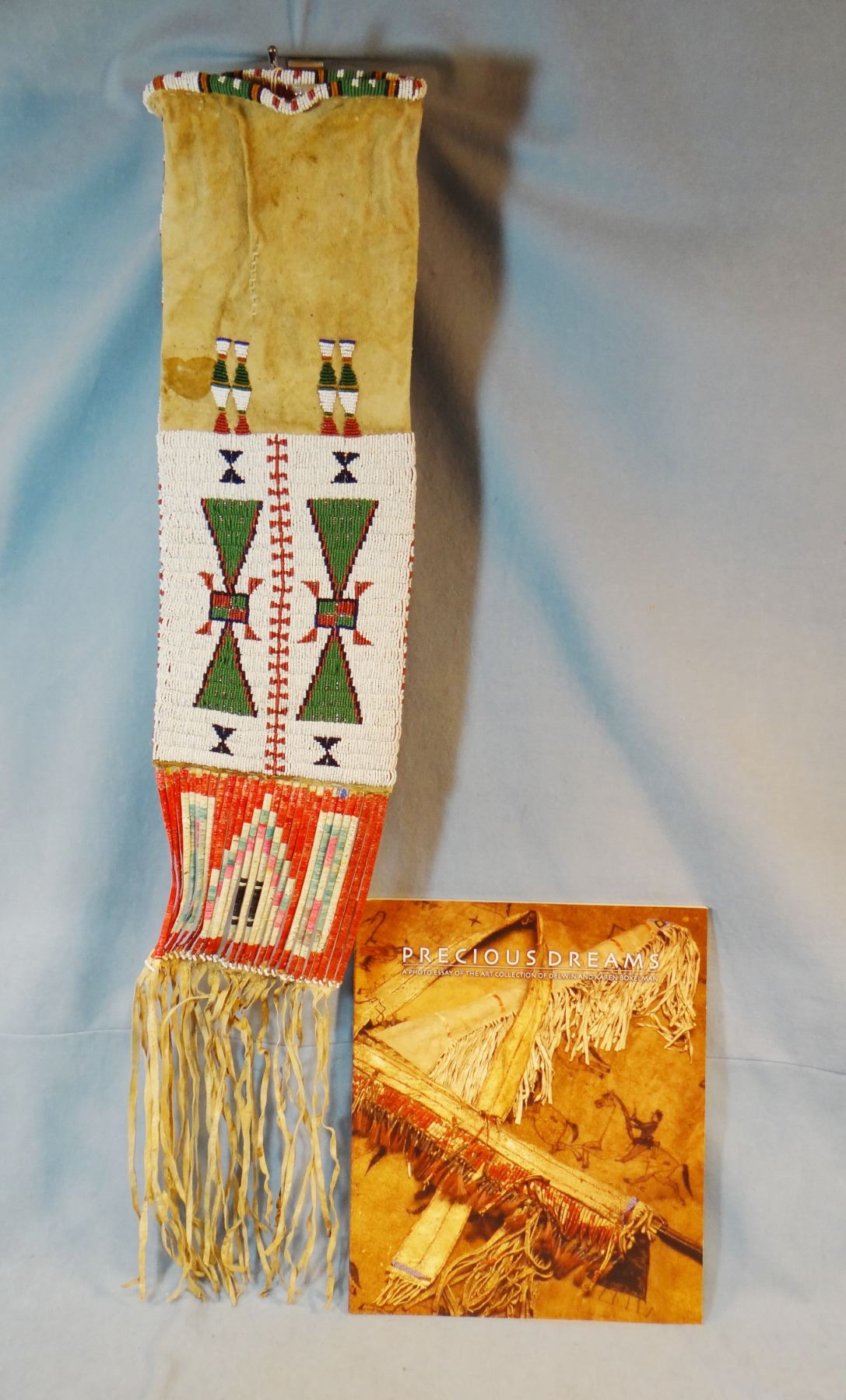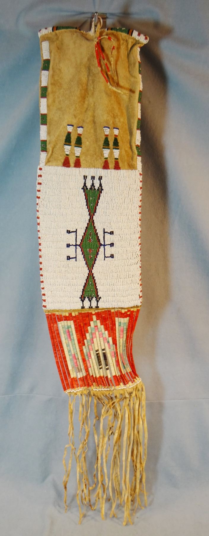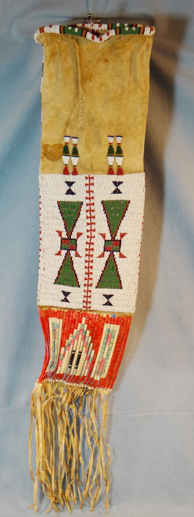 Northern Plains full beaded pipe bag, late 19th Century, beaded and quilled, seed beads, lazy stitched, 10" x 7" beaded panels, 6" x 7" quilled panels, 12" leather tassels, small repair at top, overall length 36" x 7" w
