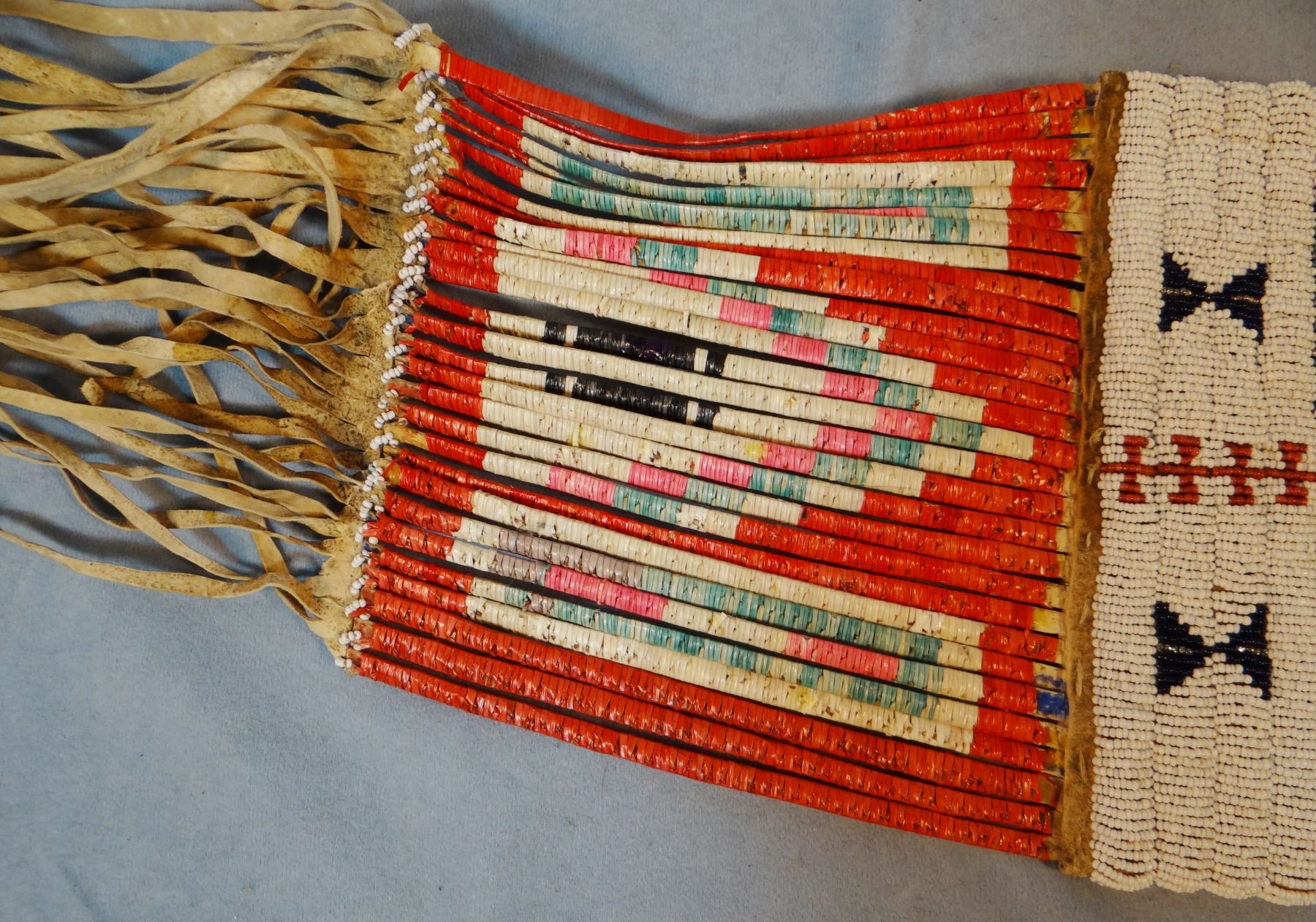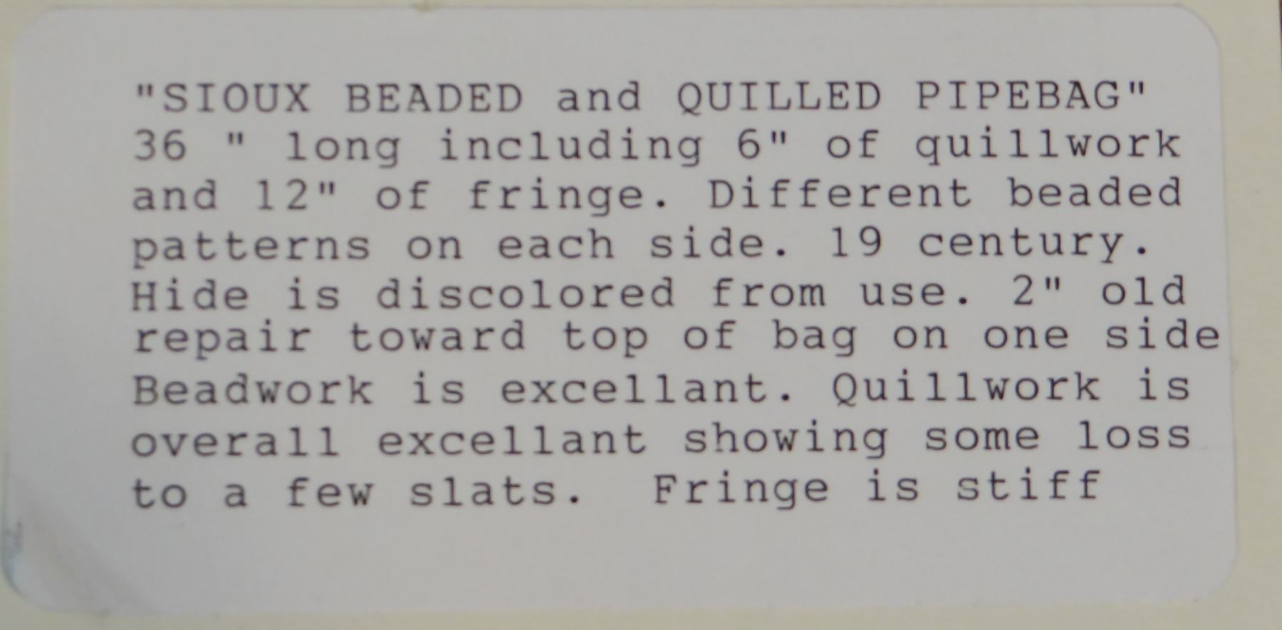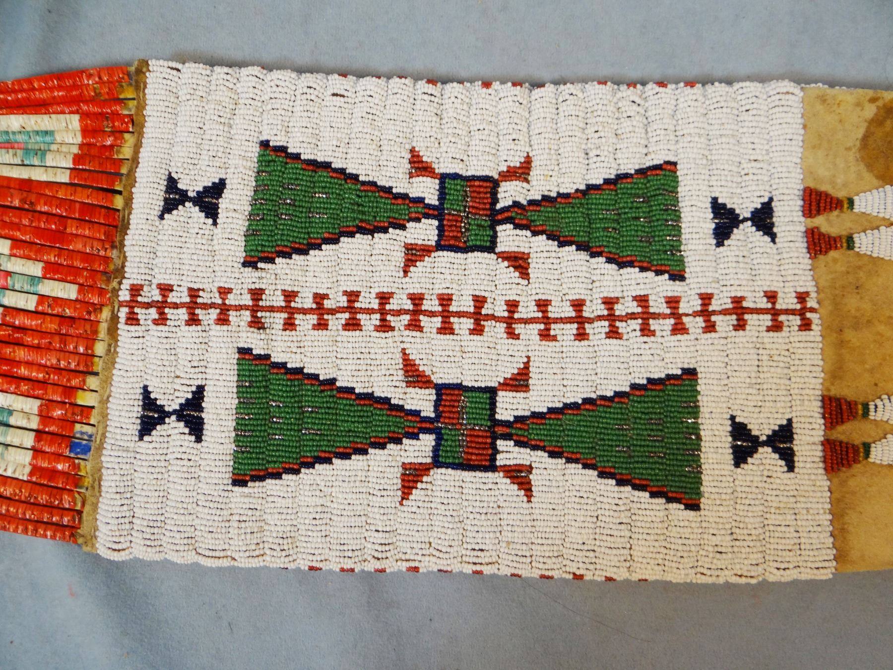 Northern Plains full beaded pipe bag, late 19th Century, beaded and quilled, seed beads, lazy stitched, 10" x 7" beaded panels, 6" x 7" quilled panels, 12" leather tassels, small repair at top, overall length 36" x 7" w