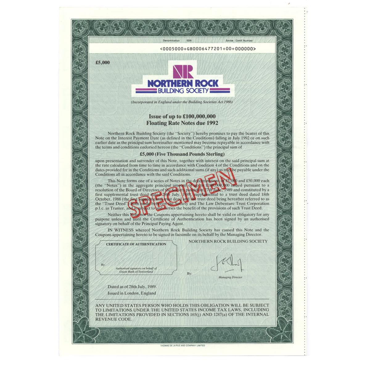1989. England. SPECIMEN. 5,000 Pound floating rate note. The Northern Rock Building Society, became the Northern Rock Bank in 1997 when the society floated shares on the London Stock Exchange. In February of 2008, the bank was nationalized as a result of liquidty and credit problems brought about by lossess in sub-prime lending. Uncancelle and AU.