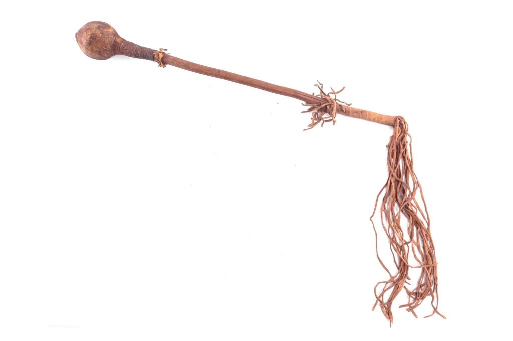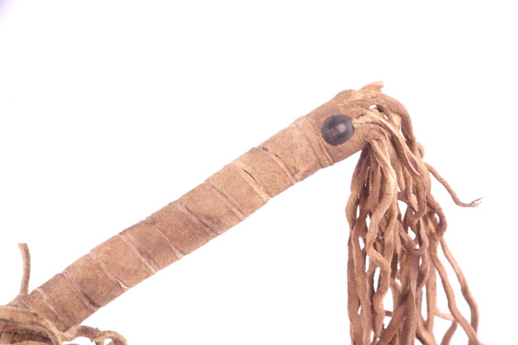 This is a terrific Southern Plains stone head war club attributed to the Comanche in Northern Texas from circa 1870’s. The piece is comprised of a large stone head wrapped and secured in thick wetted and stretched rawhide parfleche hide, sewn with sinew and thick thread. The crude haft was made from a tree branch that was cut and carved smooth. There is a small wrap of fringe at the top, old brass trade tacks, and long frilly fringe Indian tanned hide drop at the bottom. Provenance: From the ex-collection of Dale Harrison out of Ohio. The head measures 3 inches wide; the haft length not including the fringe measures 20 inches.