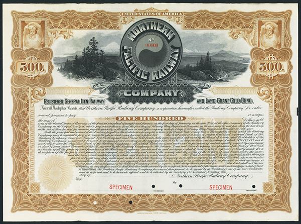 1897, $500, 3% Registered General Lien Railway and Land Grant Specimen Bond, Black on brown border and underprint, Vignette of forests and mountains flanking company logo top center, POC's, VF condition with some creases from folding, ABNC.