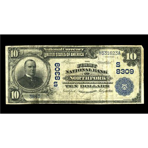 <B>Northfork, WV</B></I> - $10 1902 Date Back Fr. 618 <B>The First NB </B></I> Ch. # (S)8309<BR>This <B>Fine-Very Fine</B></I> note currently resides in the Kelly census along with another of its type where only seven large are known. The example still retains some embossing and is still crisp with a corner tip missing at upper right and some light staining on the face.