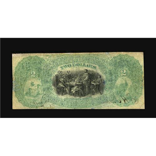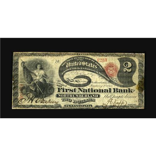 <B>Northumberland, PA</B></I> - $2 Original Fr. 387 <B>The First NB</B></I> Ch. # 566<BR>This <B>Fine</B></I> Lazy Two is one of just four traced from here. This bank was in business for just 12 years before closing its doors in 1876 after issuing the Original and 1875 Series notes only. Just $1,258 of its issue was still in the hands of the public when the end came. We do note that there are a few repairs and reinforcements about the margins and that the back has faded somewhat. The face, however, appears much nicer and the original black ink signatures remain very strong. With the supply of this type and denomination well below the level of marketplace demand, we expect that prices will continue to escalate.<BR><BR><b>Shipping:</b> Coin/Currency (<a target="_blank" href="http://www.heritageauctions.com/common/shipping.php">view shipping information</a>)